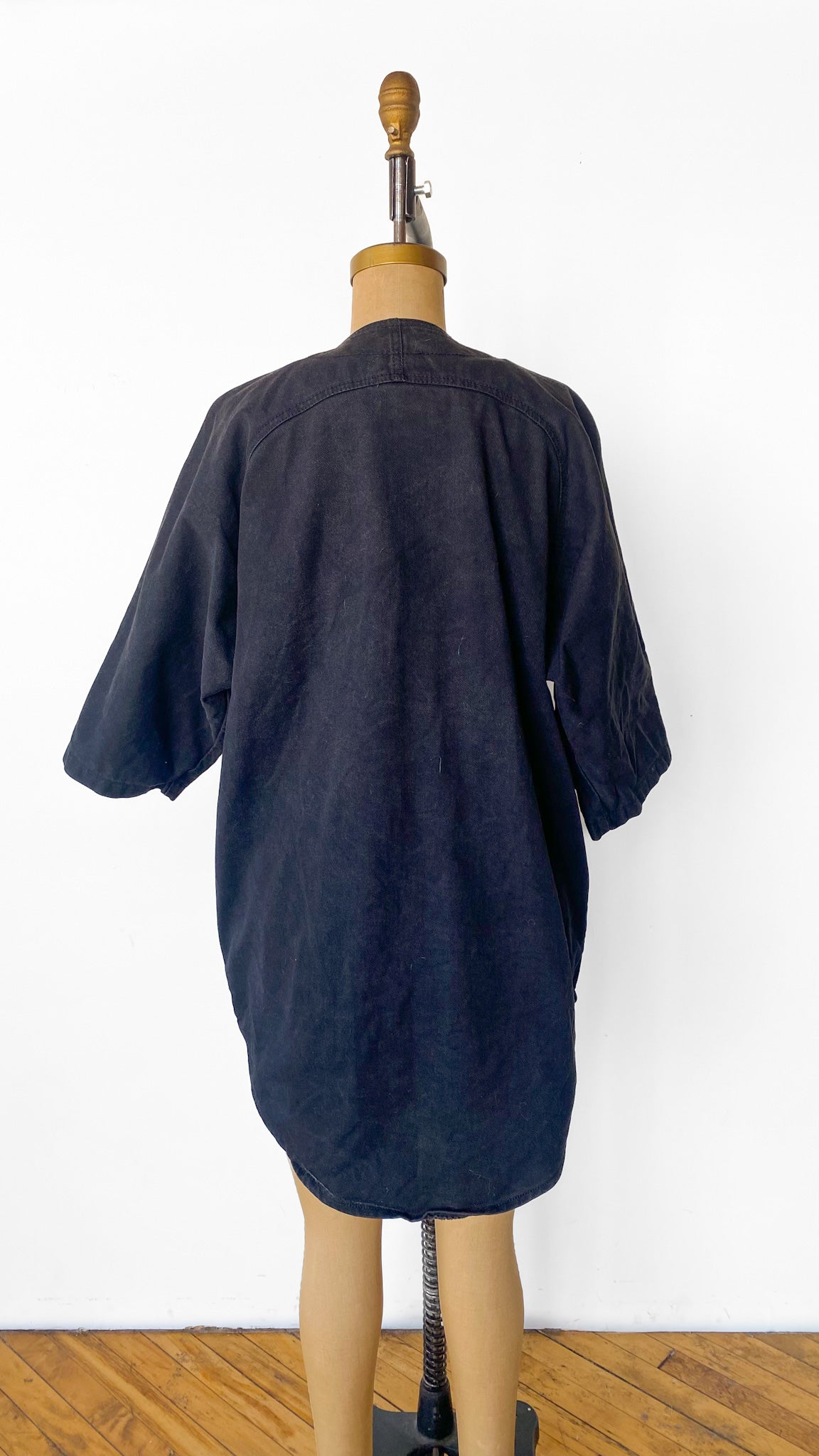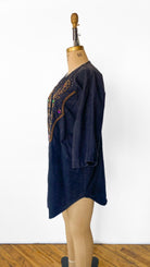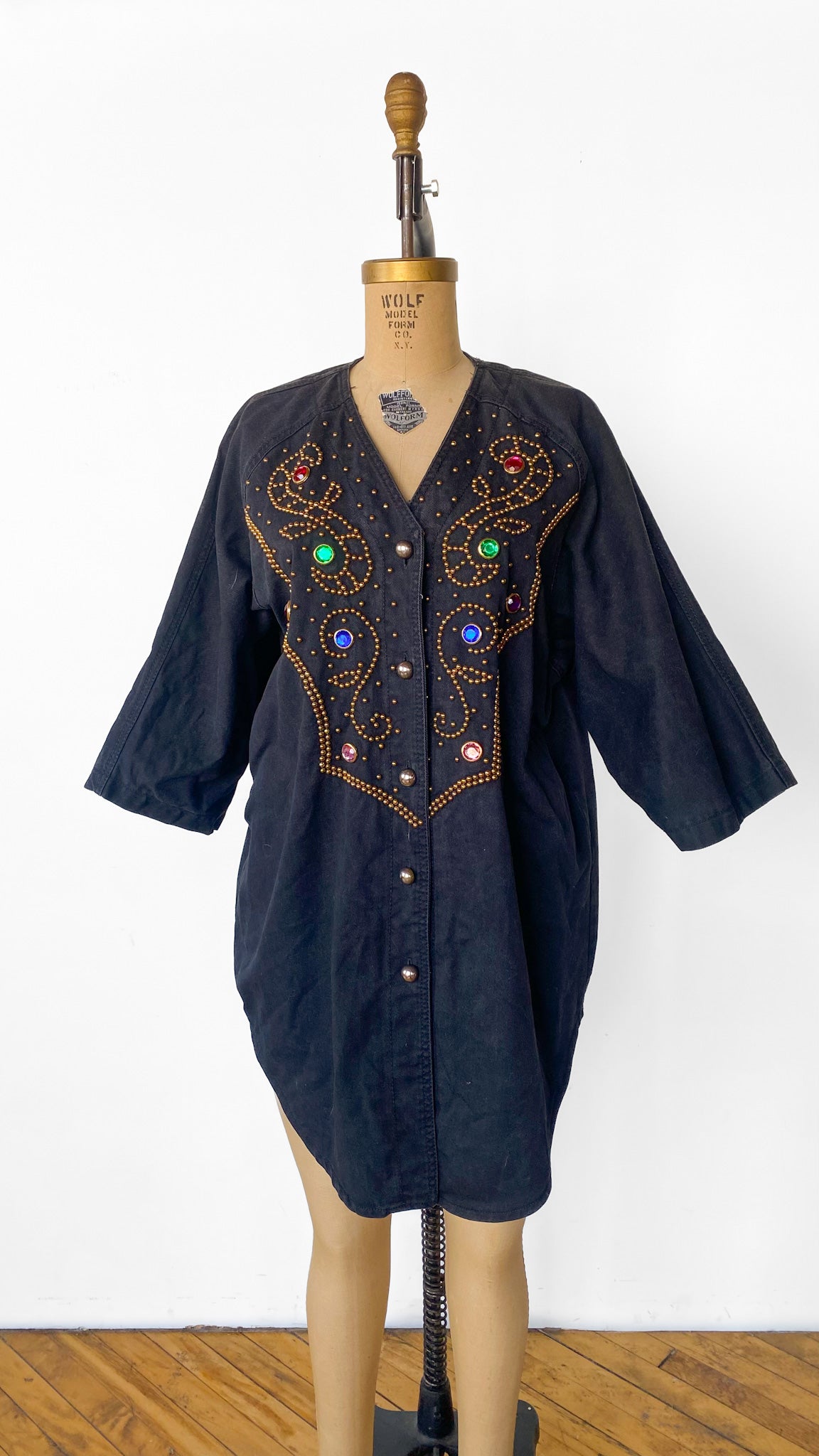 Black denim V-neck button up shirt with gold studding and large multi-colored rhinestones, short batwing sleeves. Curved hemline.
