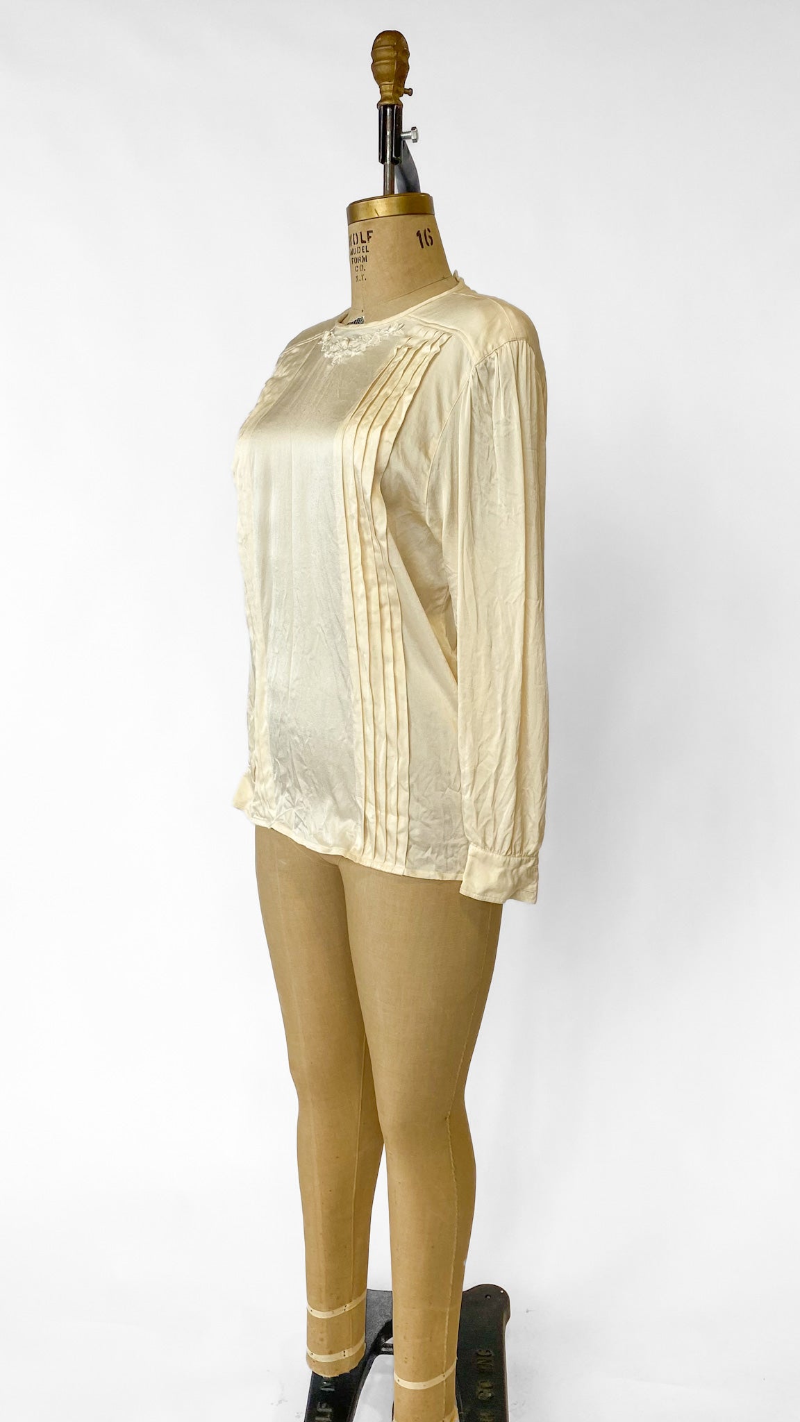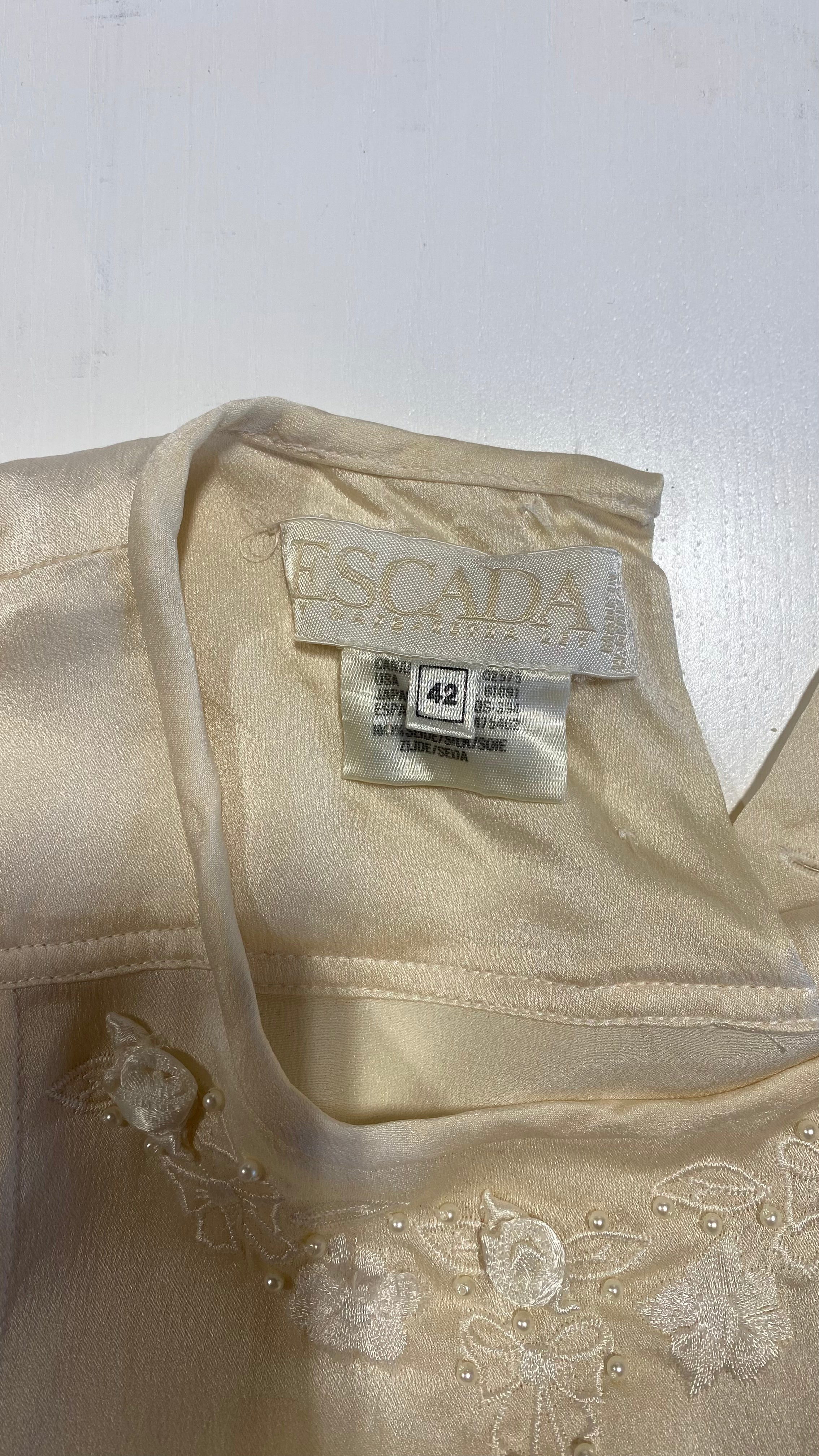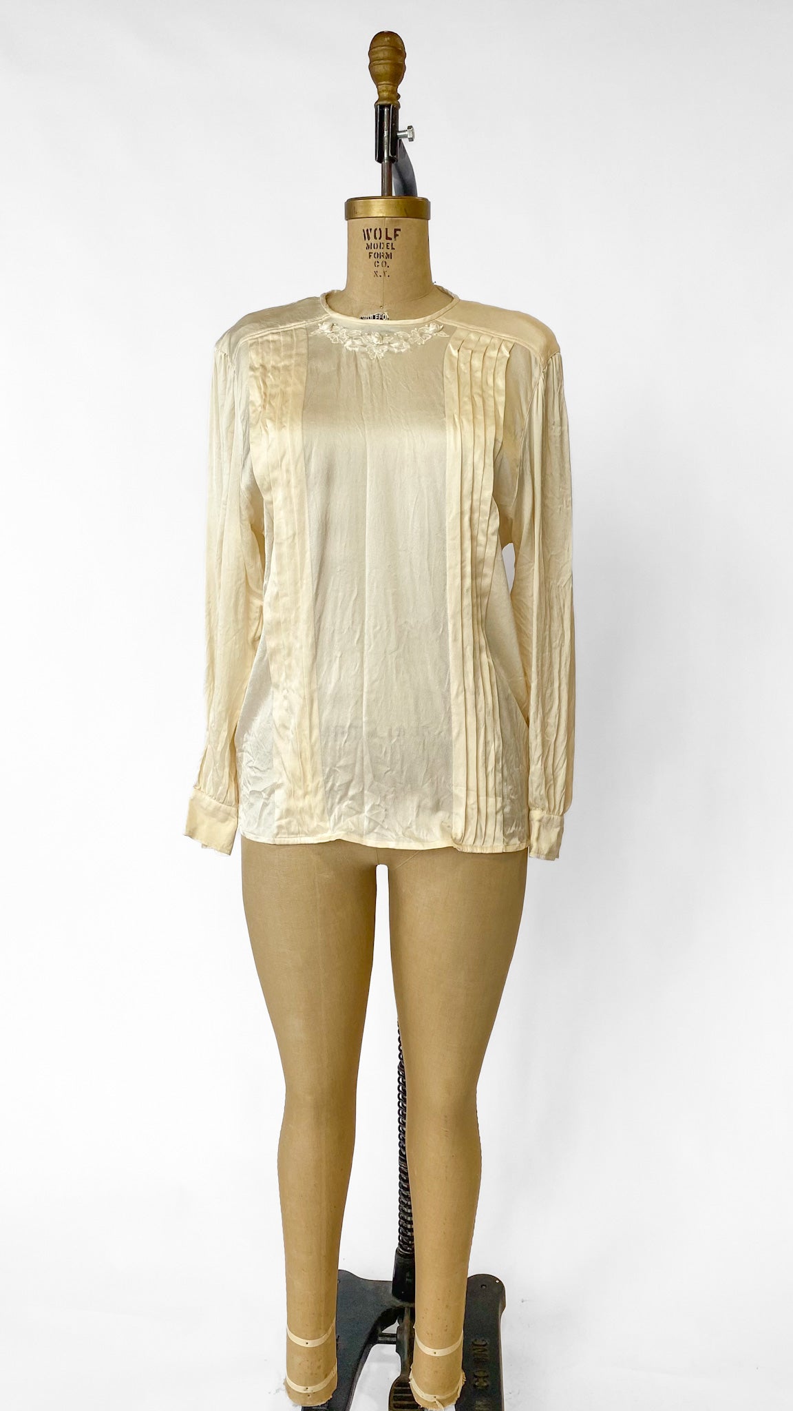 Ivory silk long sleeved blouse with pleats down the front, floral and bow embroidery around neckline with small faux pearl beads. Two buttons at the back of the neckline.