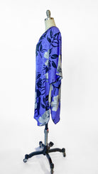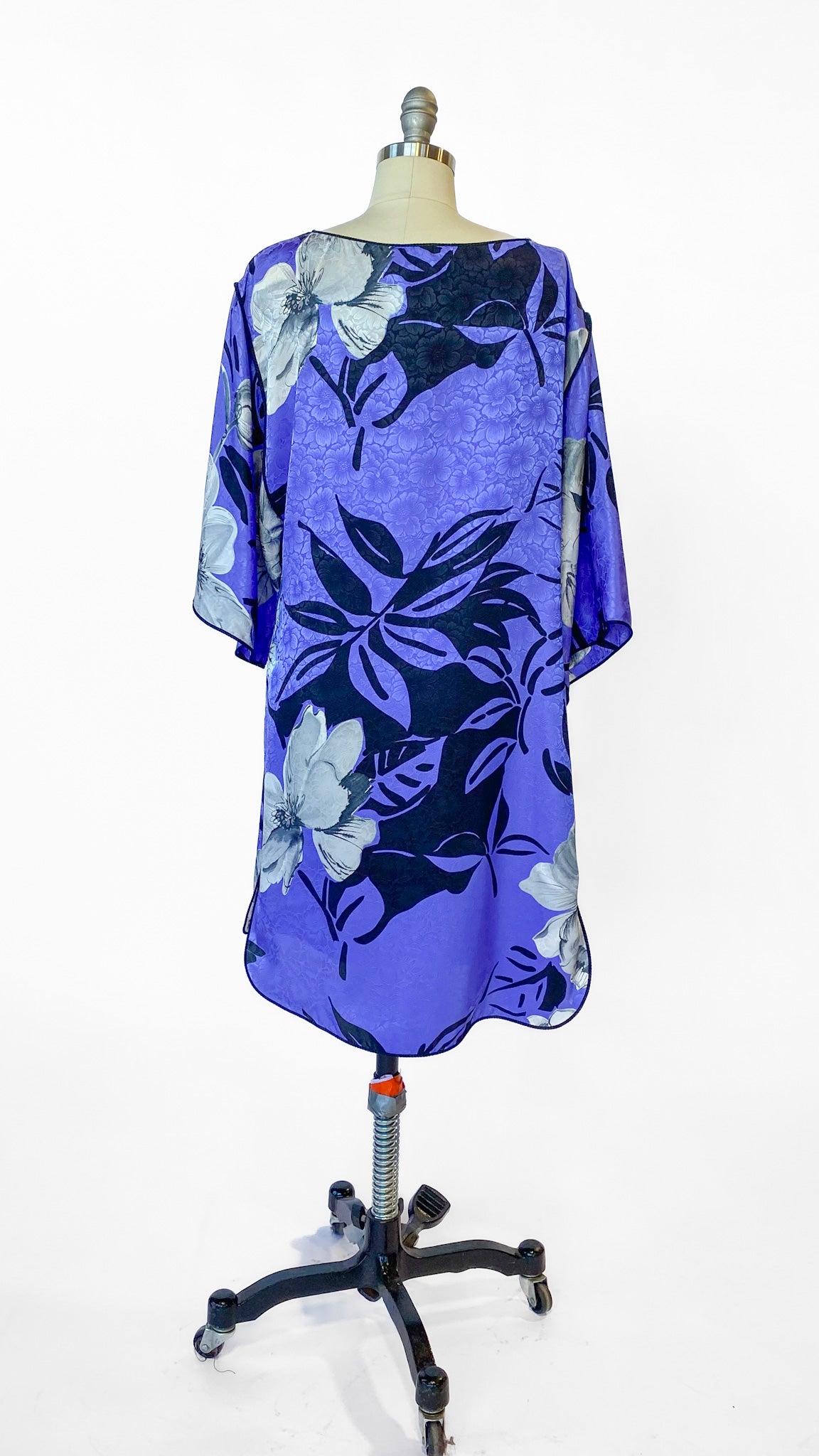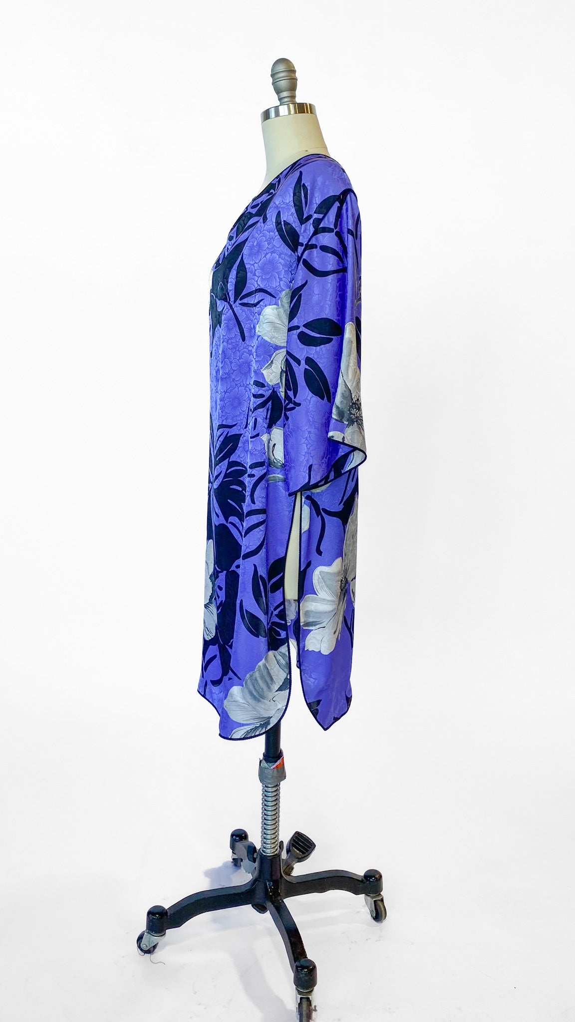 Short sleeve indigo shirt dress with white and black tropical print and floral emboss, long slits in sides, no closures.