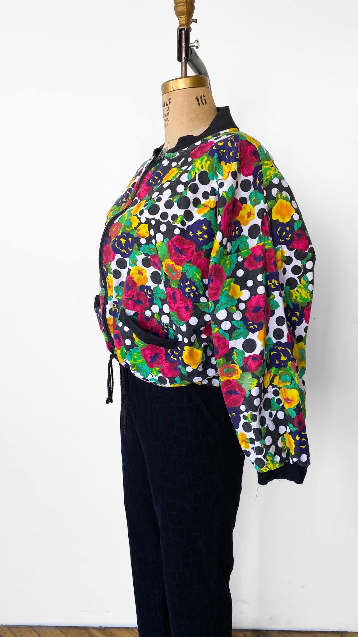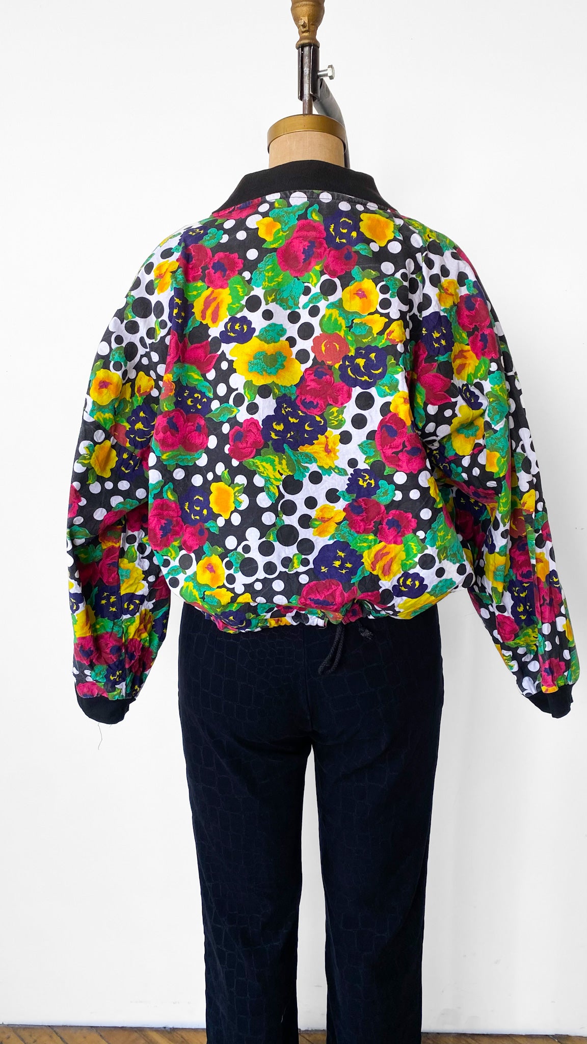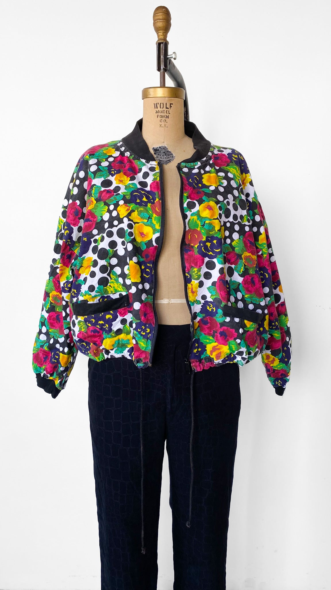 Black and white polka dot bomber jacket with floral pattern, black zipper and collar, drawstring waistband, two pockets. Batwing, shoulderpads.