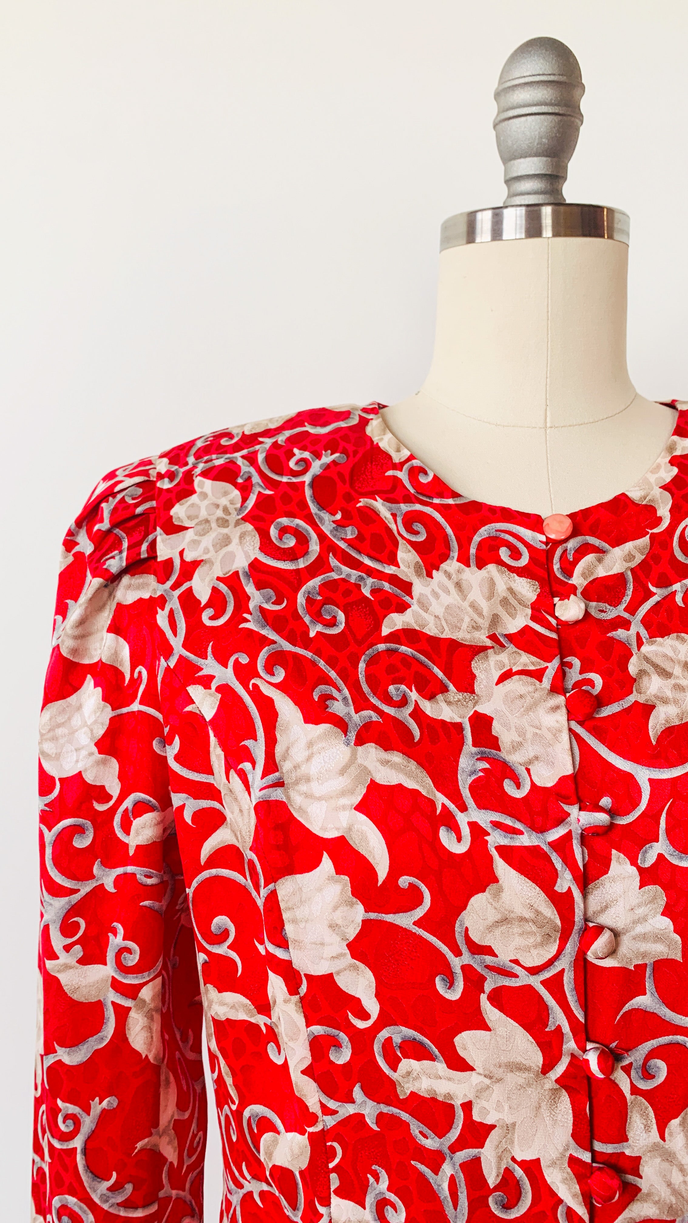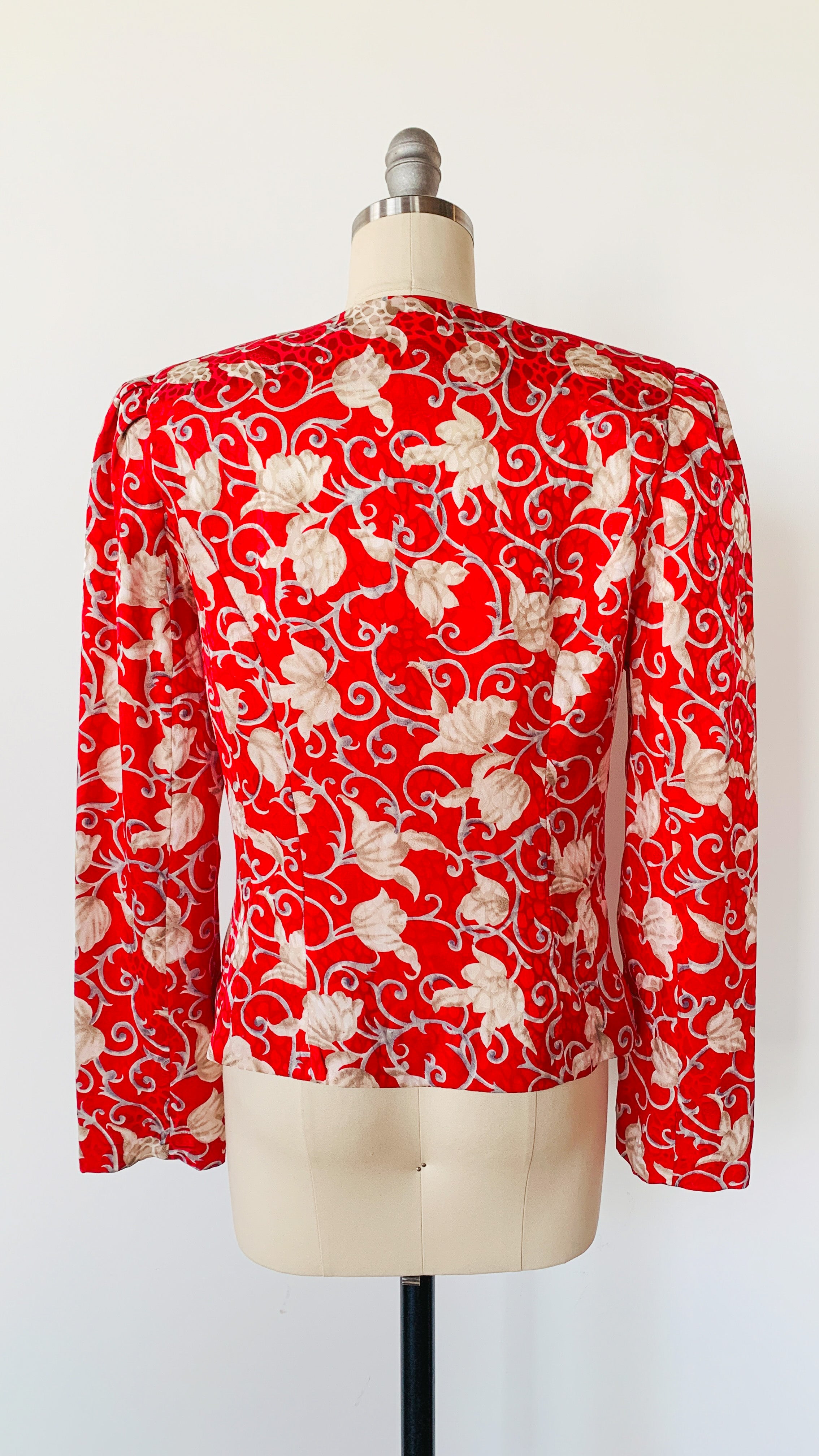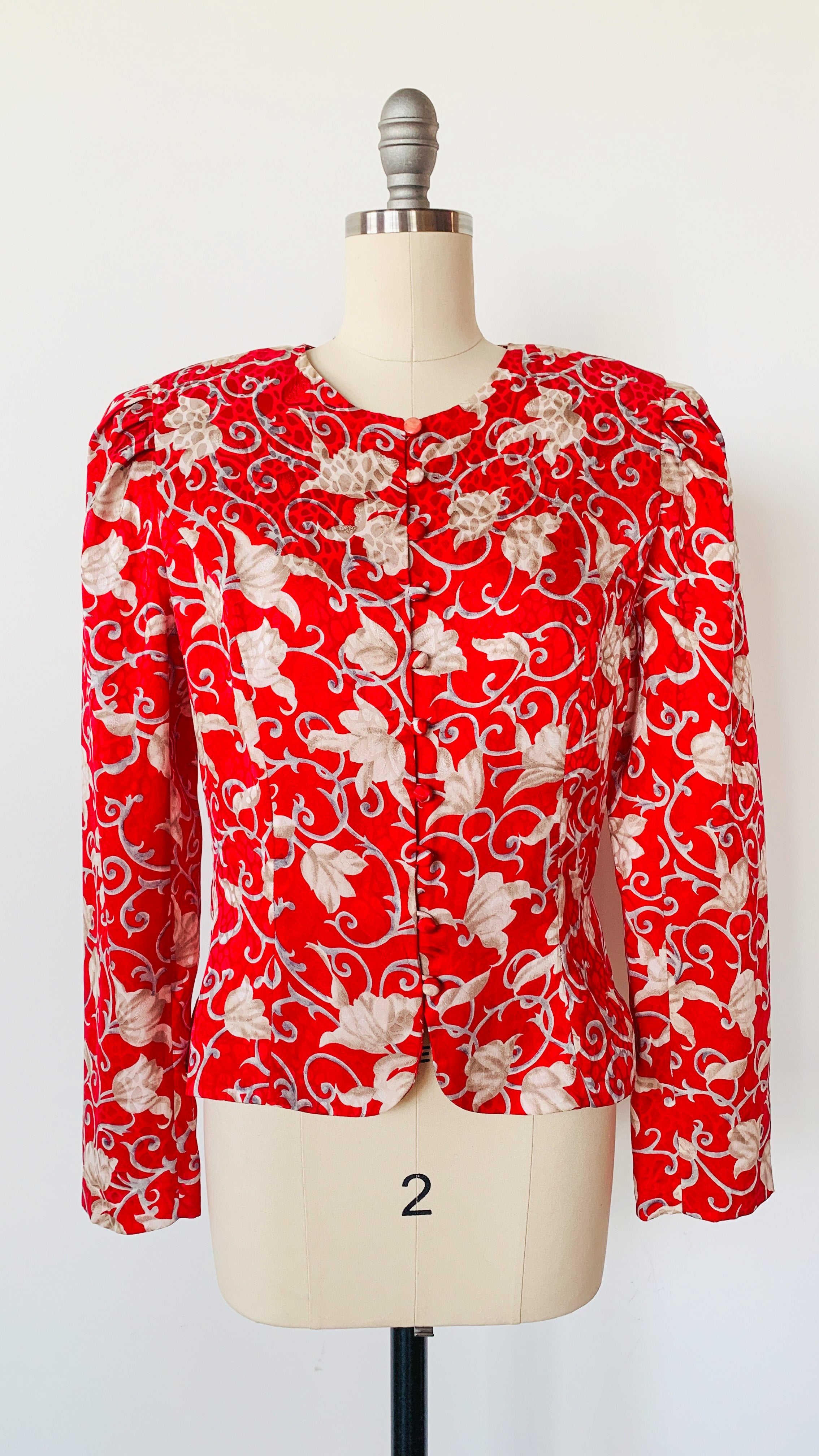 Red and white silk brocade pattern with pleated power shoulders. Super flattering, tailored fit. Loop button closures in front.