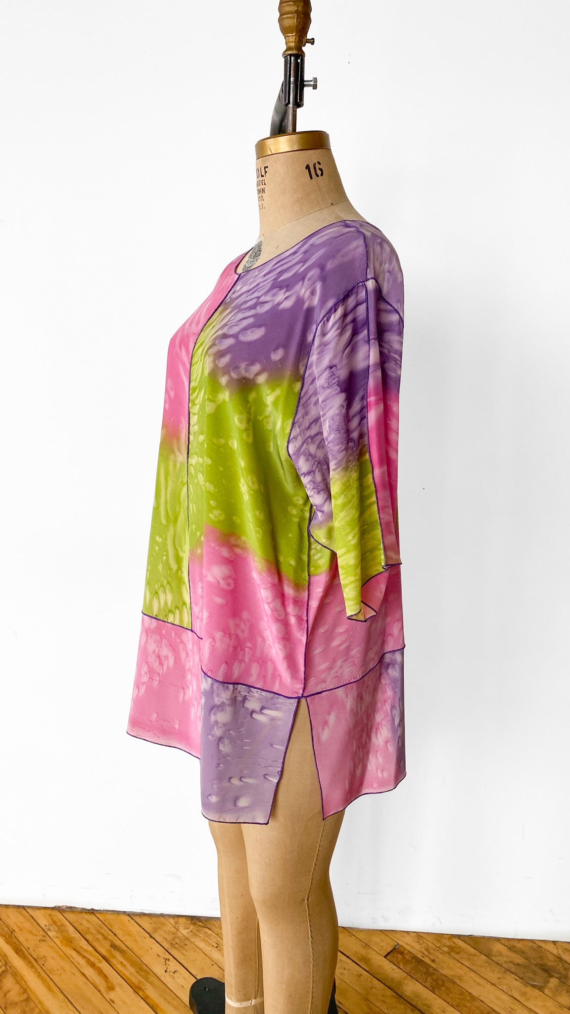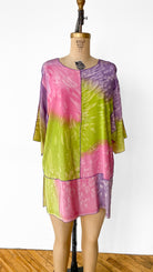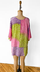 Pink, purple, and green short sleeved, trapeze shaped, dyed silk shirt with small slits in side seams.