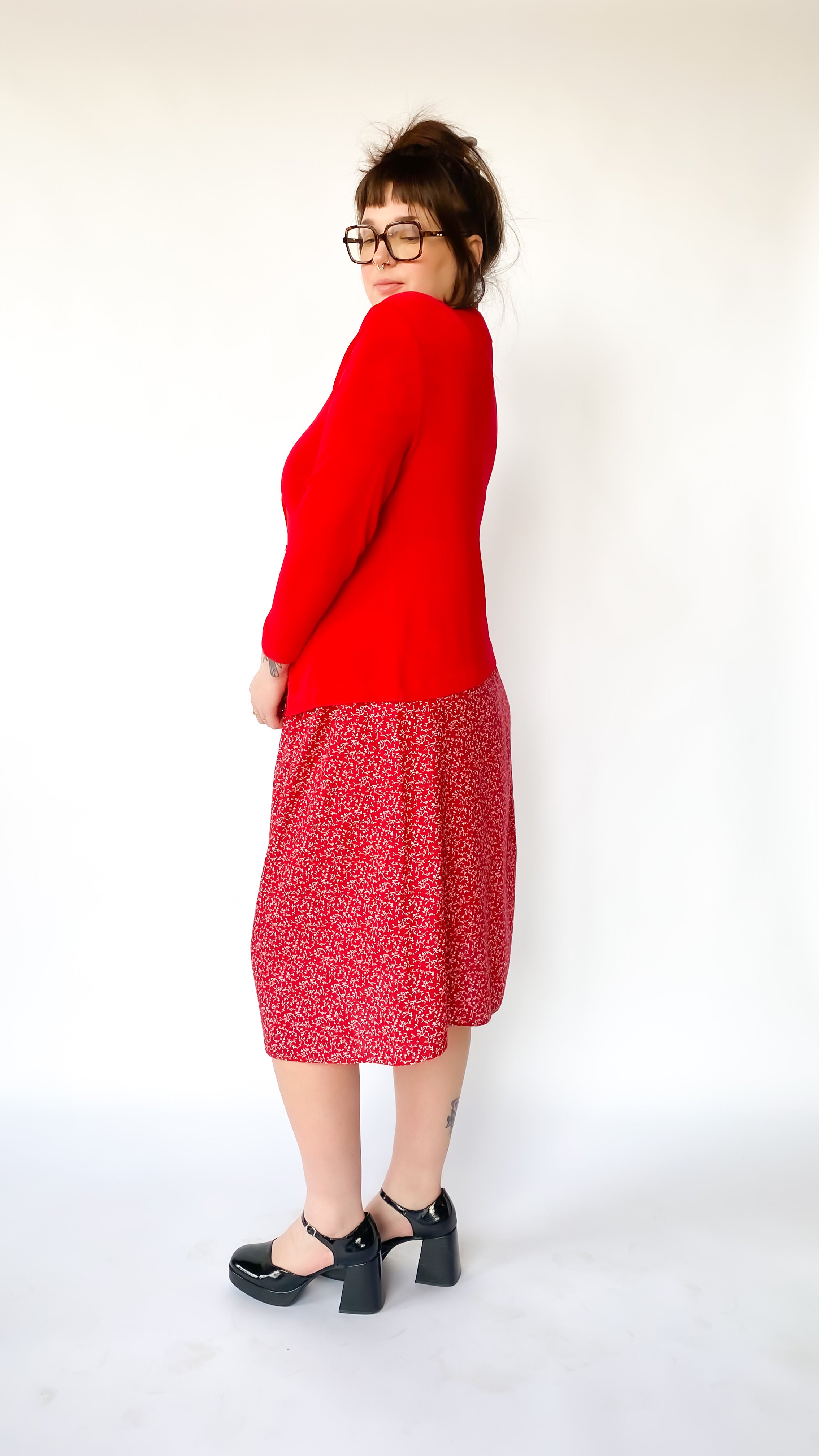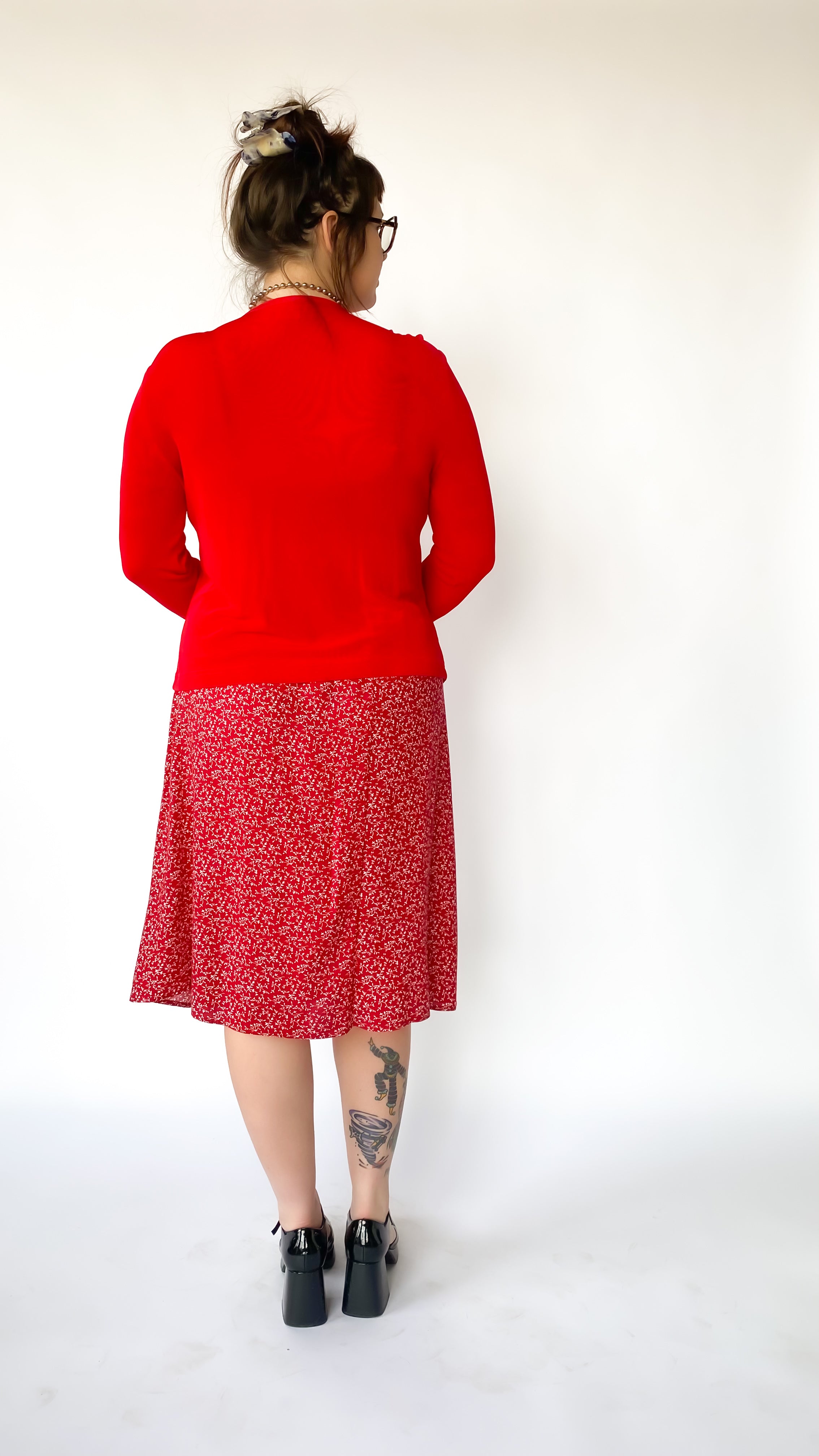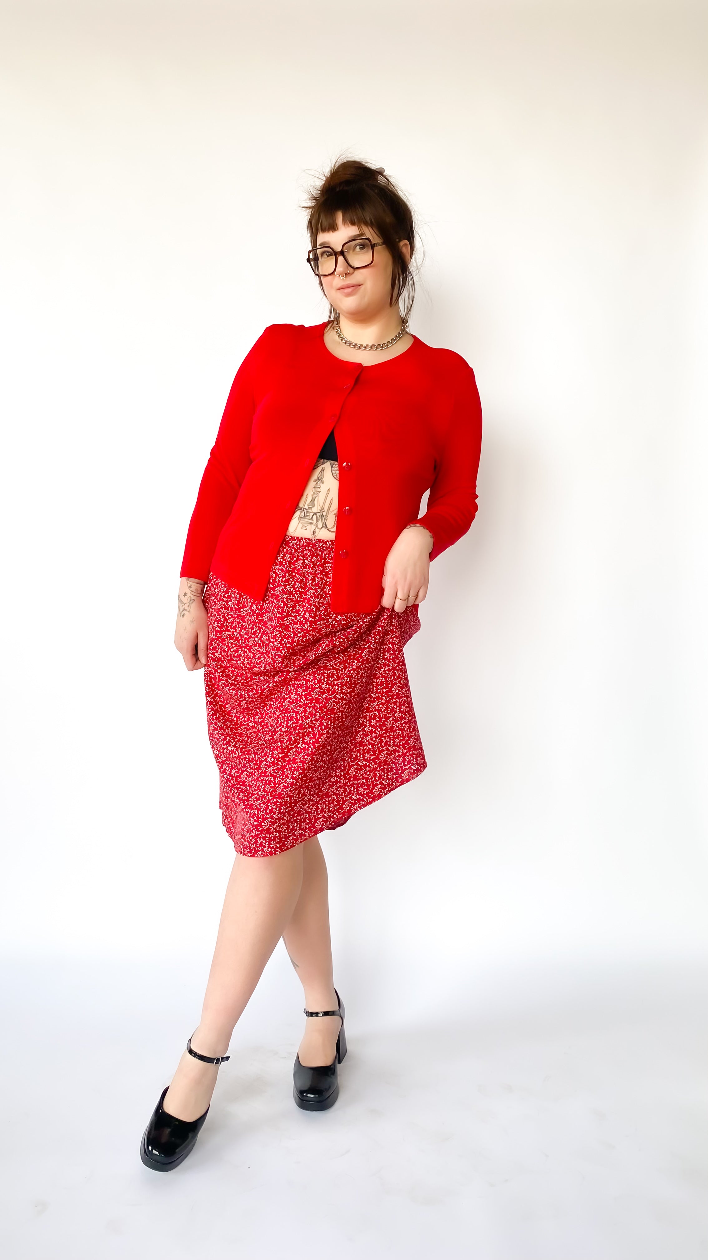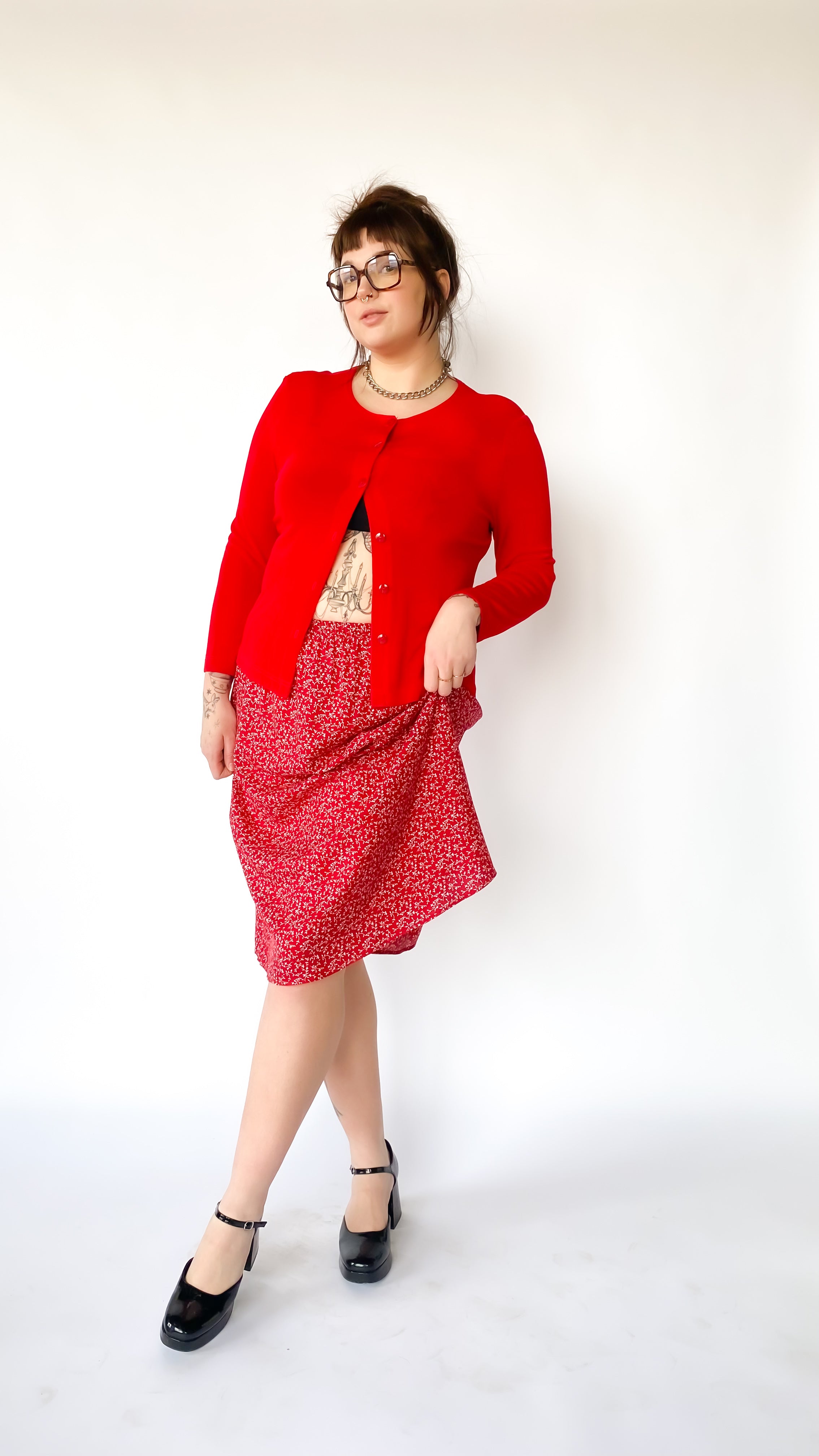 Description: Slinky red cardigan with buttons down center front. Unlined.