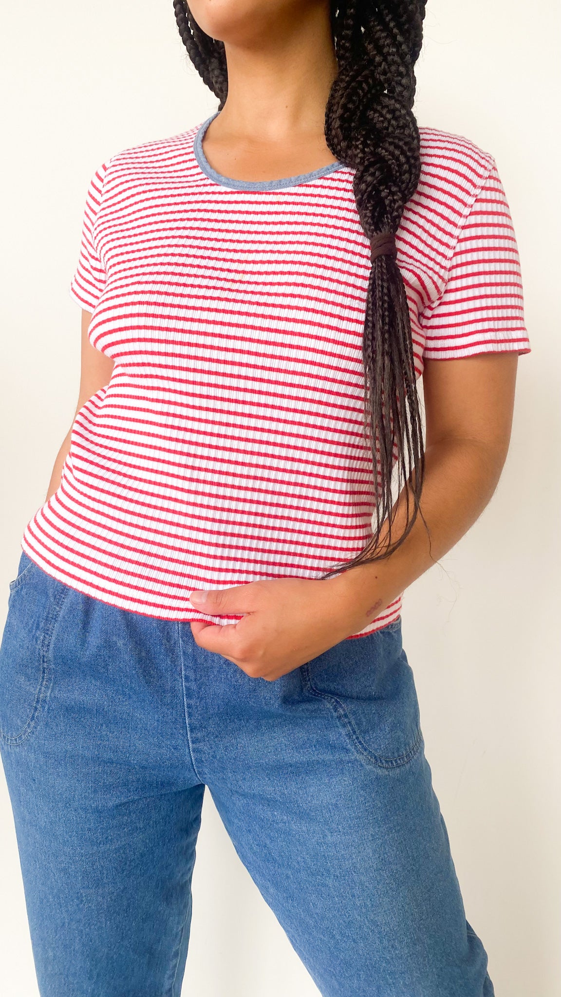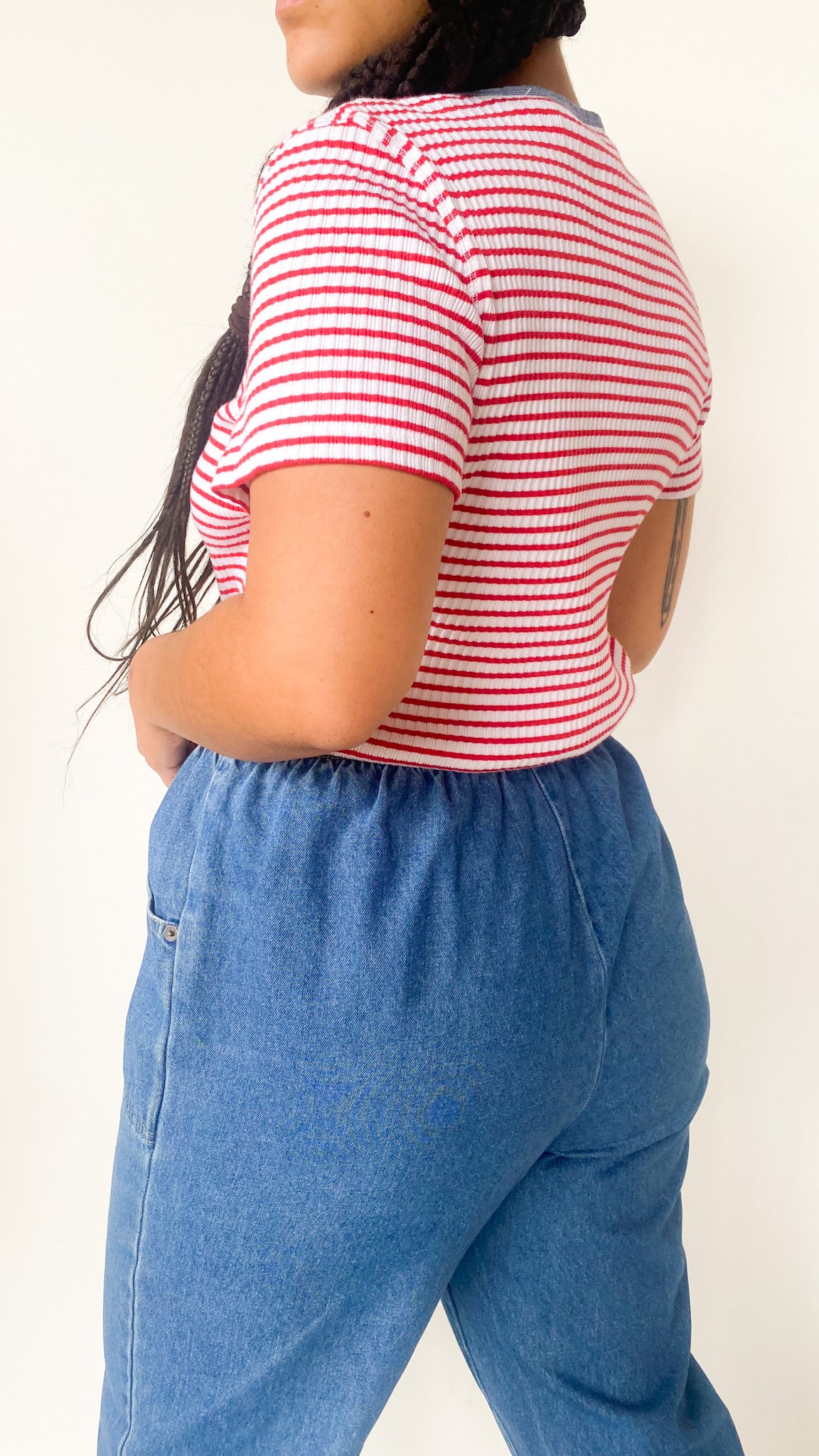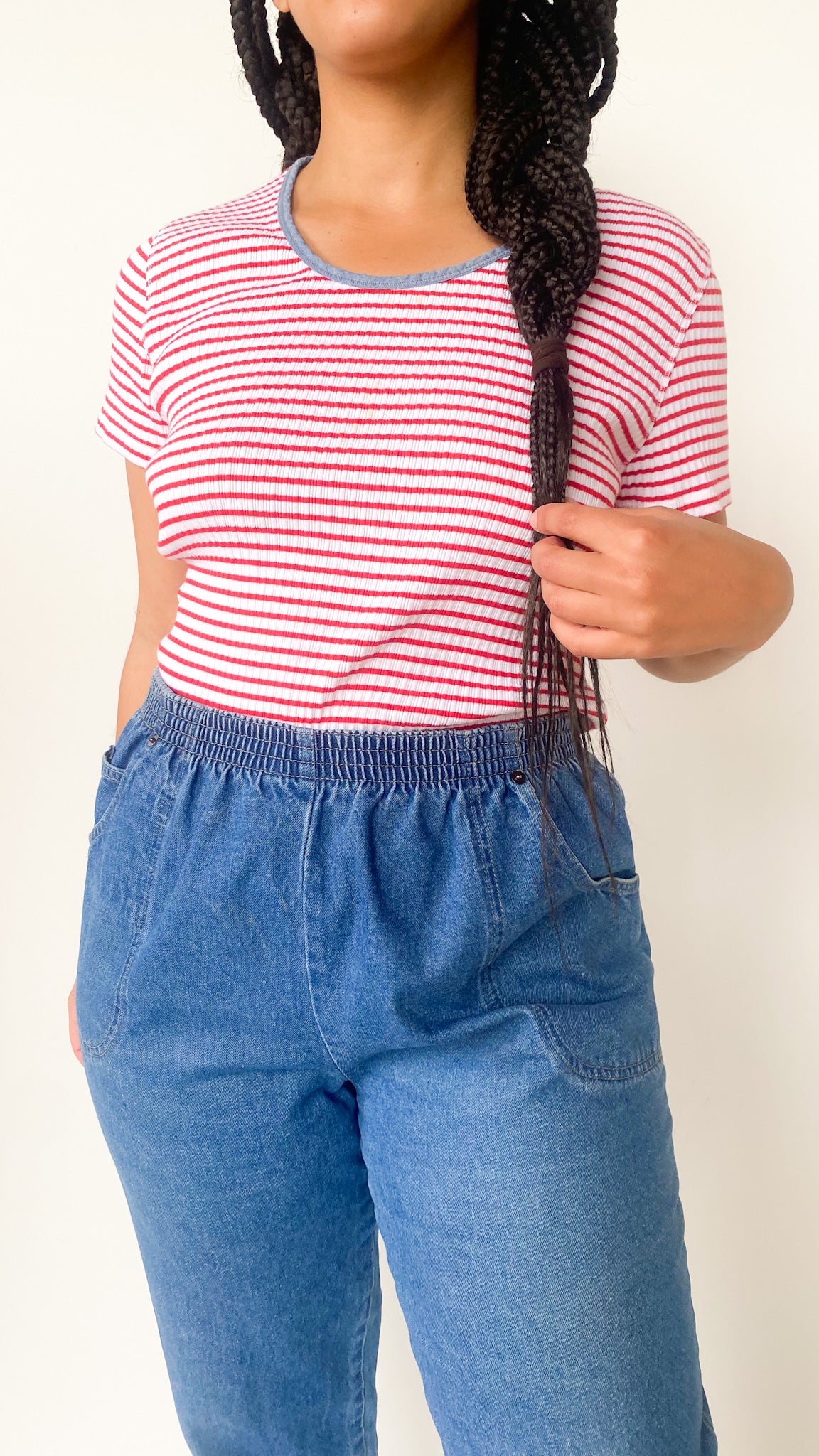 Short sleeve ripped tee shirt, with red and white candy stripes all over. Denim trim on the collar. Good vintage condition- spot treated on the front center. Priced as is.