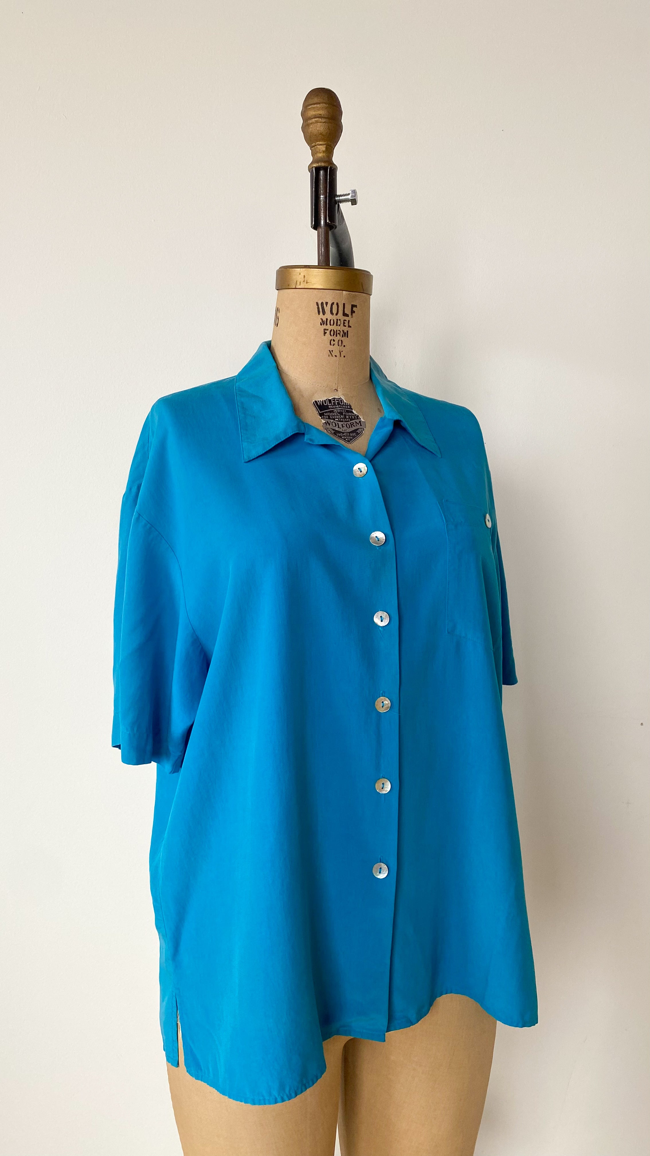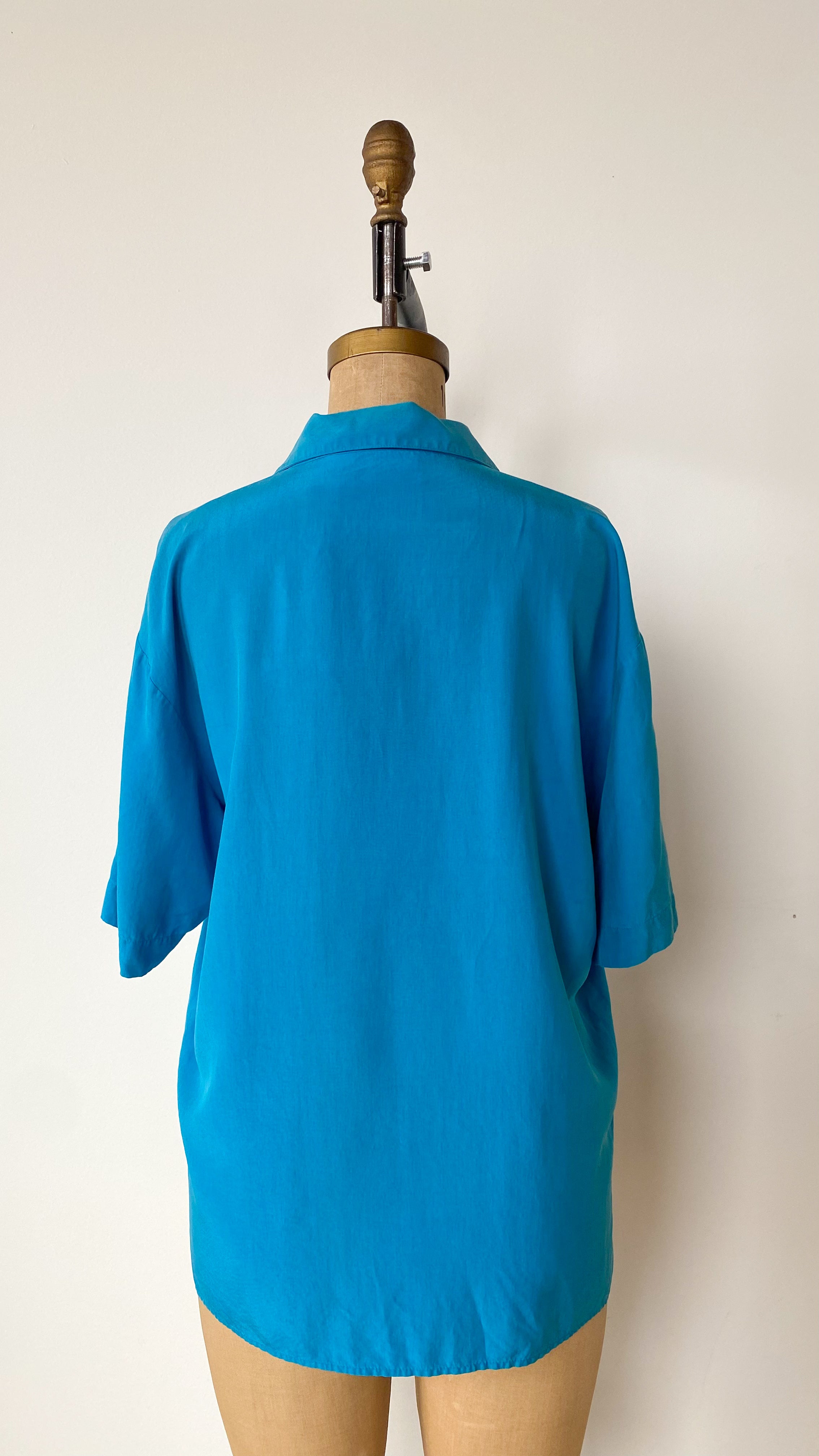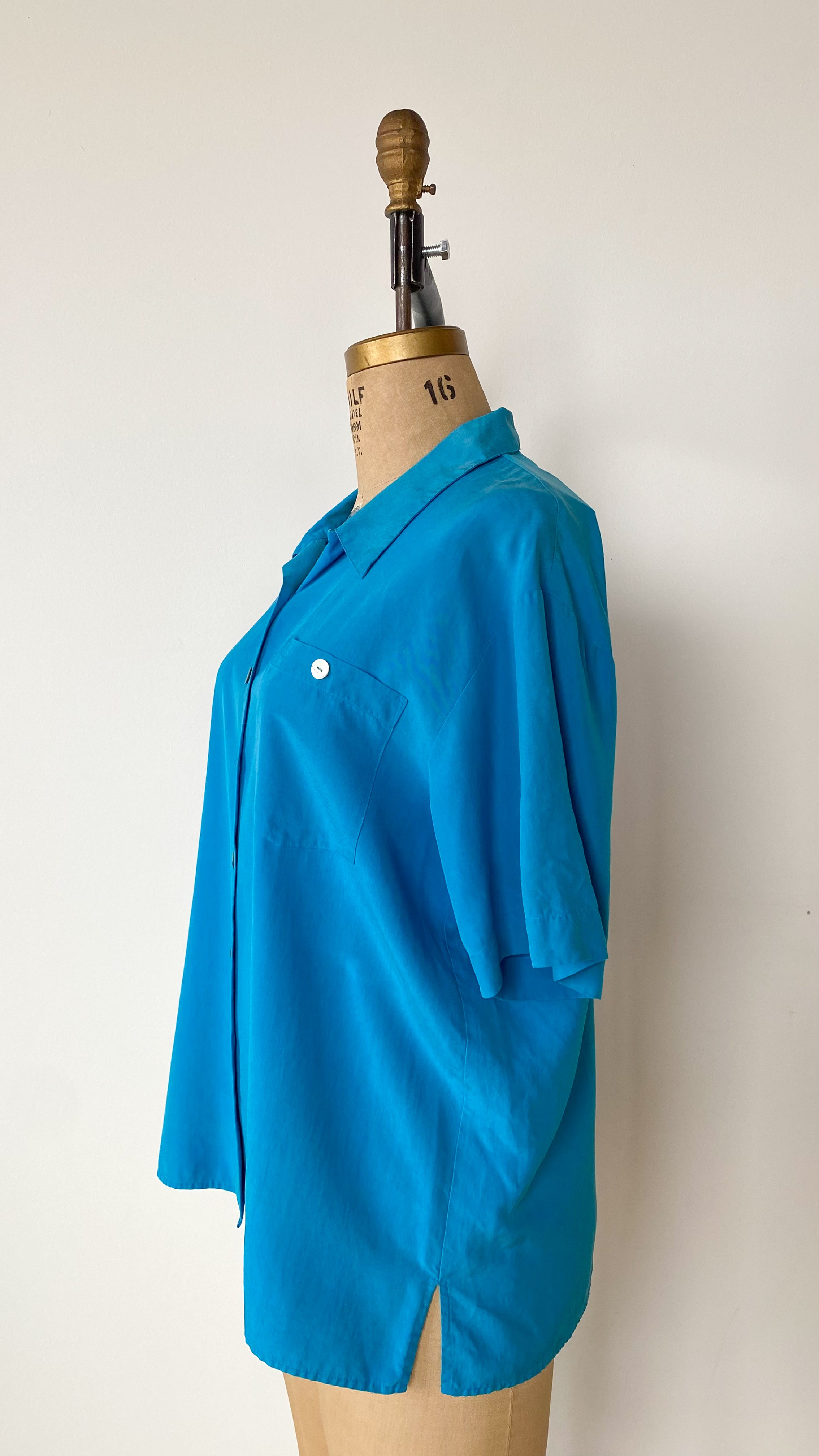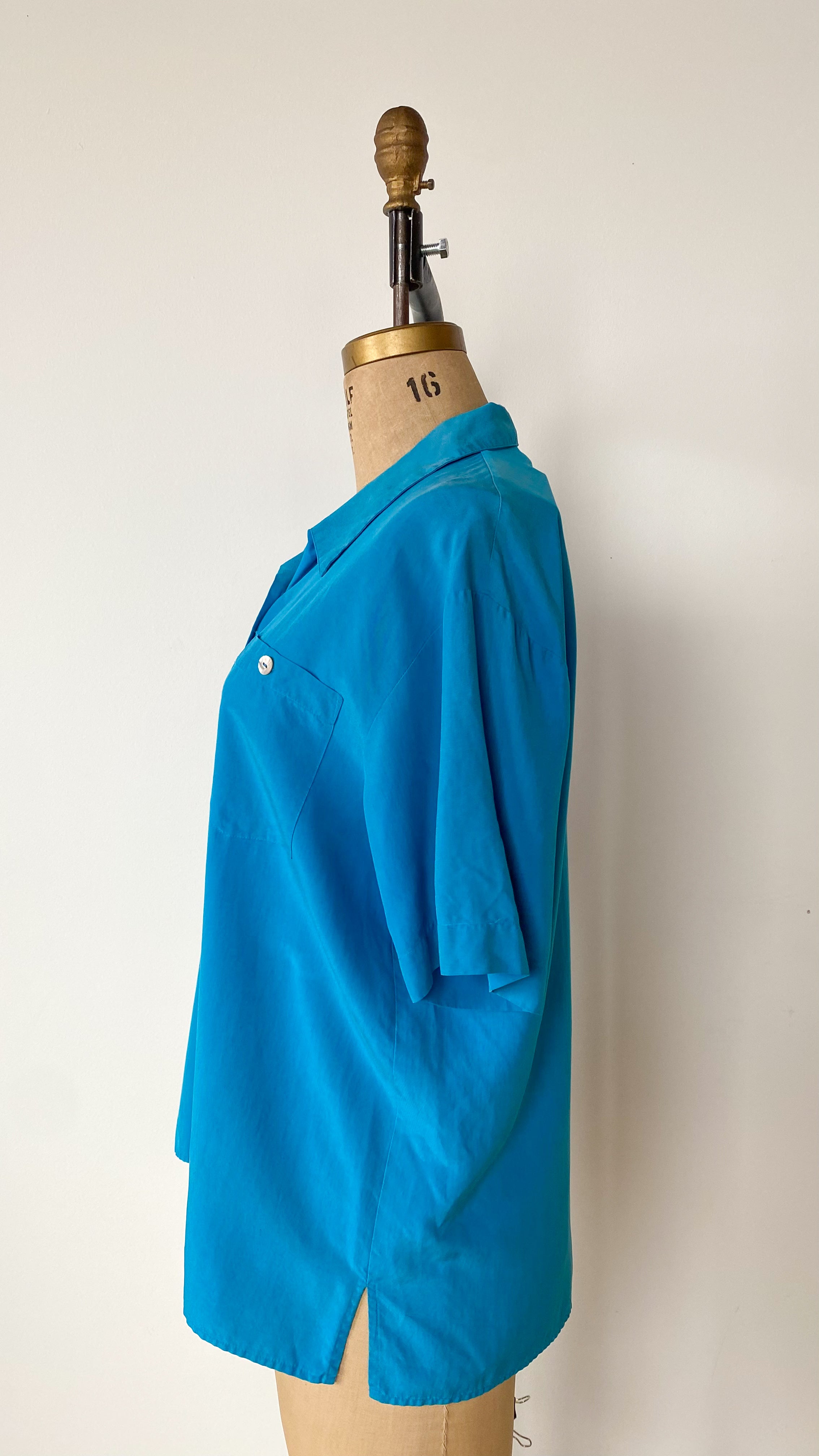 1990s Electric Blue Short Sleeve Silk Button Down, sz. 2XL