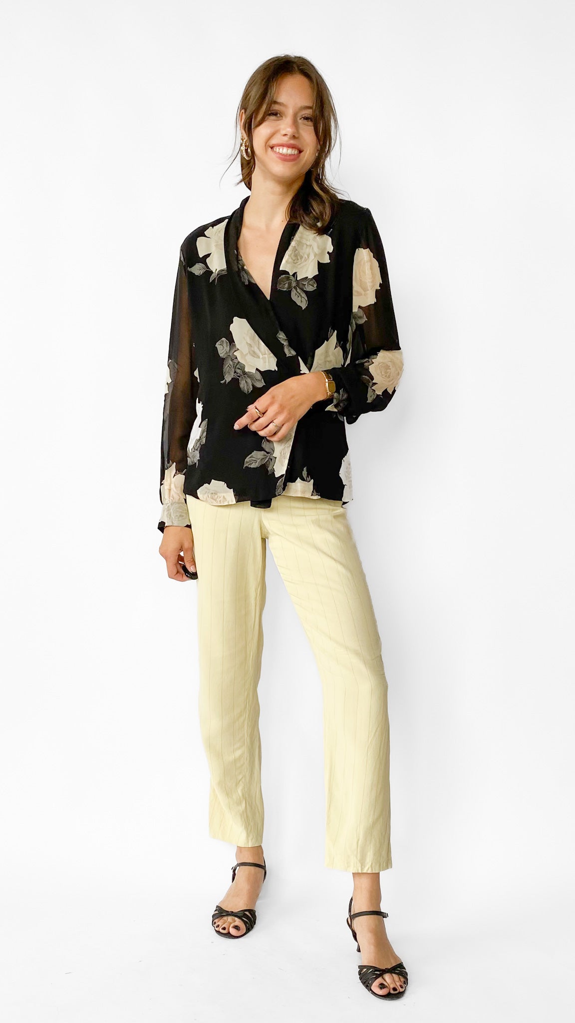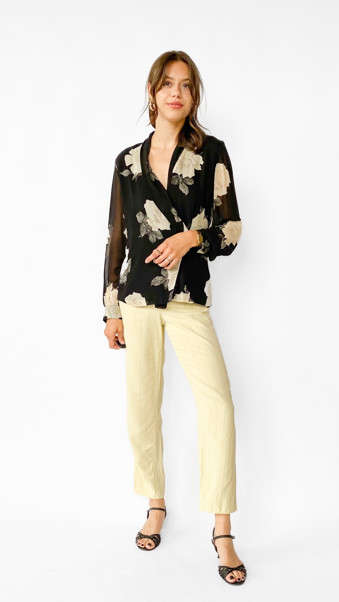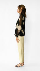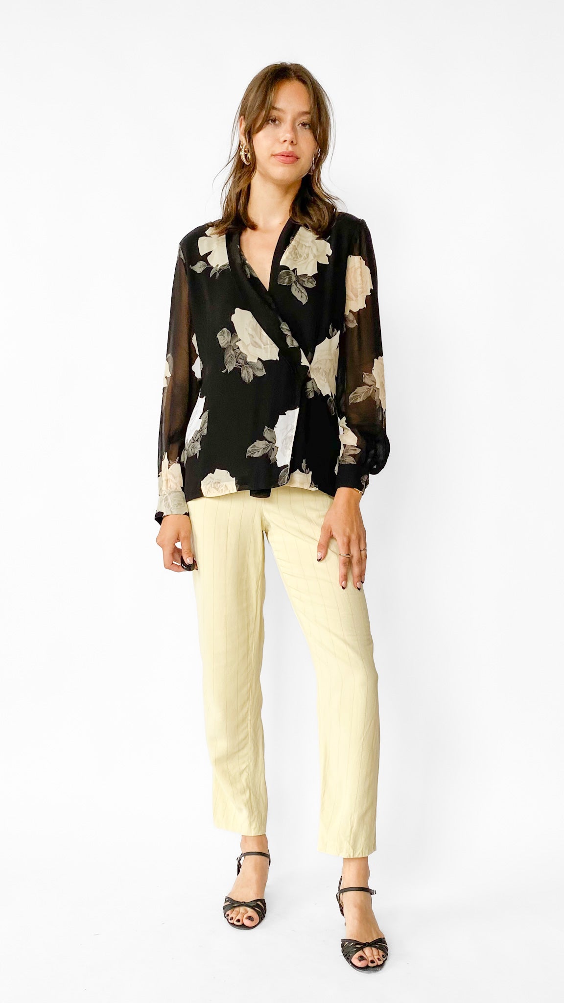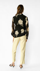 Black semi-sheer long sleeve blouse with asymmetrical button closure that creates a the illusion of a wrap shirt. Large white and grey floral pattern. Sleeves have elastic closure at the wrist.