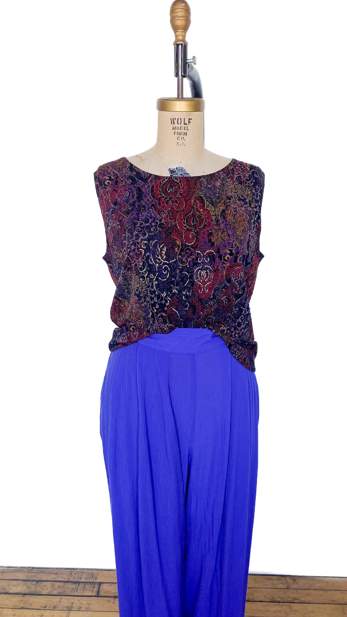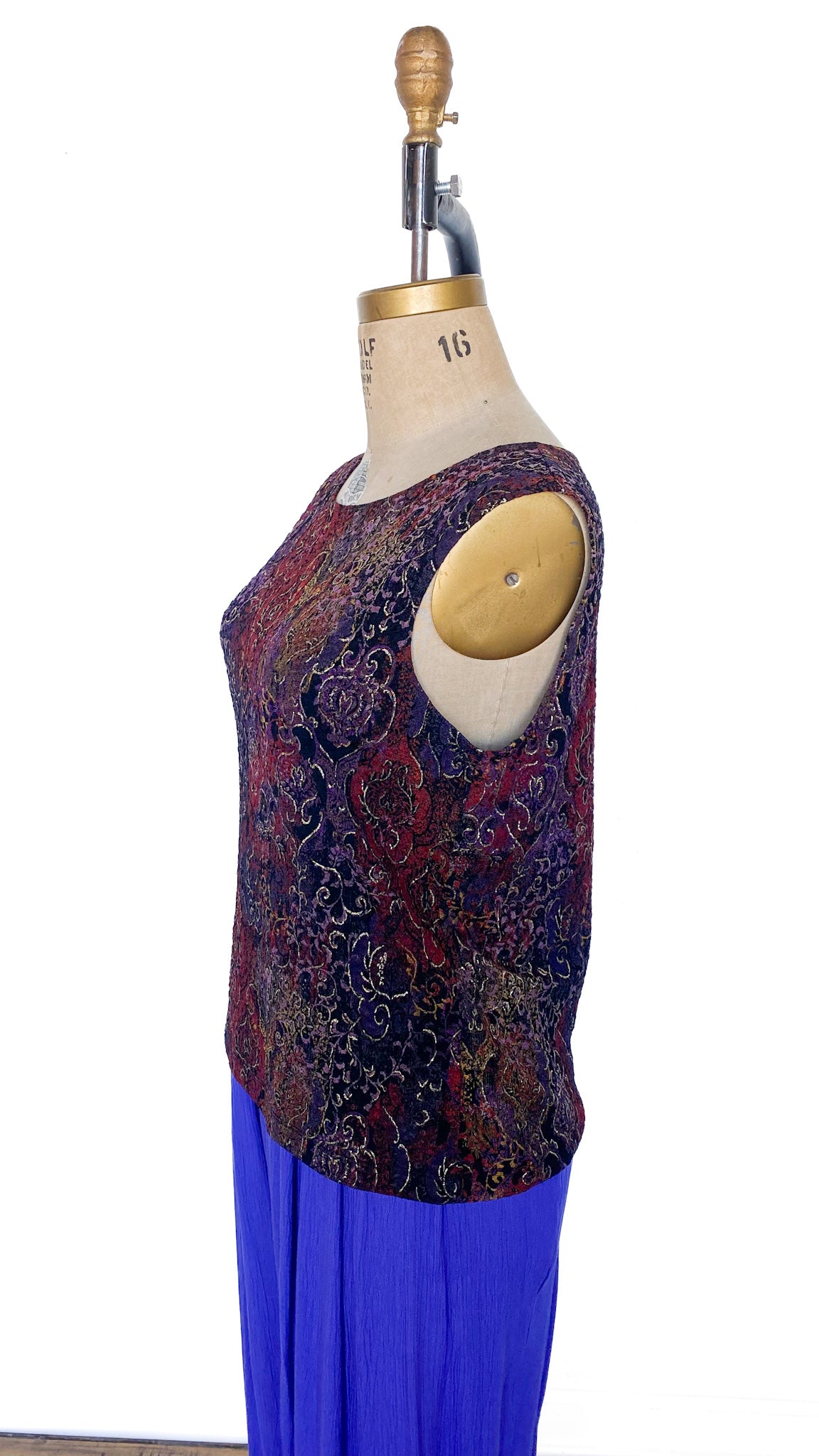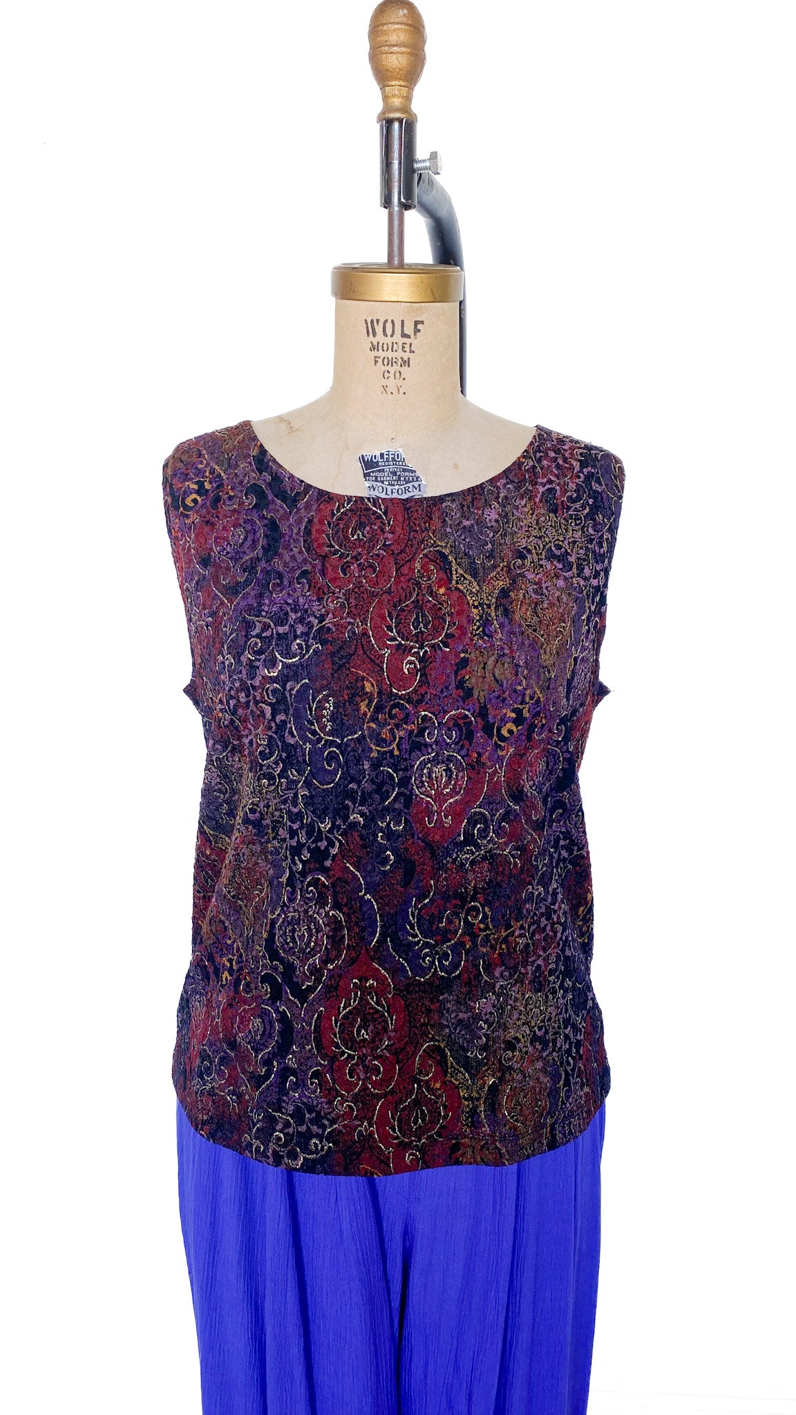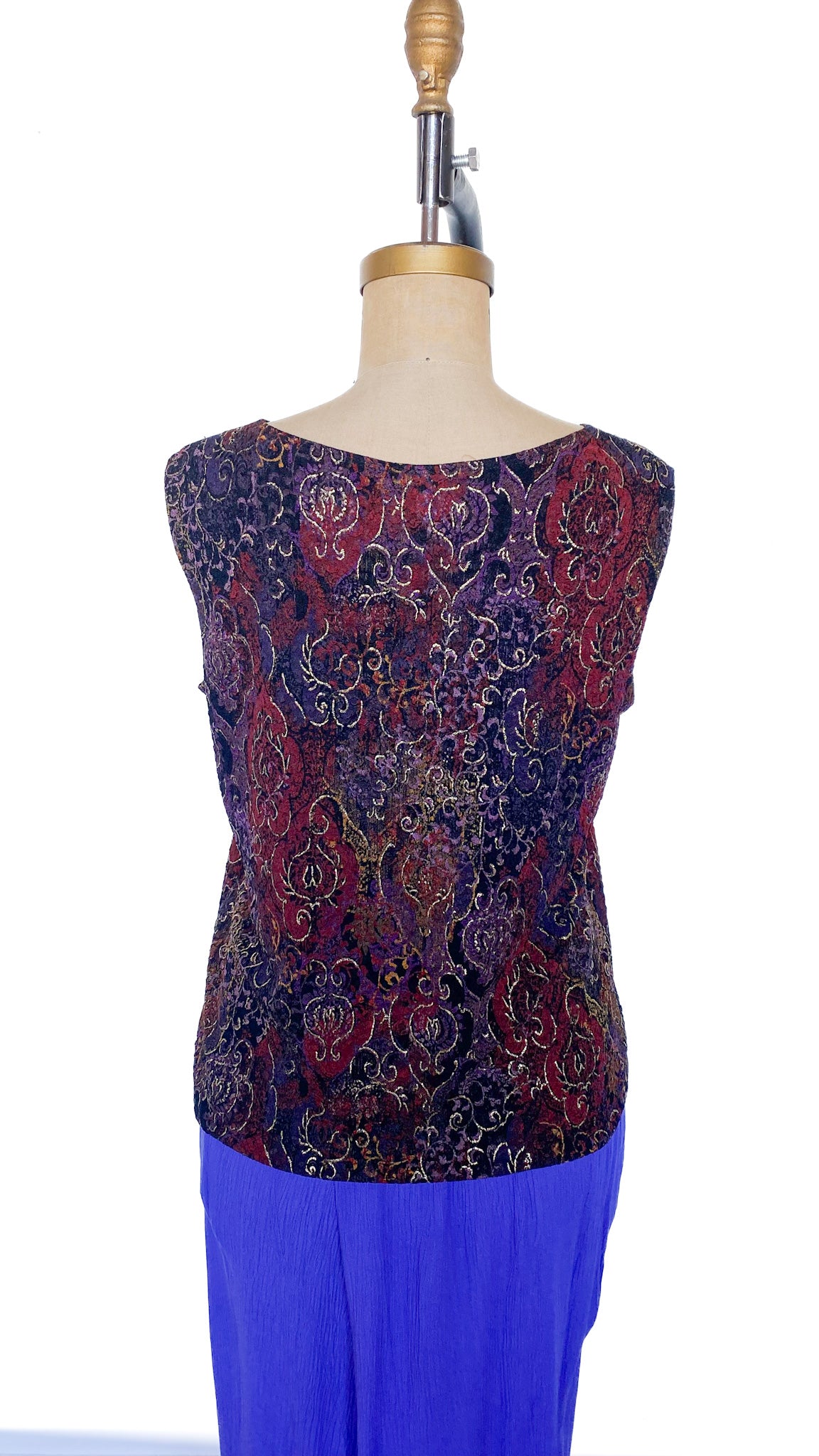 Black textured tank top with dark purple and red abstract paisley pattern and gold metallic details.