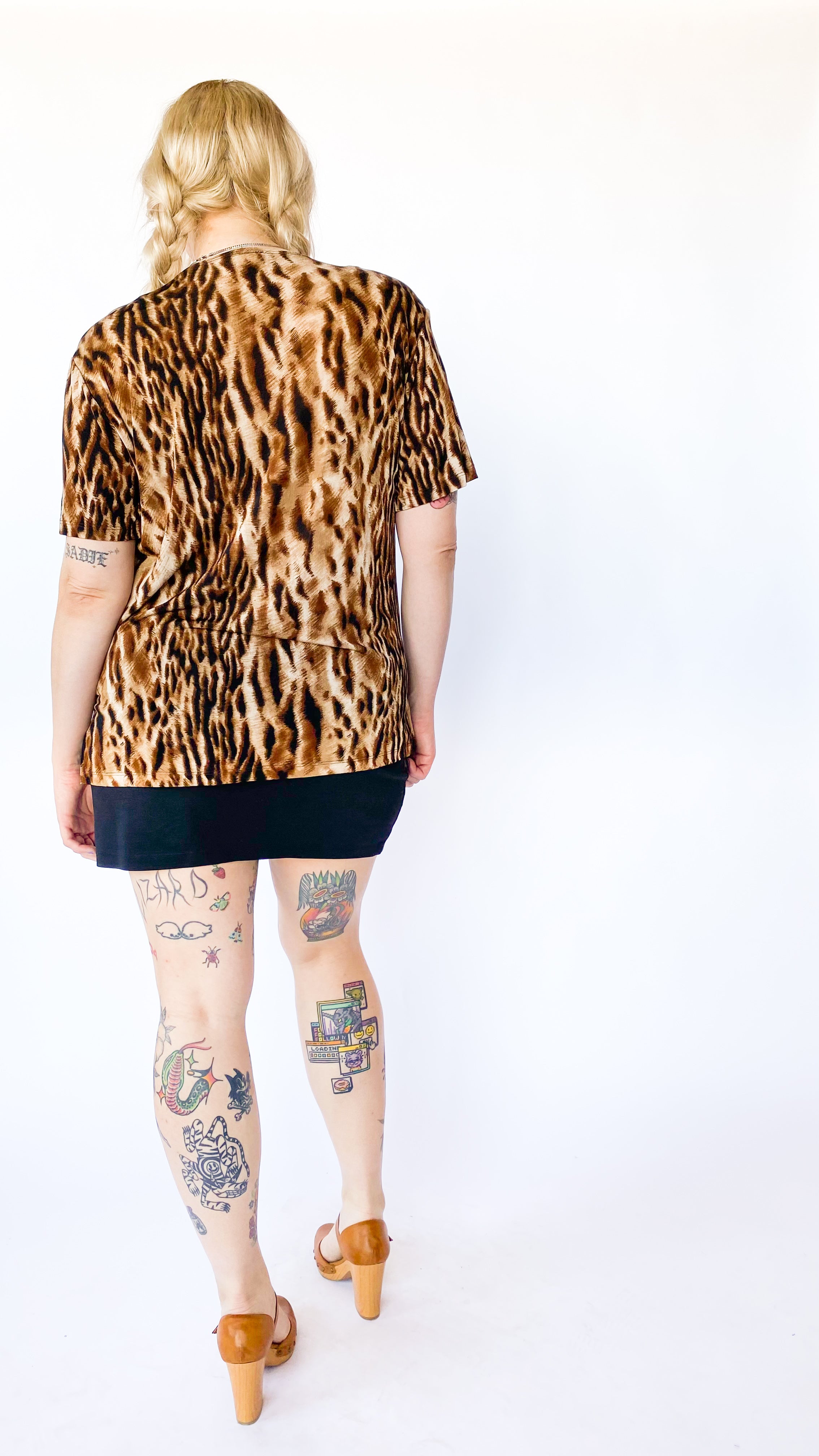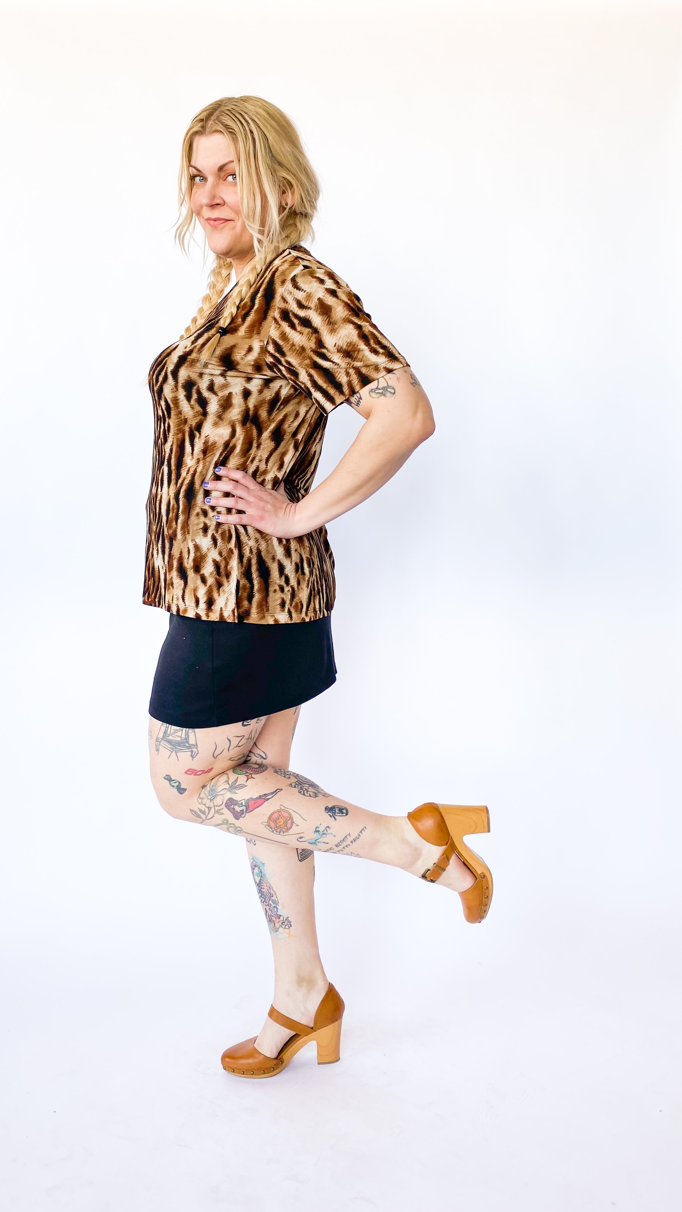 Description: Short-sleeved cheetah print top. Very stretchy, and can fit up to a 7XL.