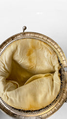 Small silver chainmail evening bag with a metal frame and clasp. Short chain attached to either side of the frame. Interior is lined in ivory fabric with one pocket.