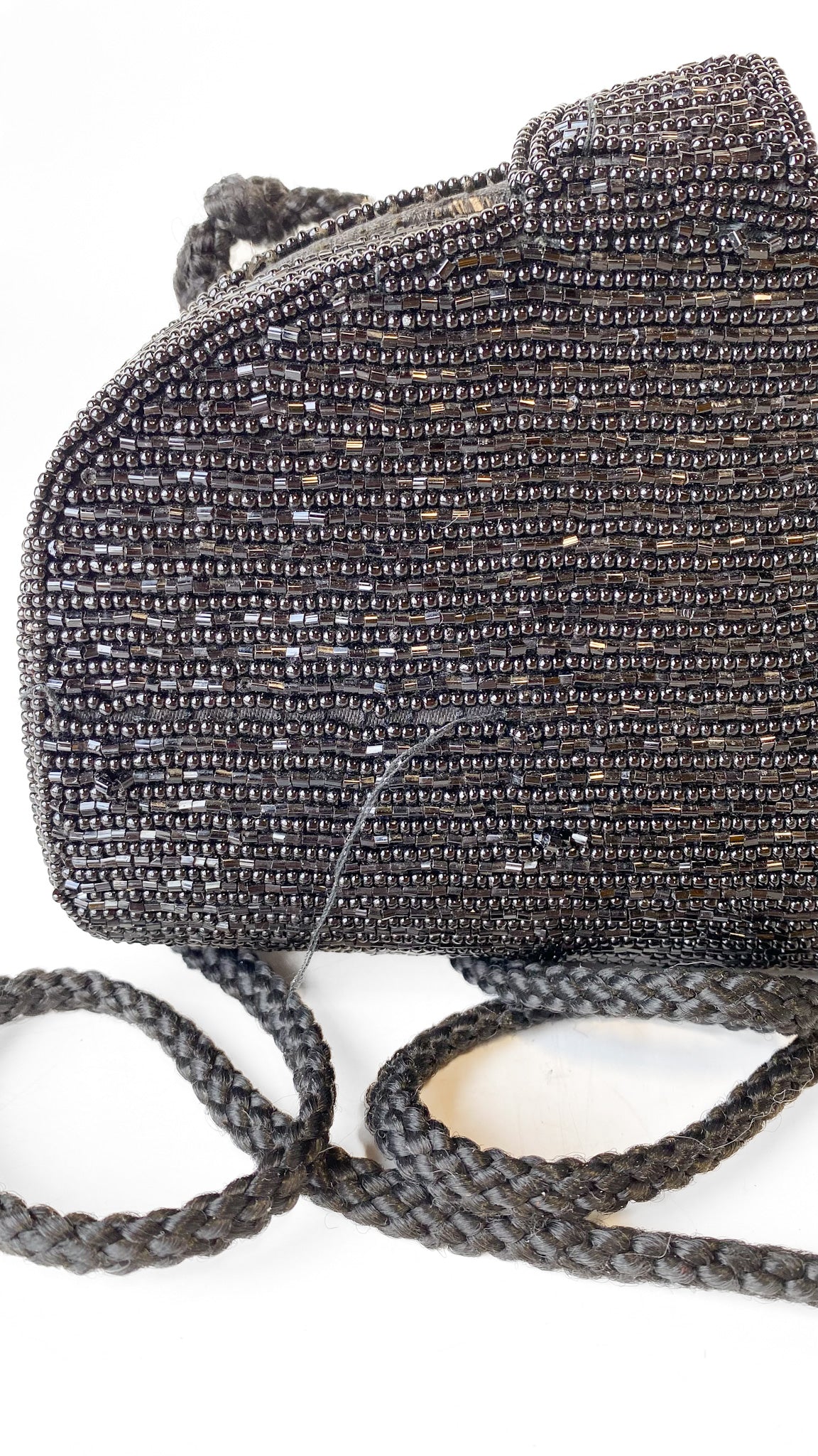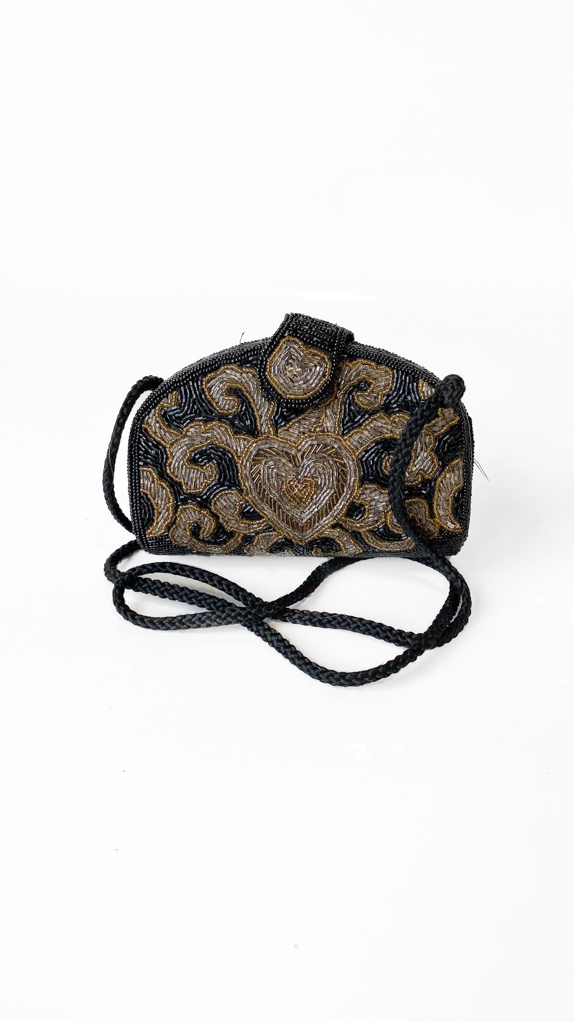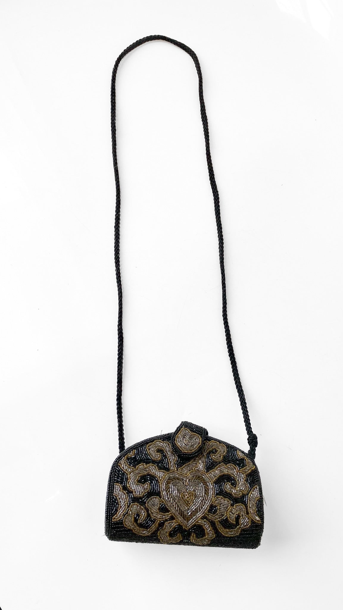Black beaded purse with oxidized white and gold bead heart design. Metal magnetic clasp. Interior is lined in black fabric, one interior pocket. Black corded strap.