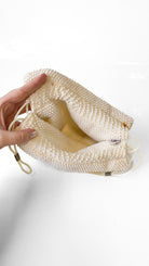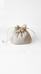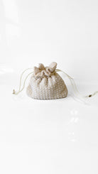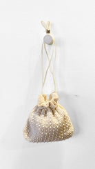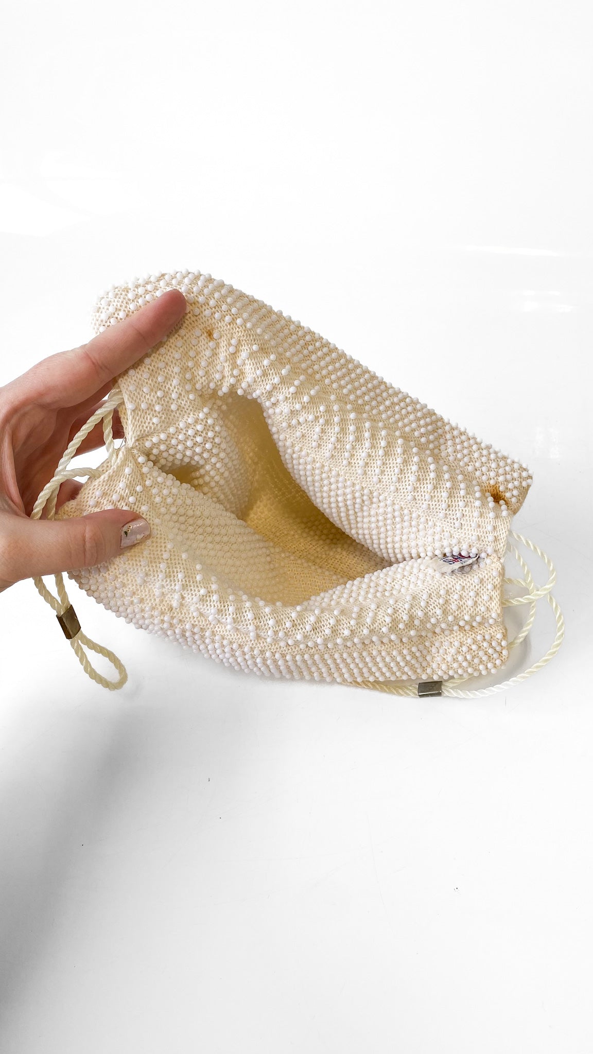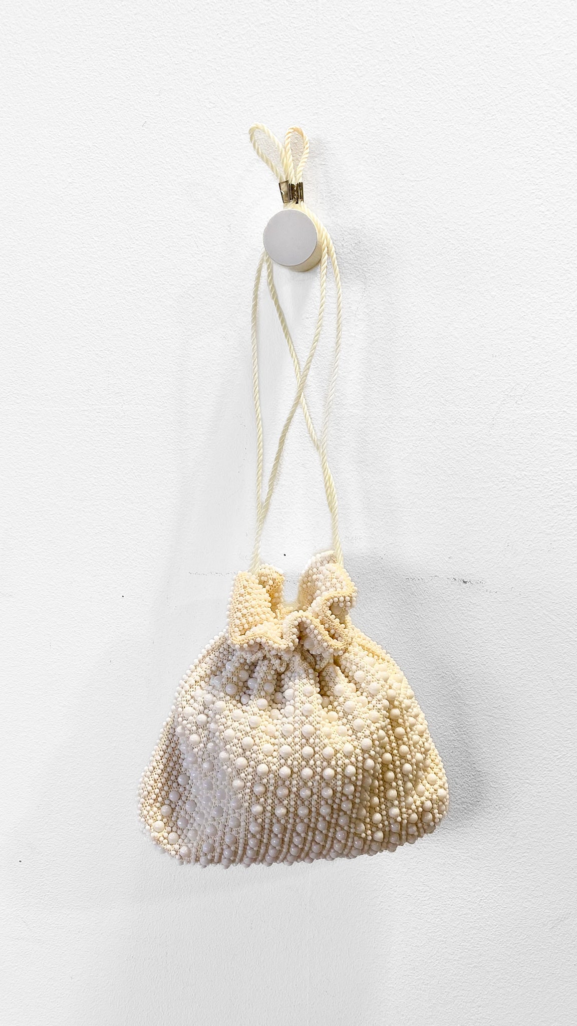 White beaded bucket bag with drawstring straps, both interior and exterior are beaded.