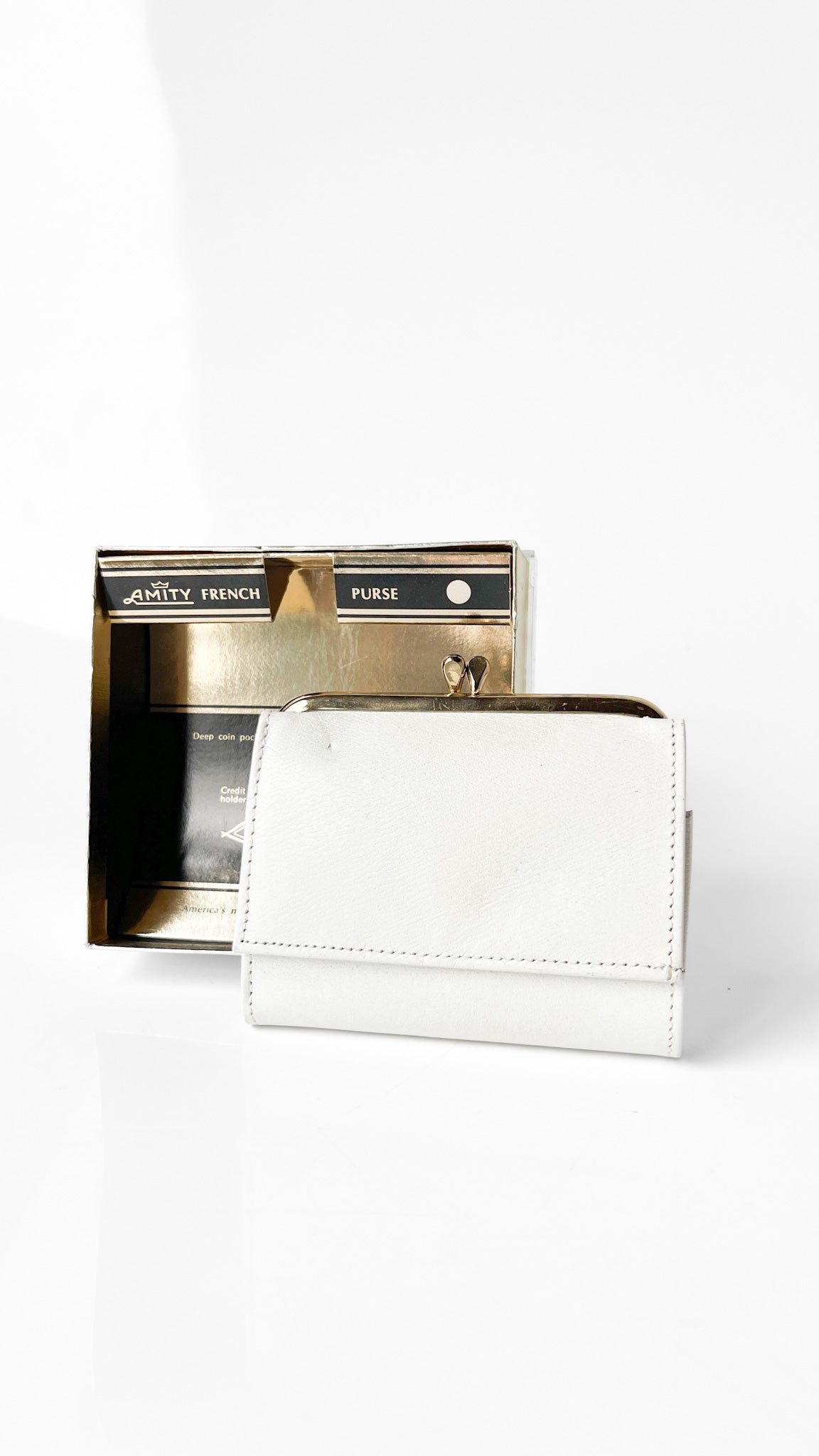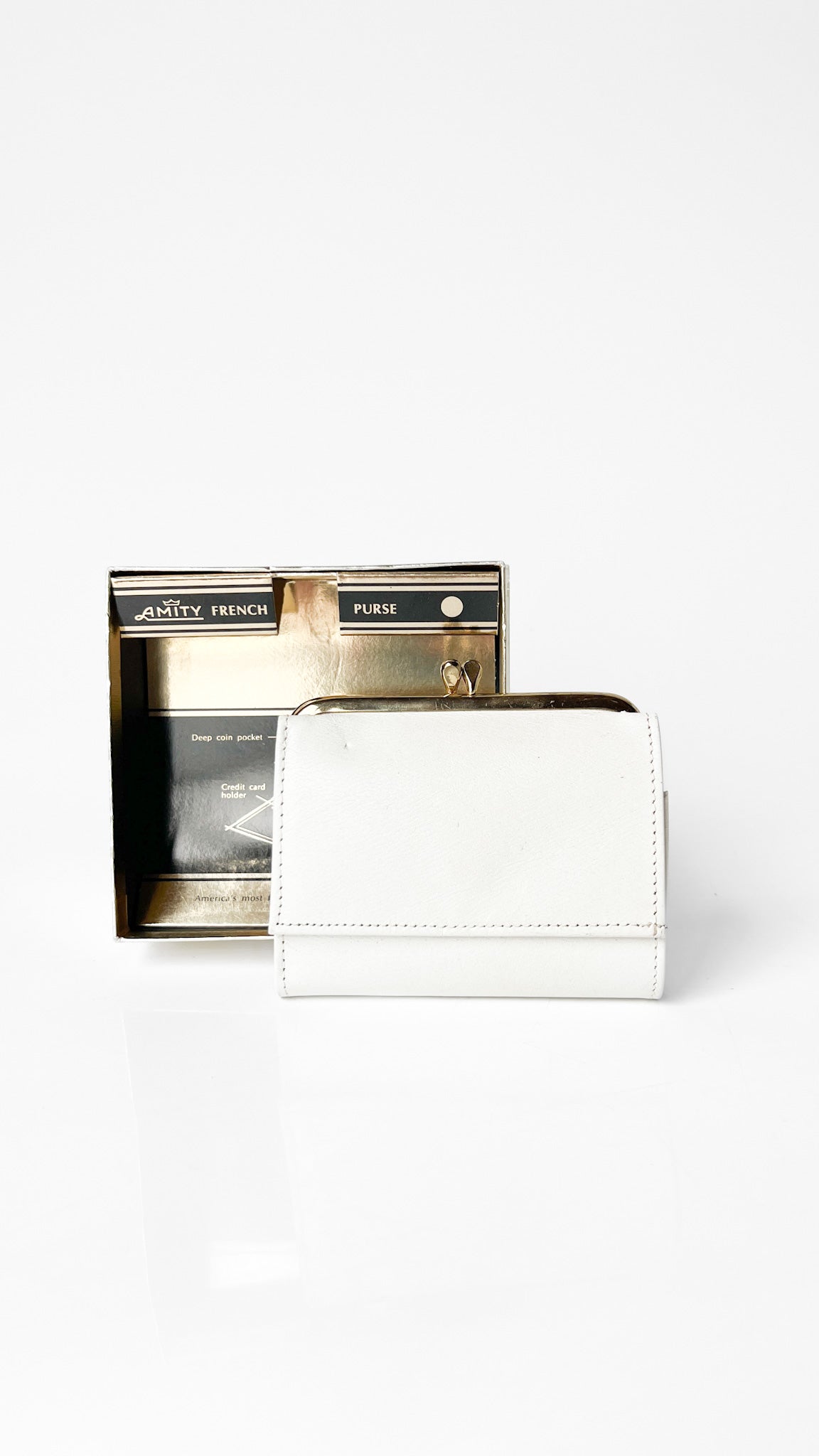 Description: White wallet with a bill compartment, credit card and ID holders, 8-view card case, deep coin pocket. Comes with display box.