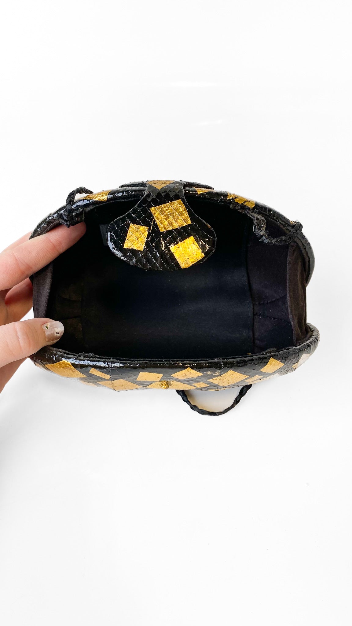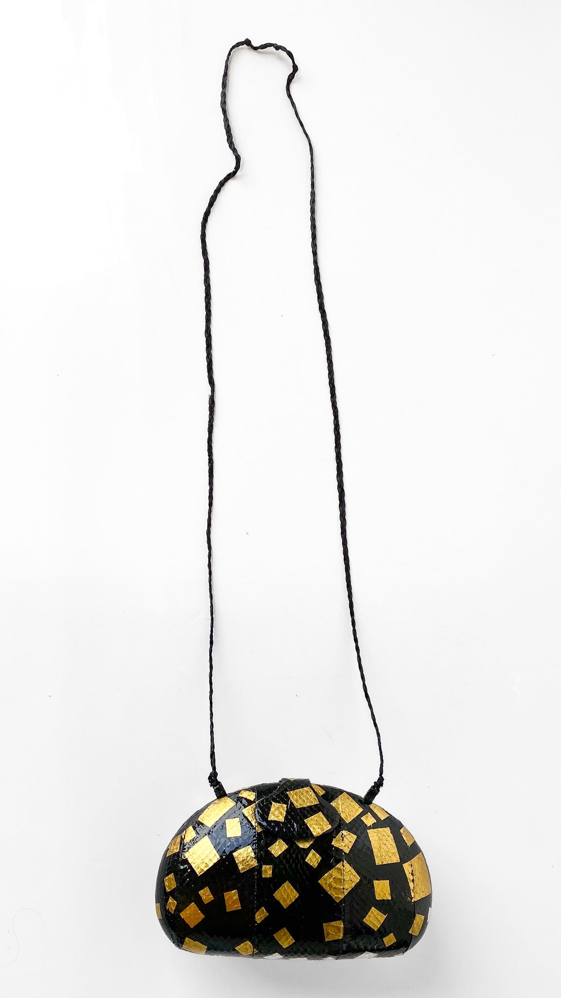 Black patent leather clamshell purse with gold square pattern, attached black corded strap. Interior is lined in black fabric, snap closure.