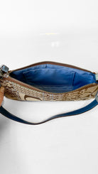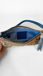 Tan and blue monogram mini shoulder bag with blue python strap and trim. Interior lined in blue fabric, two interior pockets (one with a zipper). Coach leather tags included.