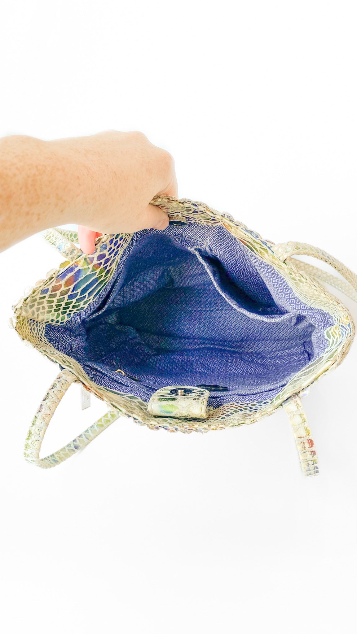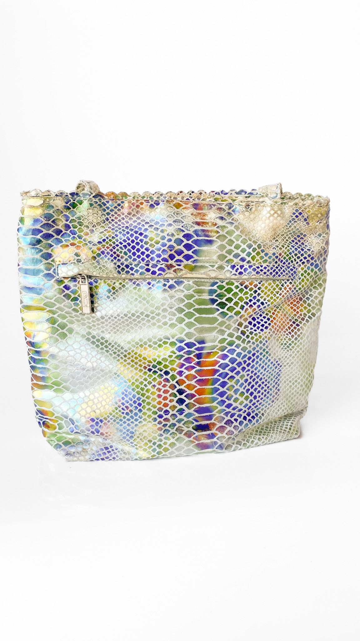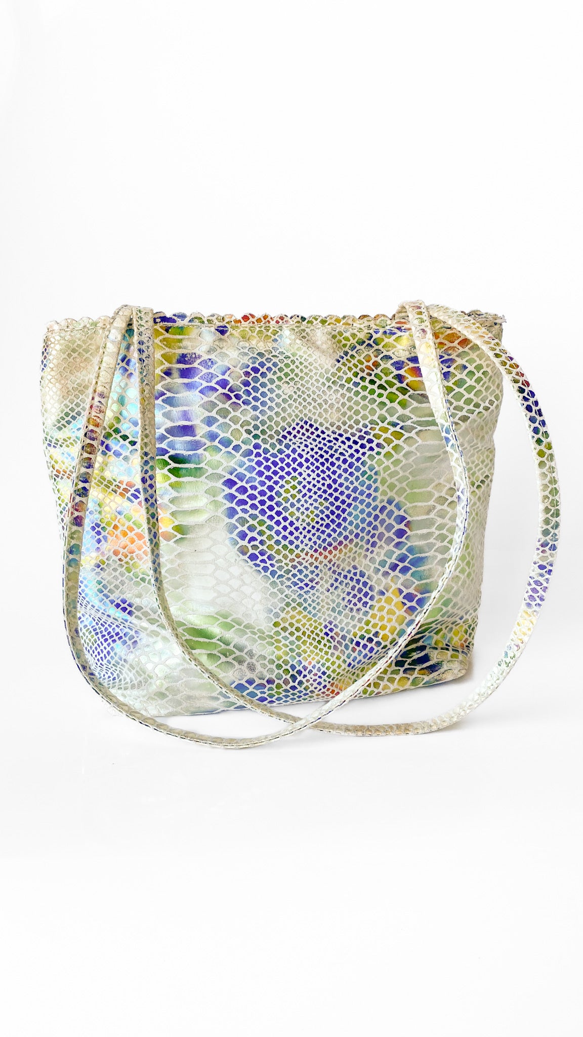 Cream suede bucket bag with iridescent snakeskin print, scalloped trim along top. One exterior zipper pocket, four interior pockets, cotton blue lining, metal magnetic snap.
