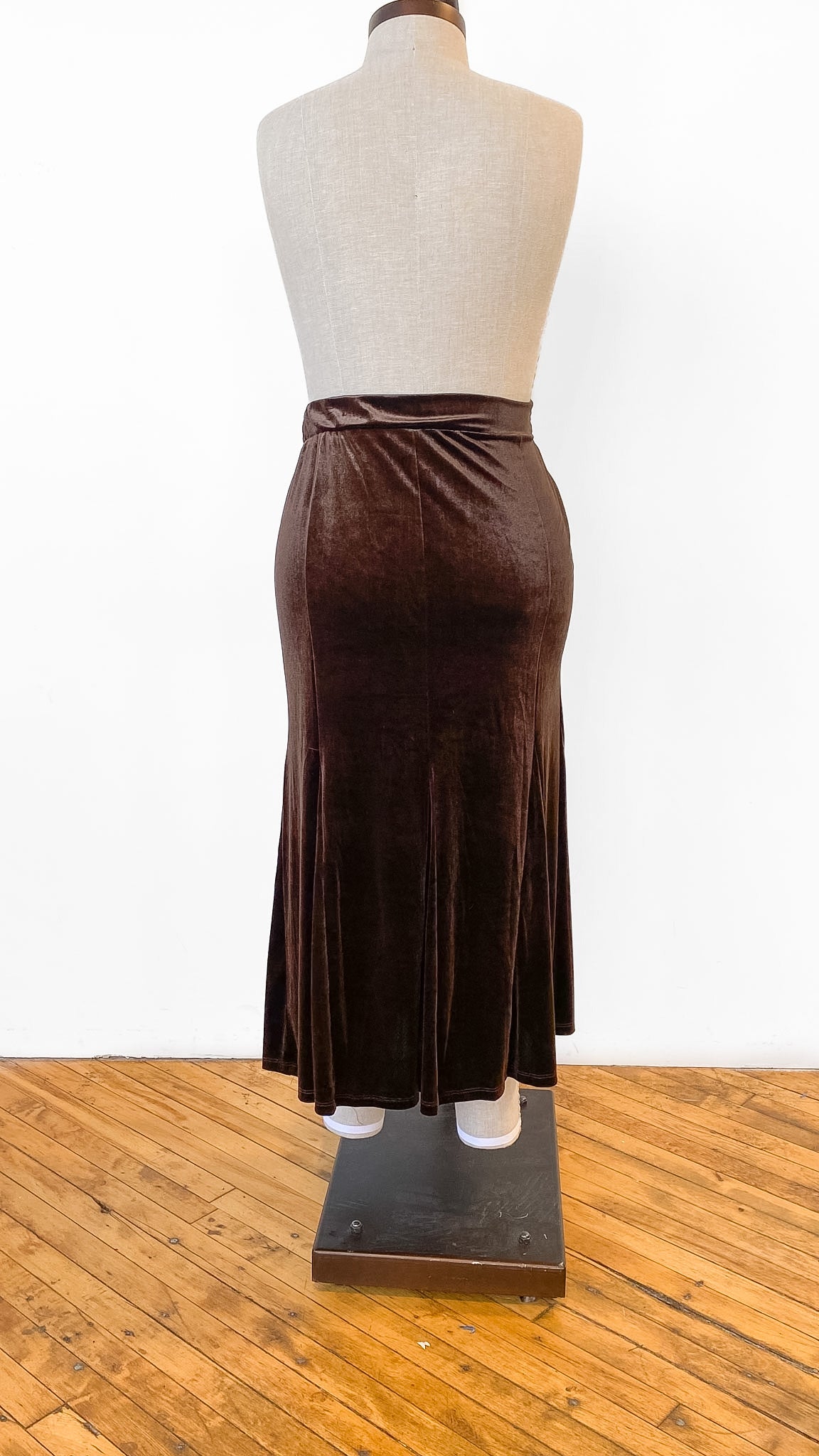 Chocolate brown velvet midi length skirt with elastic waistband and godets for a fit and flare silhouette. No closures, no pockets.