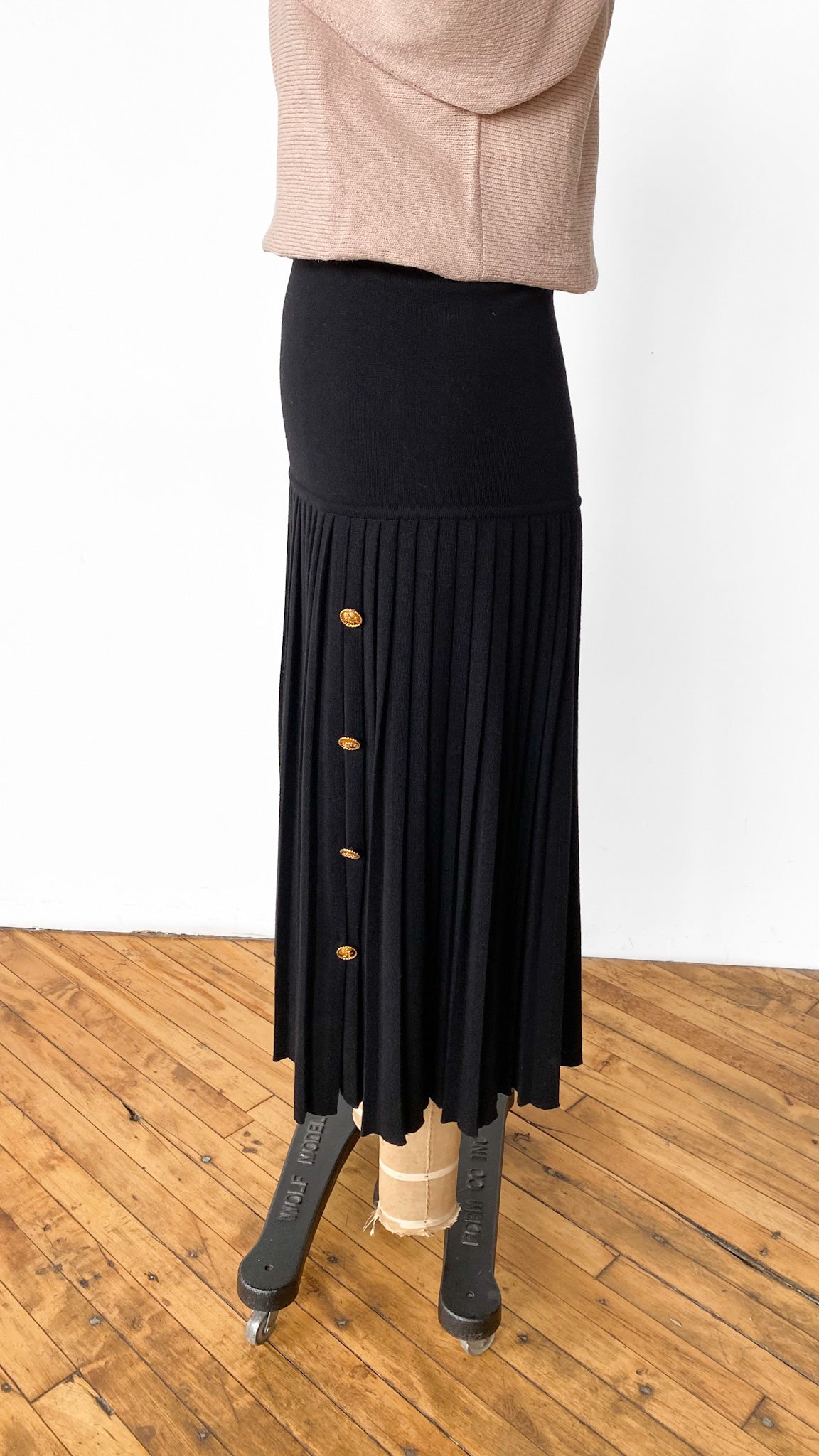 Black stretch knit pleated skirt with drop waist and decorative gold buttons along slit in skirt (no button holes, buttons do not close).