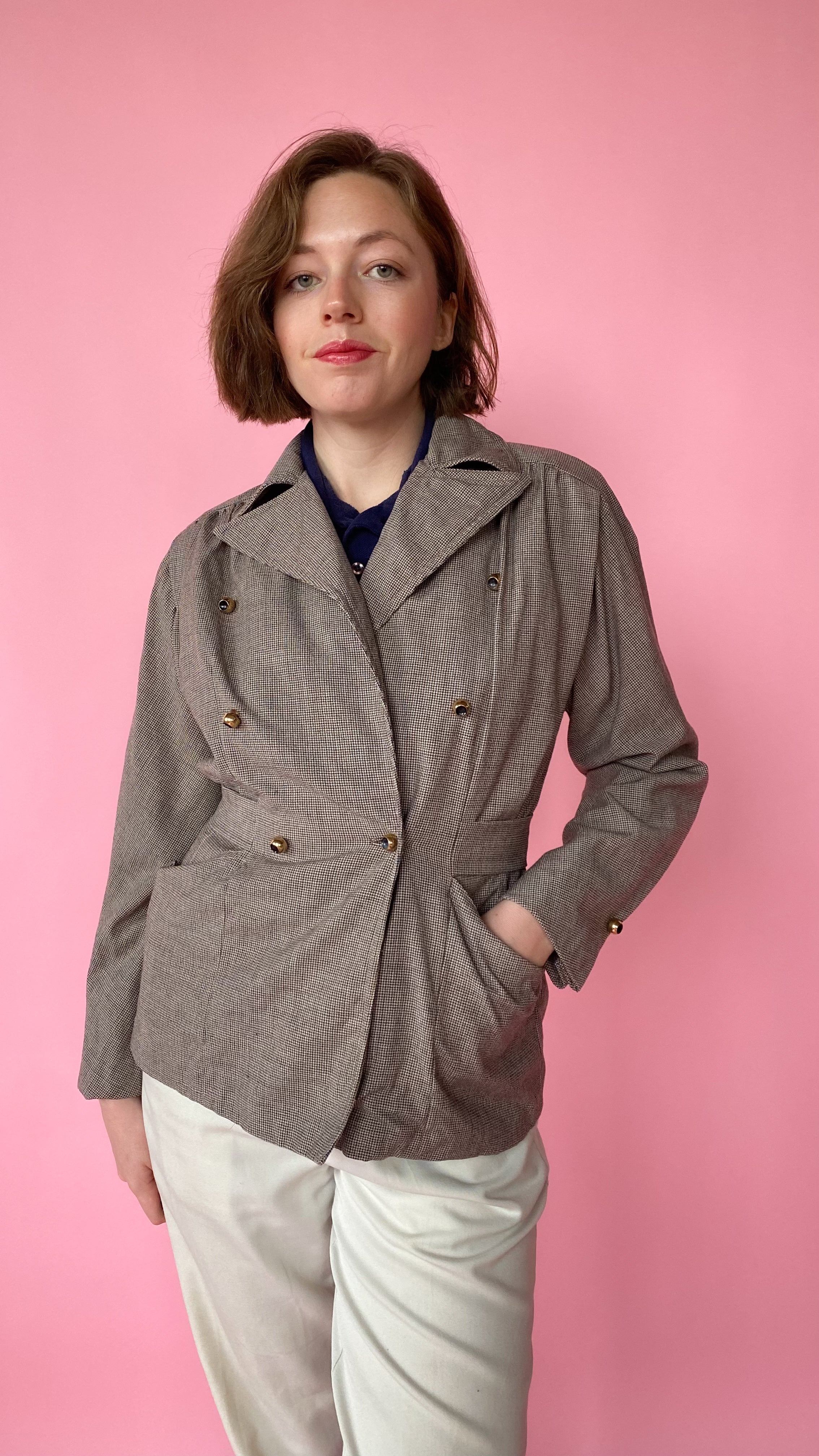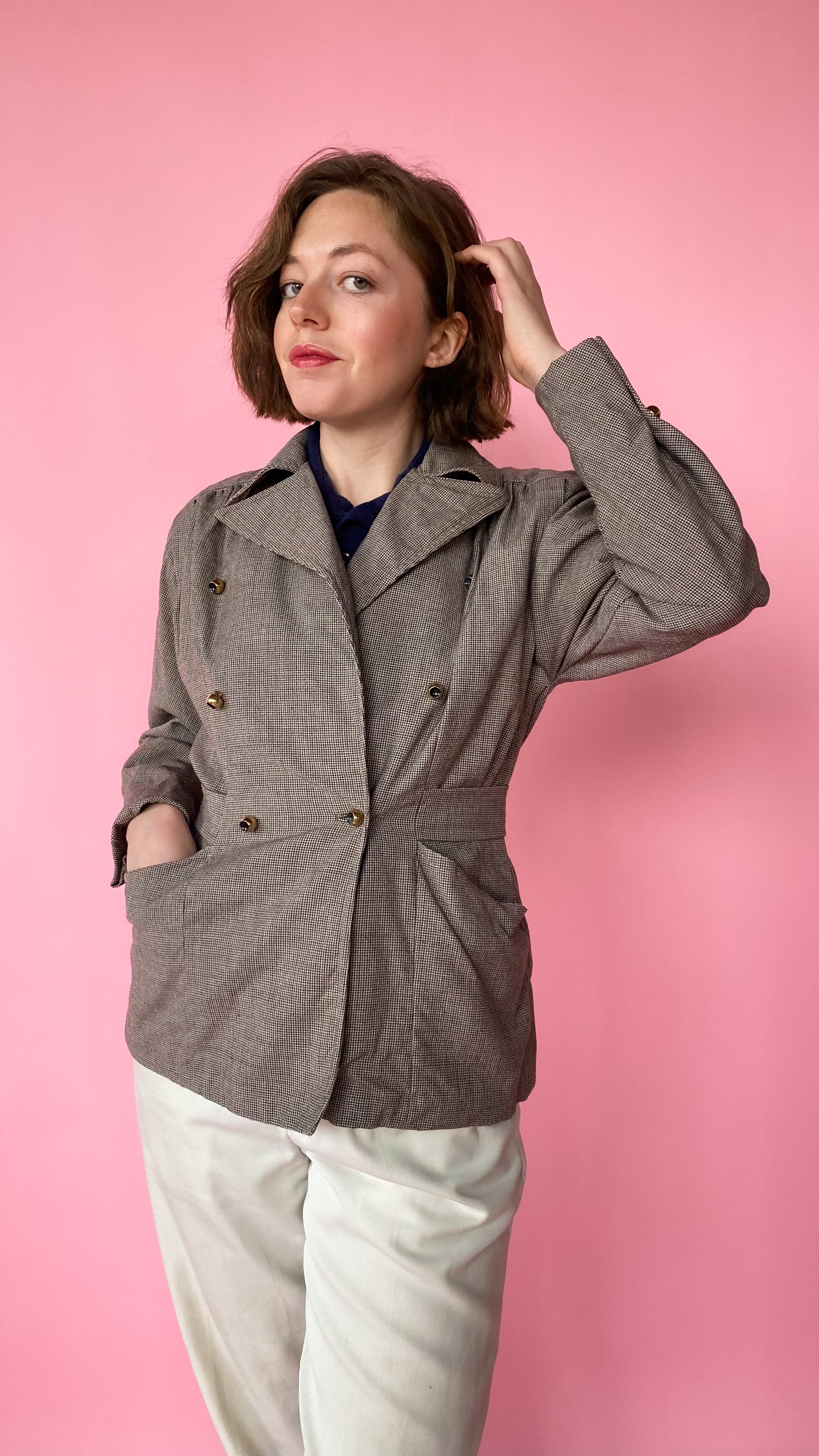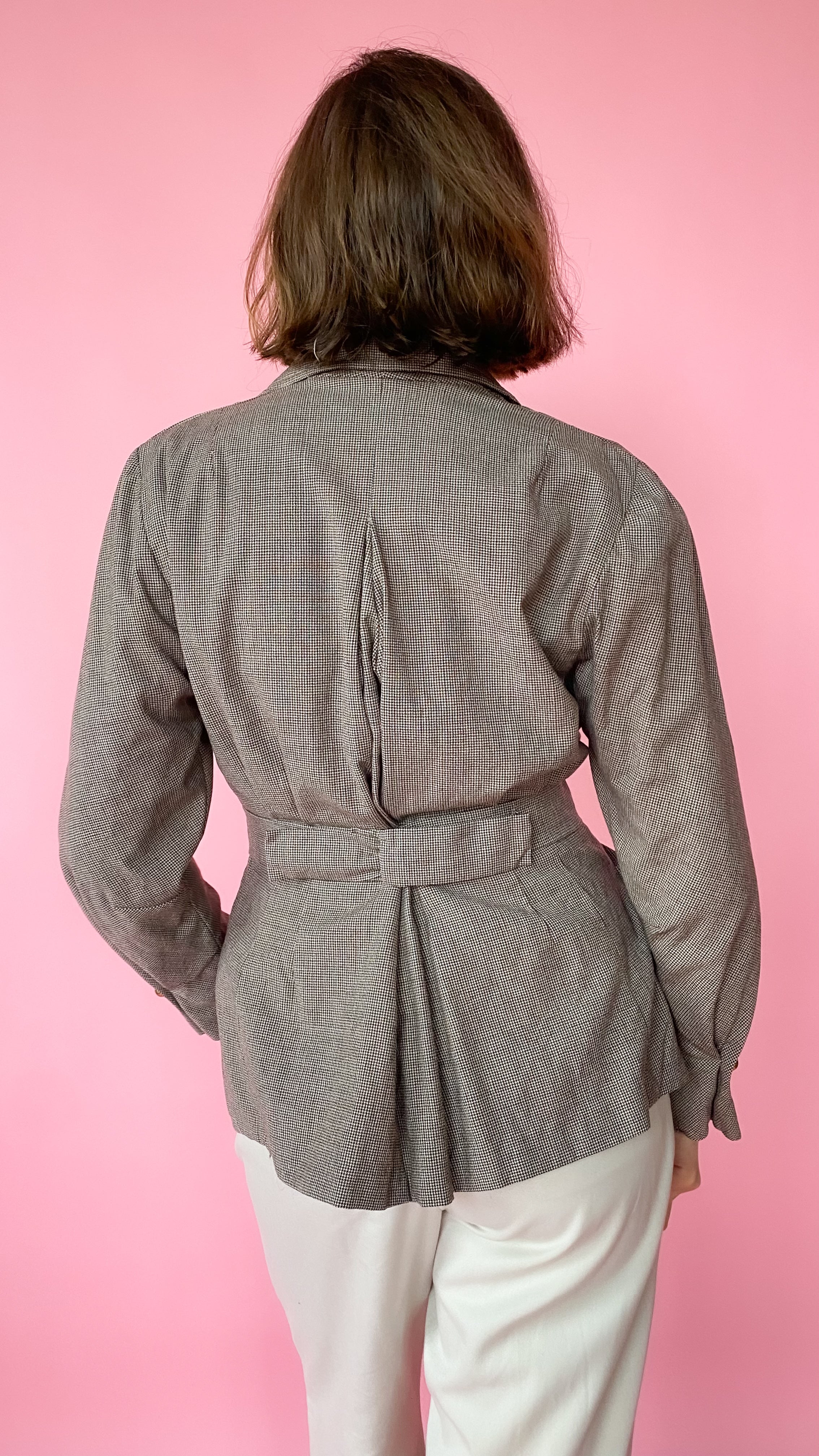 Brown, blue, and tan tweed jacket. Gold and dark blue decorative buttons. Belt around the back. Lined. Pockets.