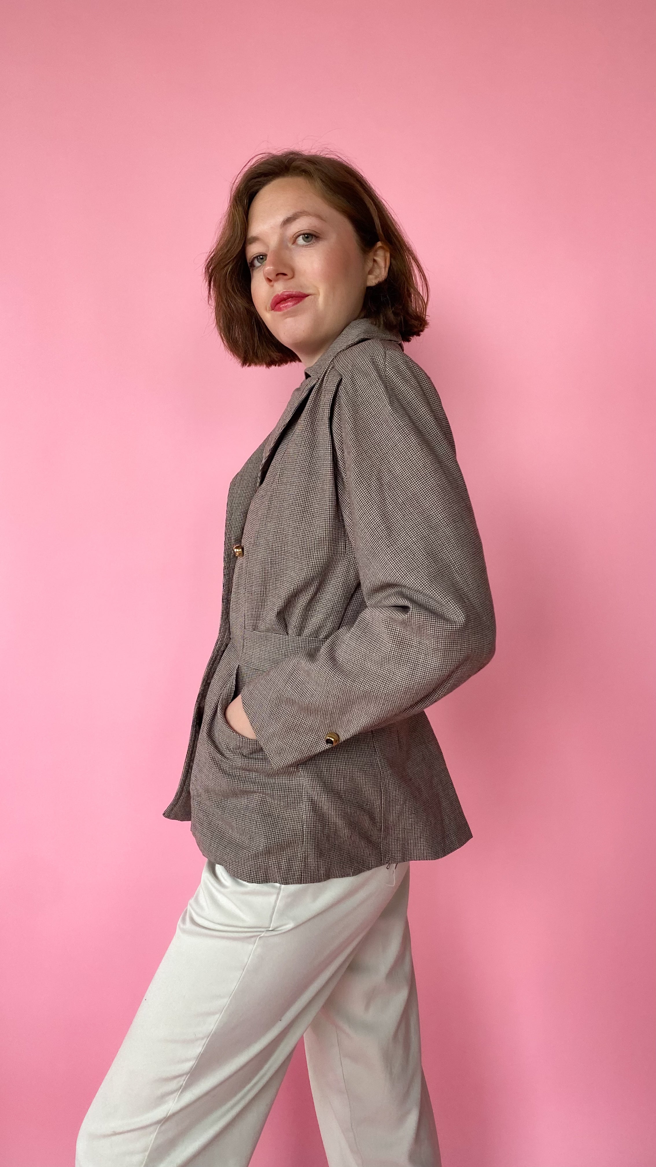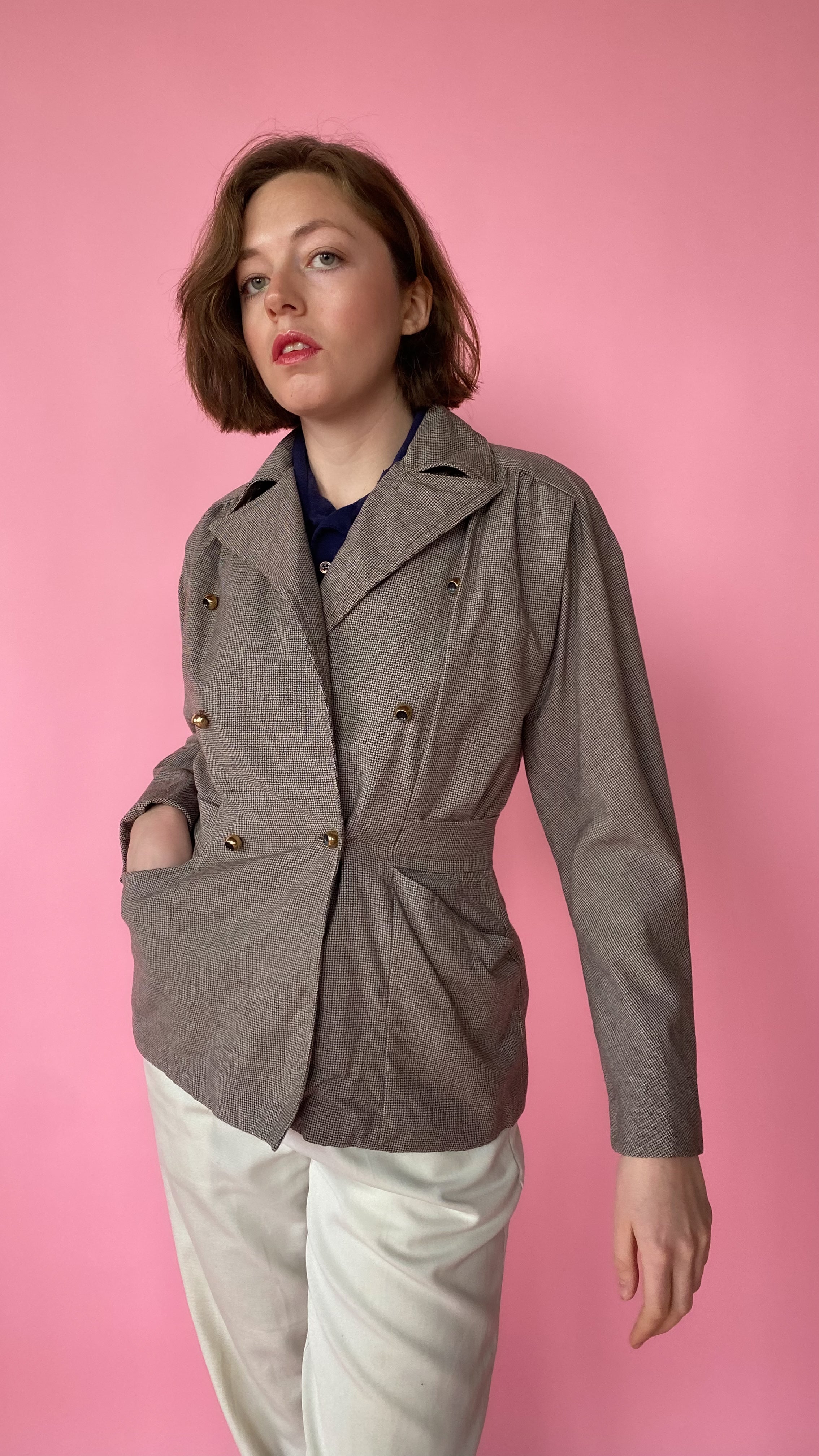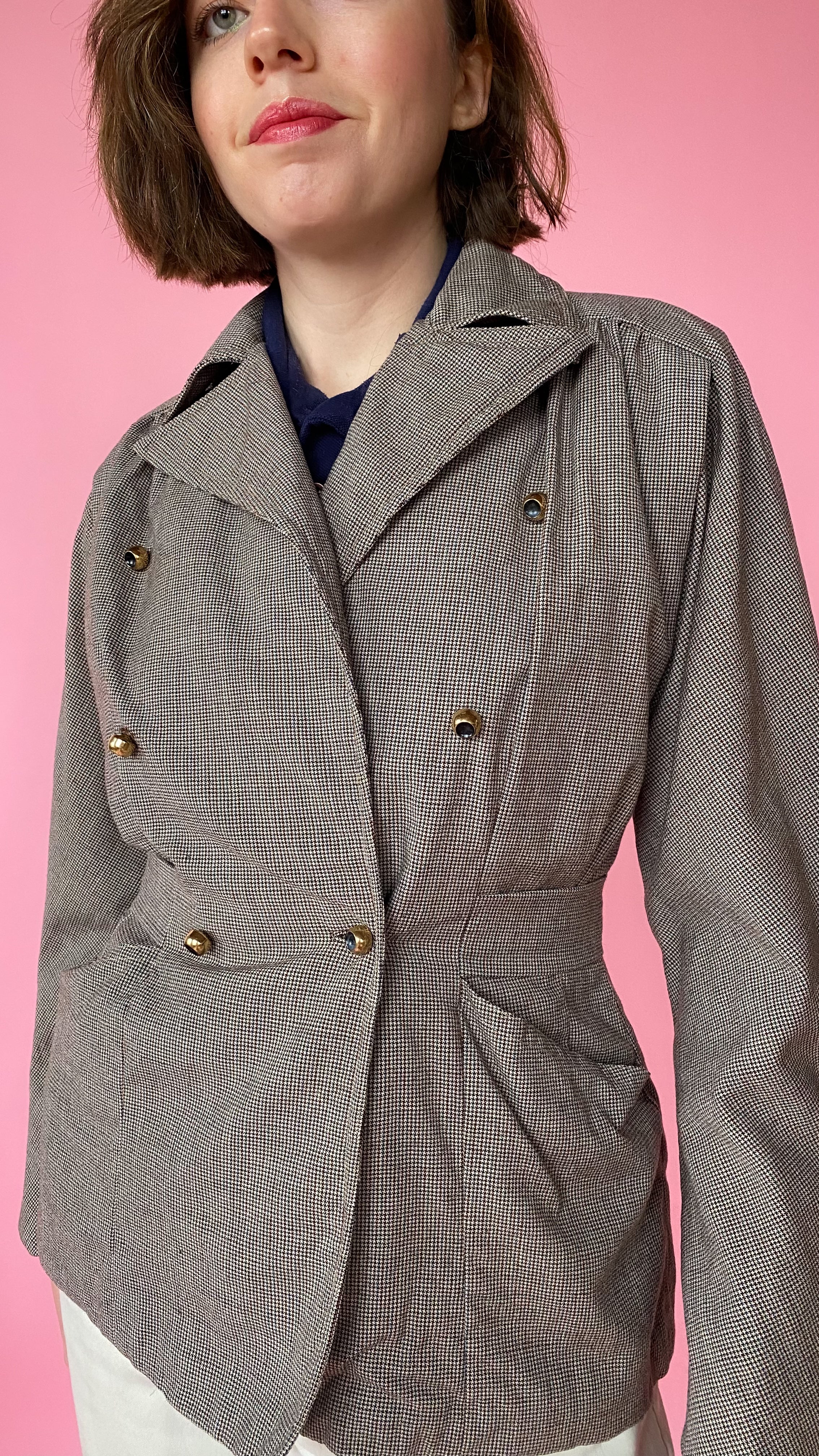 Brown, blue, and tan tweed jacket. Gold and dark blue decorative buttons. Belt around the back. Lined. Pockets.
