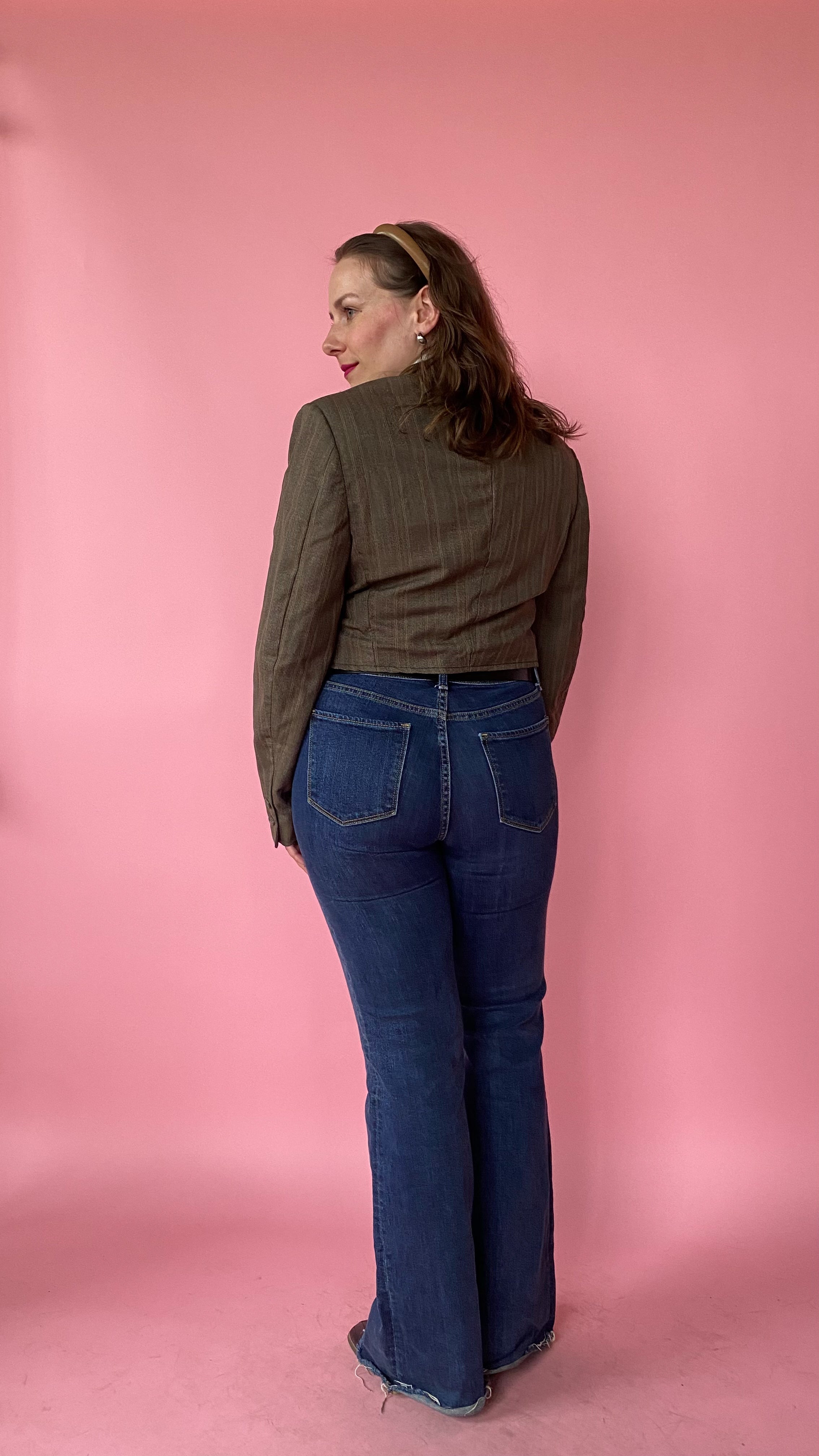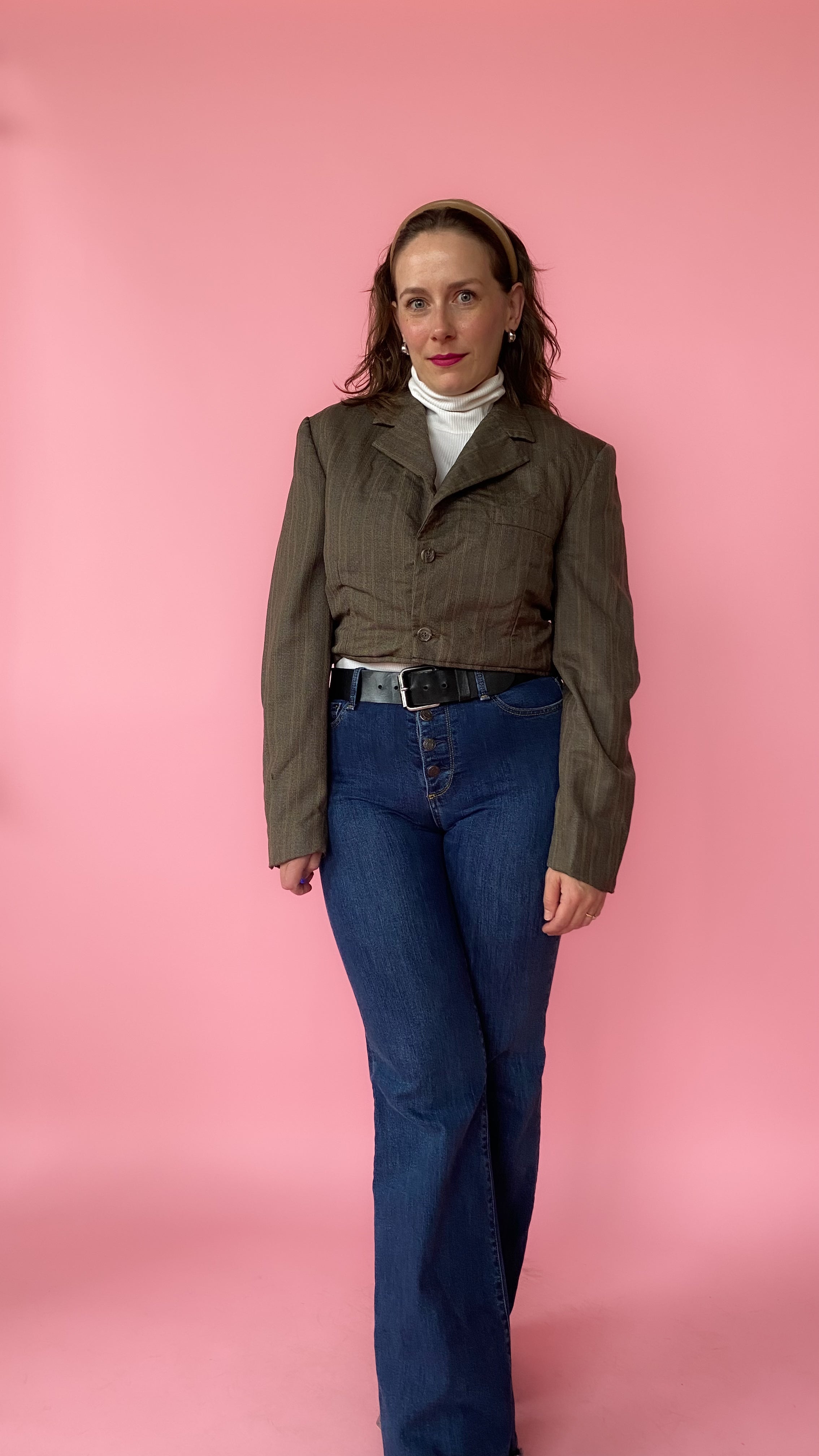 Brown and gray pinstriped cropped jacket. Buttons on the front. Lined. Chest pocket. Two interior pockets. Appears to have originally been longer and cropped later on.