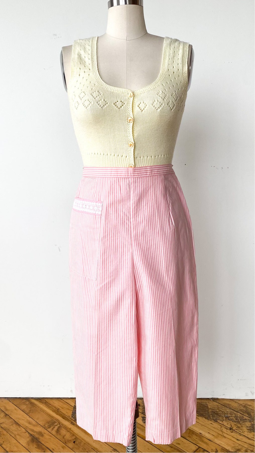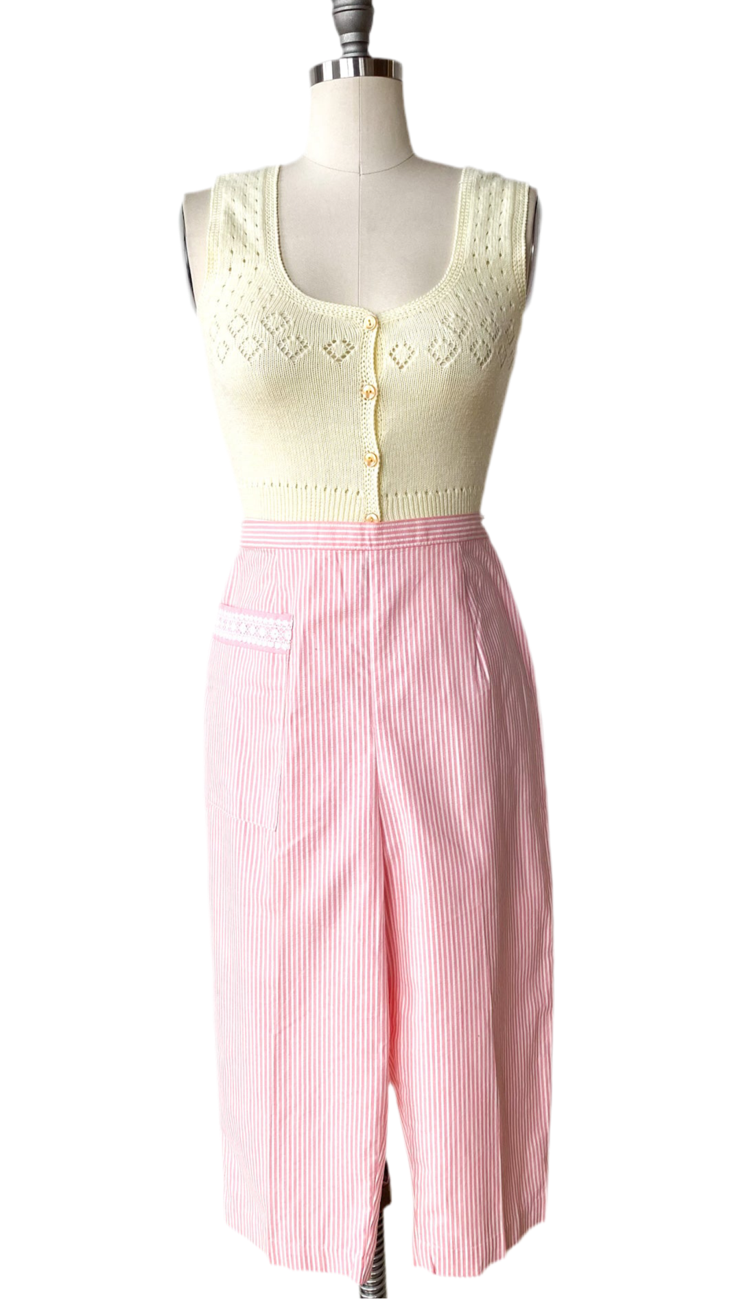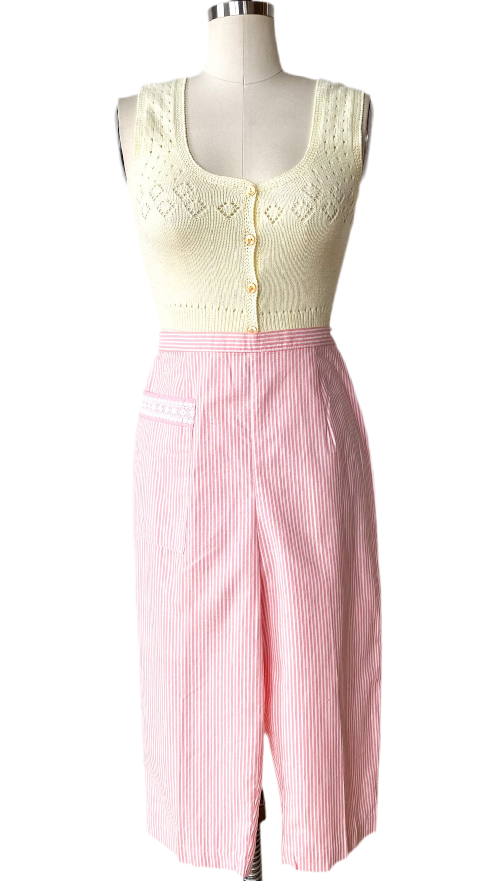 Description: Pink & white pinstripe capris; has side front pocket with lace trim. Has zipper in back & button closure at waistband.