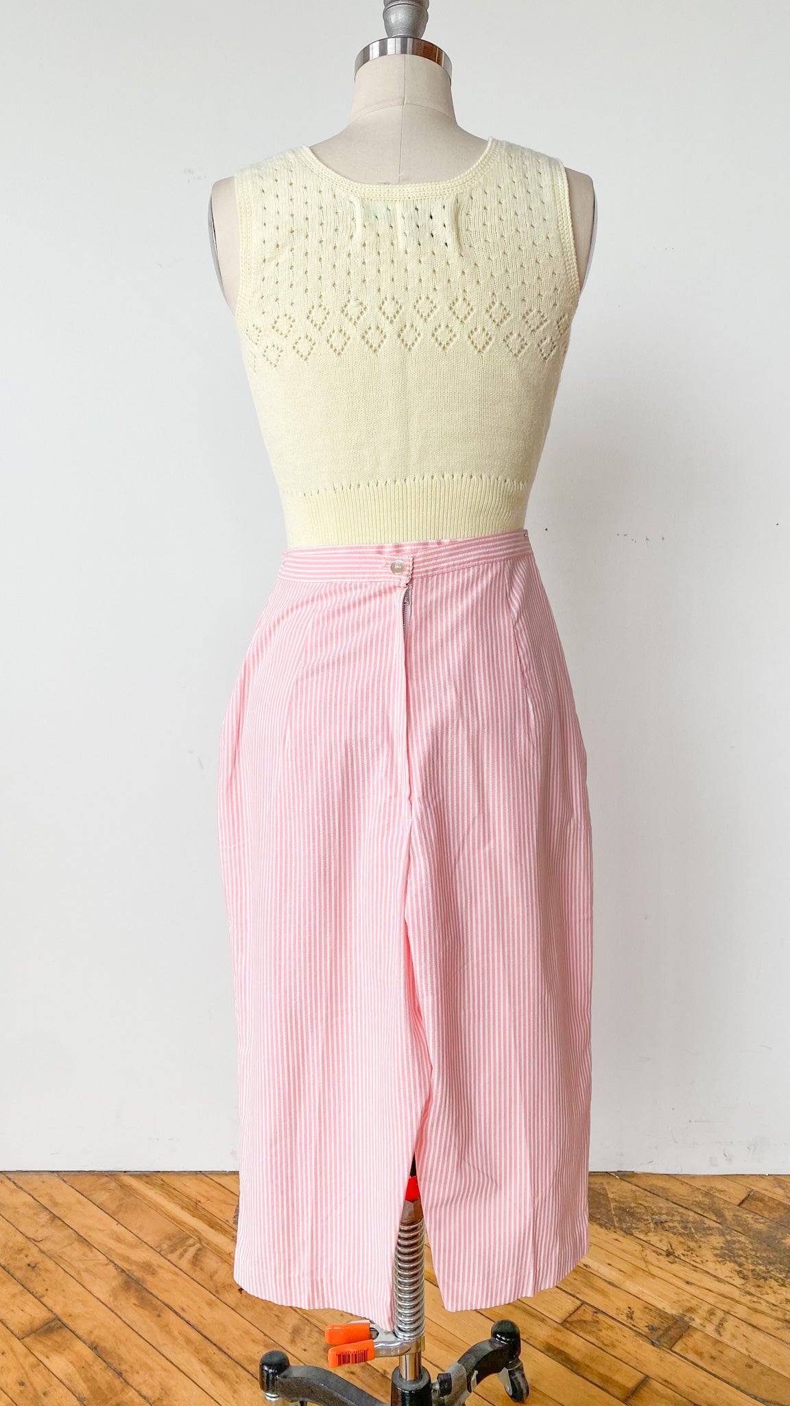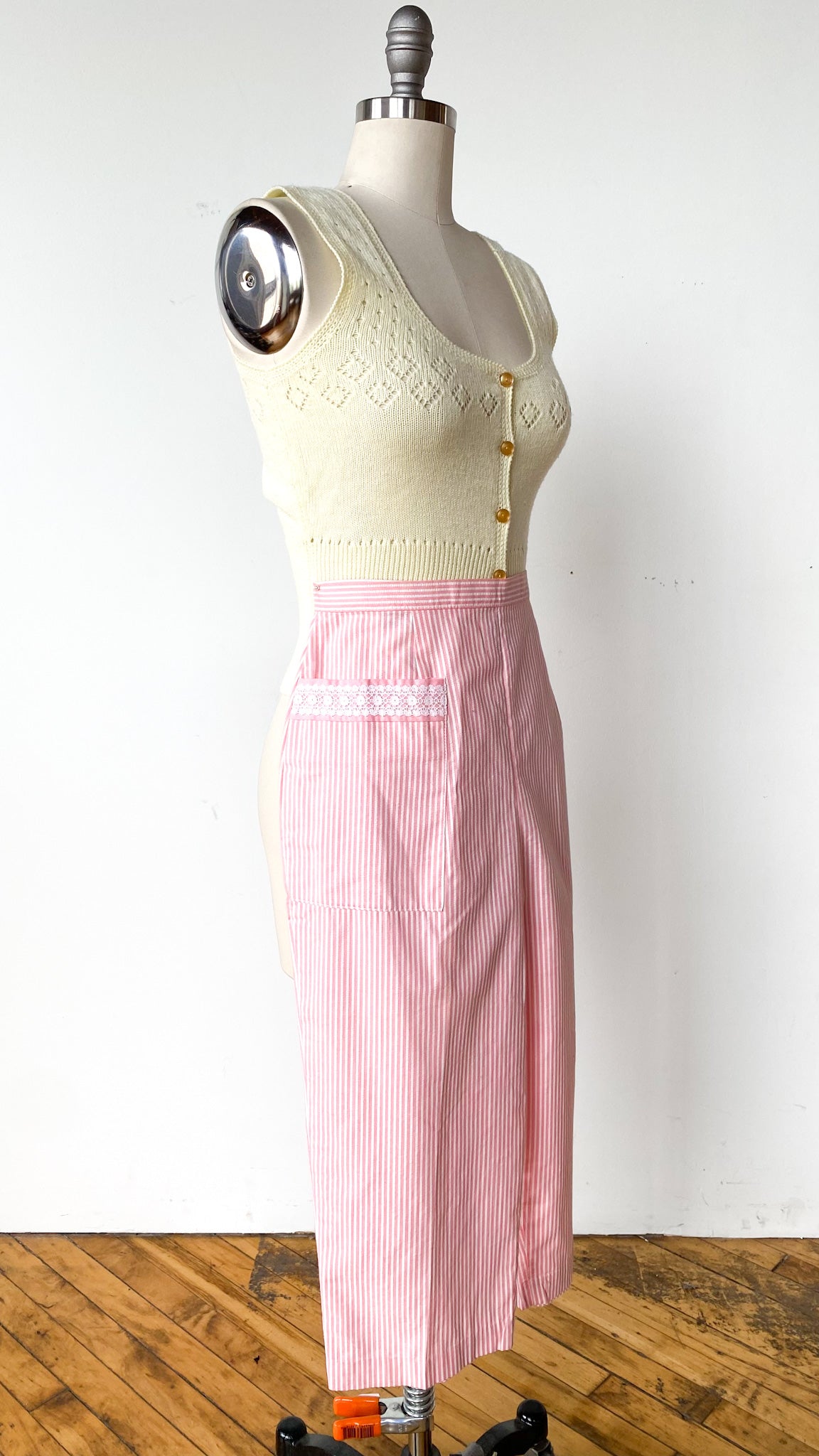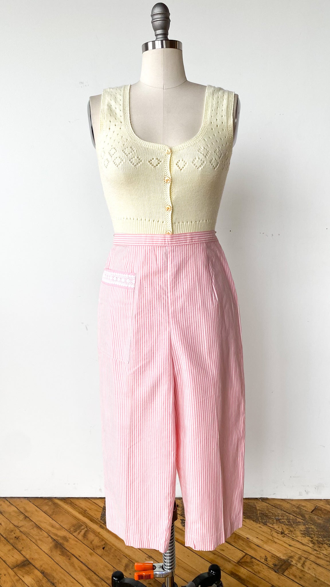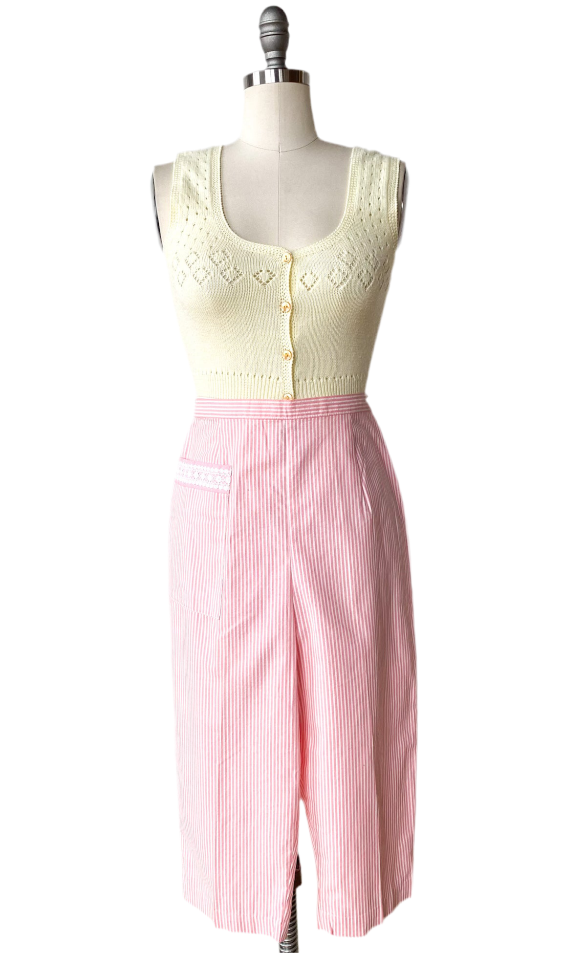 Description: Pink & white pinstripe capris; has side front pocket with lace trim. Has zipper in back & button closure at waistband.