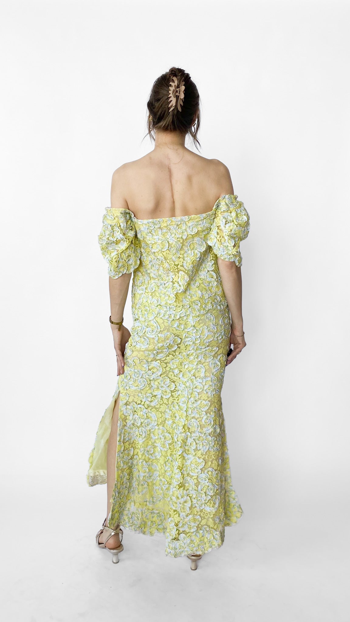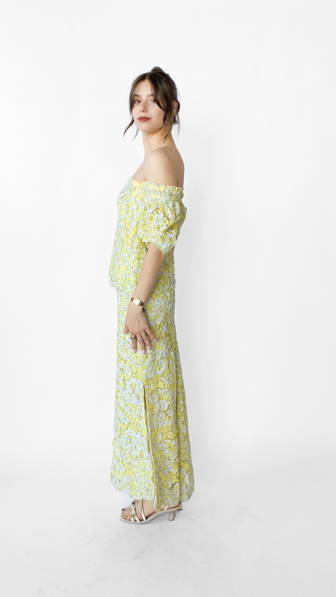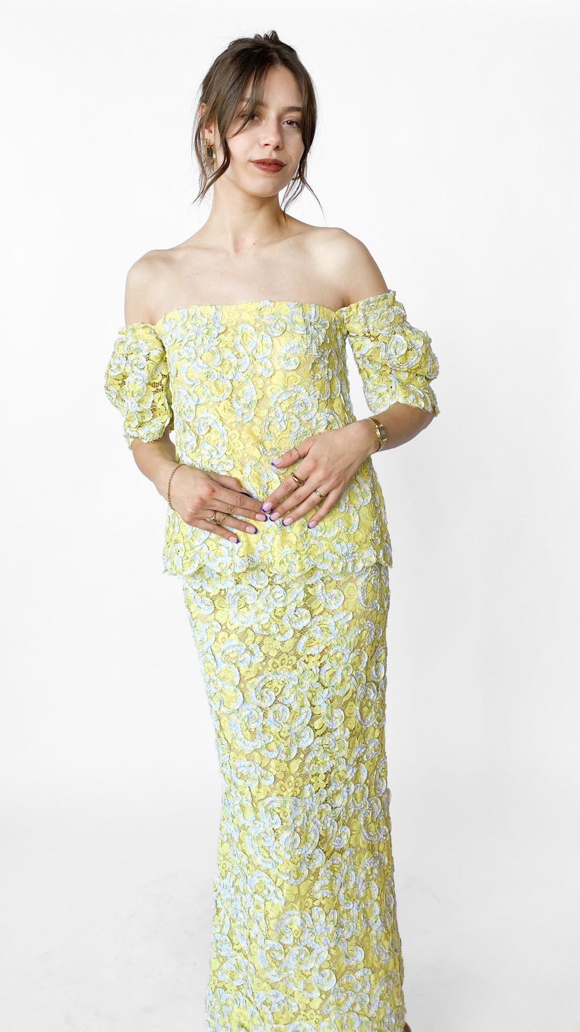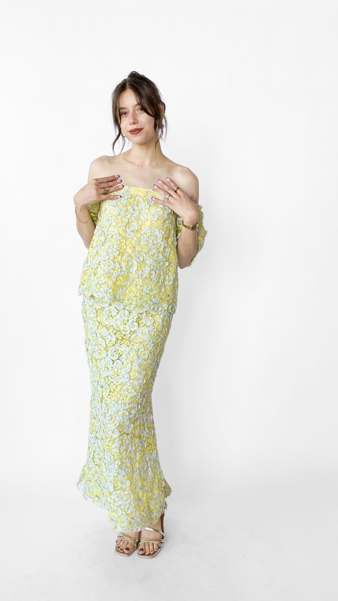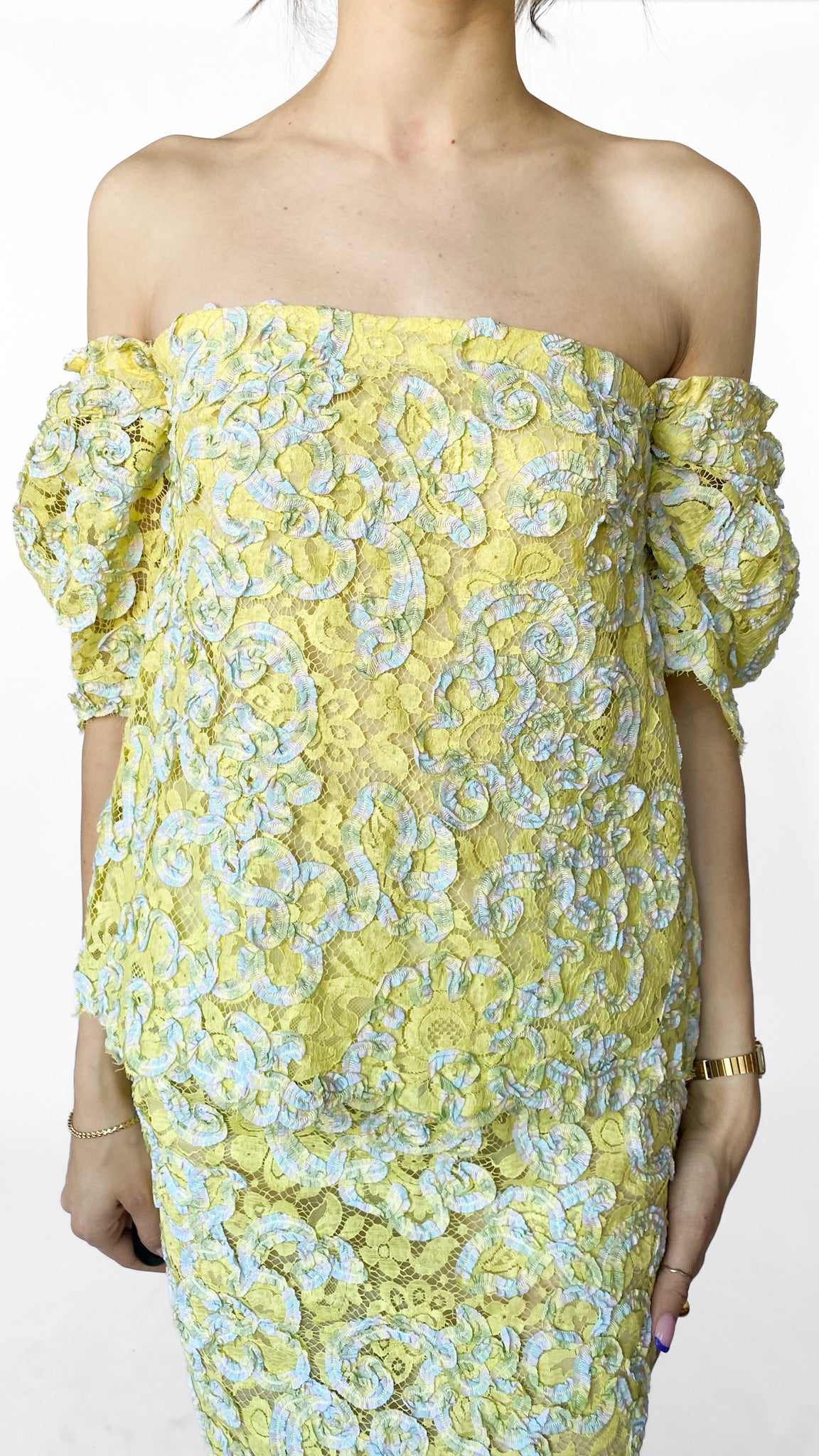 Description: Two-piece bright yellow lace top and skirt set. Yellow lace has pastel blue, purple and green swirly pattern on top and bottom. Top has zipper on side and skirt has clasp in back. Top has puffy shoulder sleeves. Skirt is form-fitting but flares out at bottom. There is inner lining on top and bottom. Can fit between an XS-M depending on bust size.