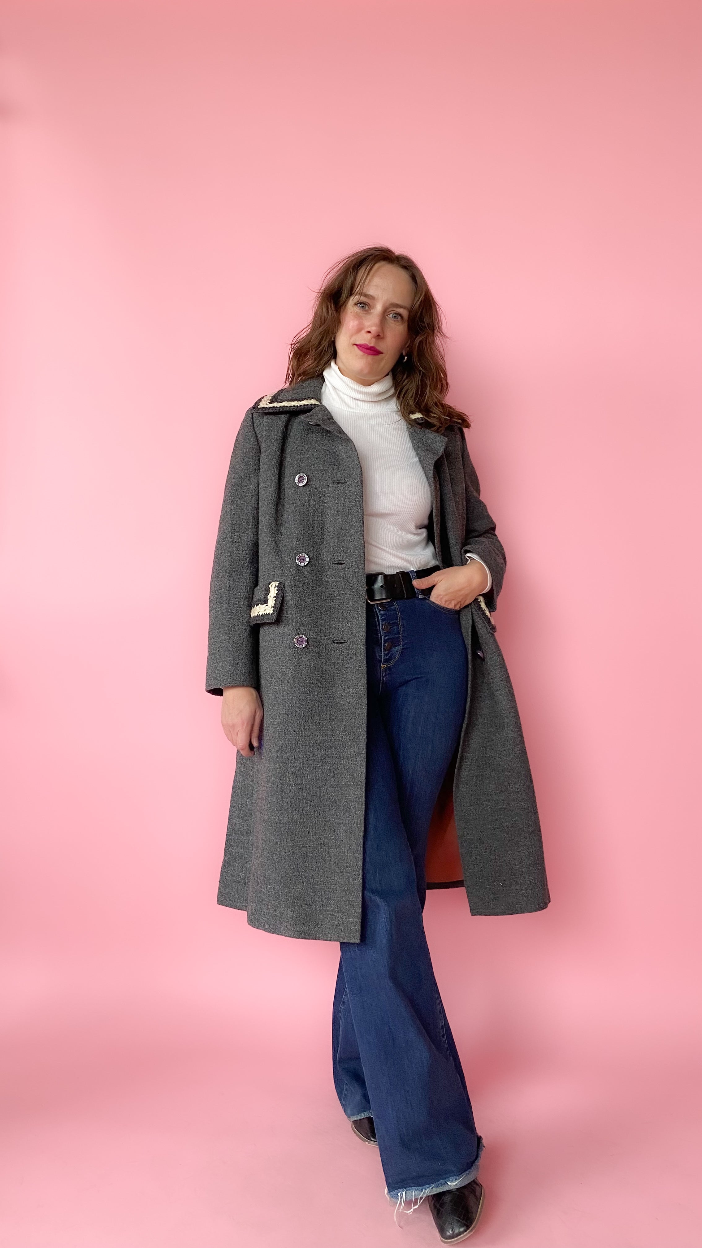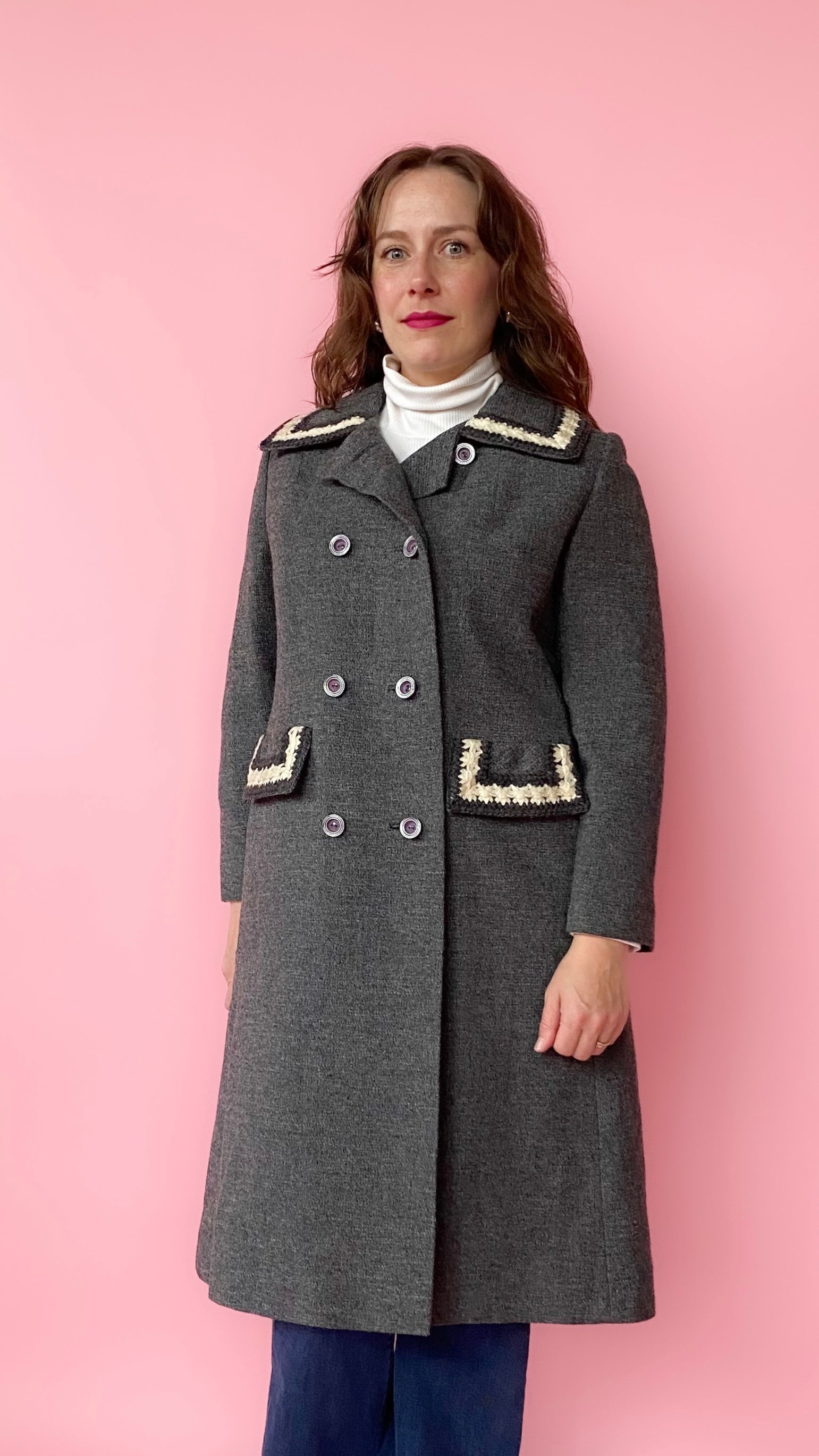 Dark grey double-breasted coat with decorative cream stitching on the collar and pocket flaps. Purple buttons. Lined.