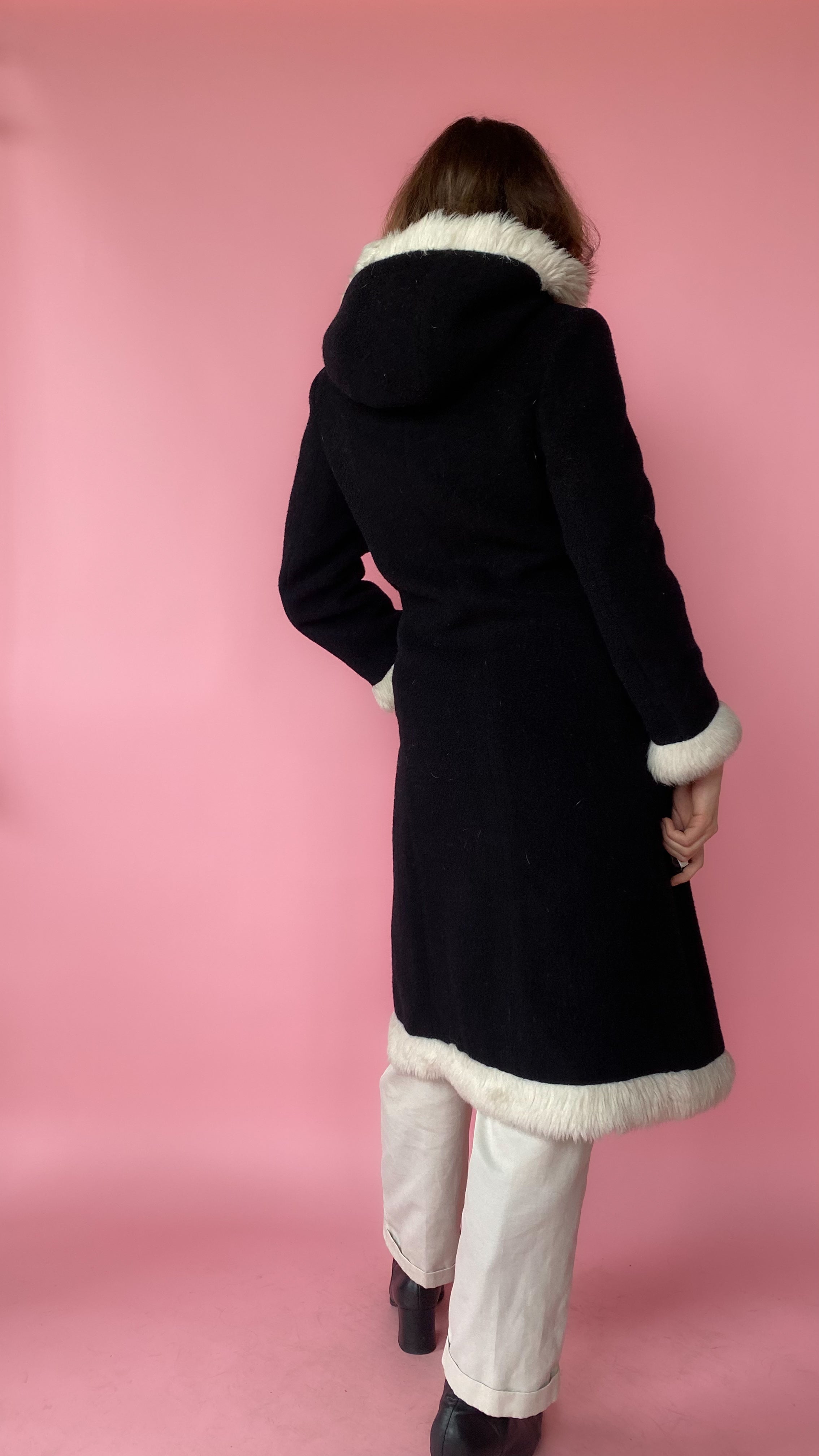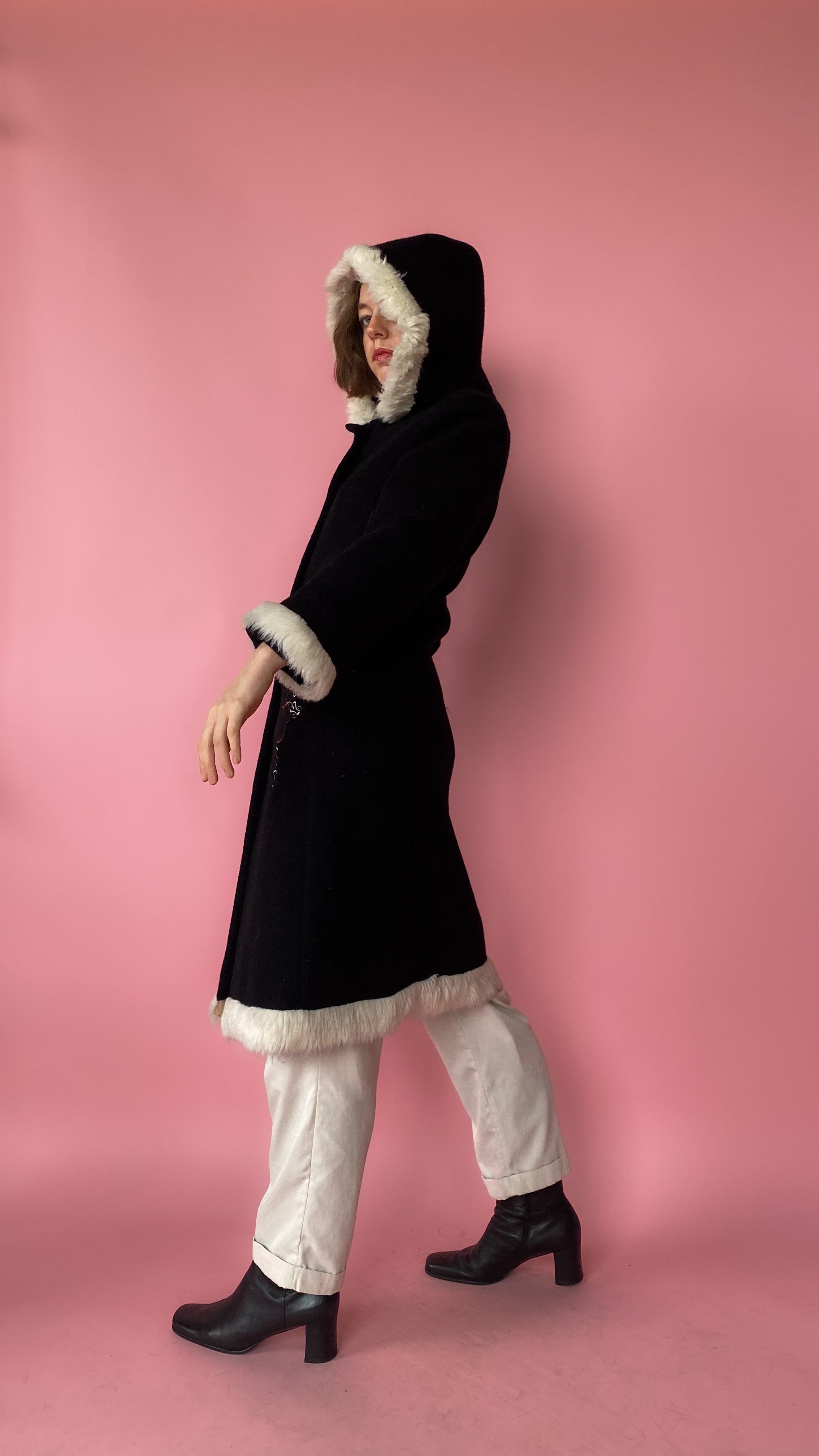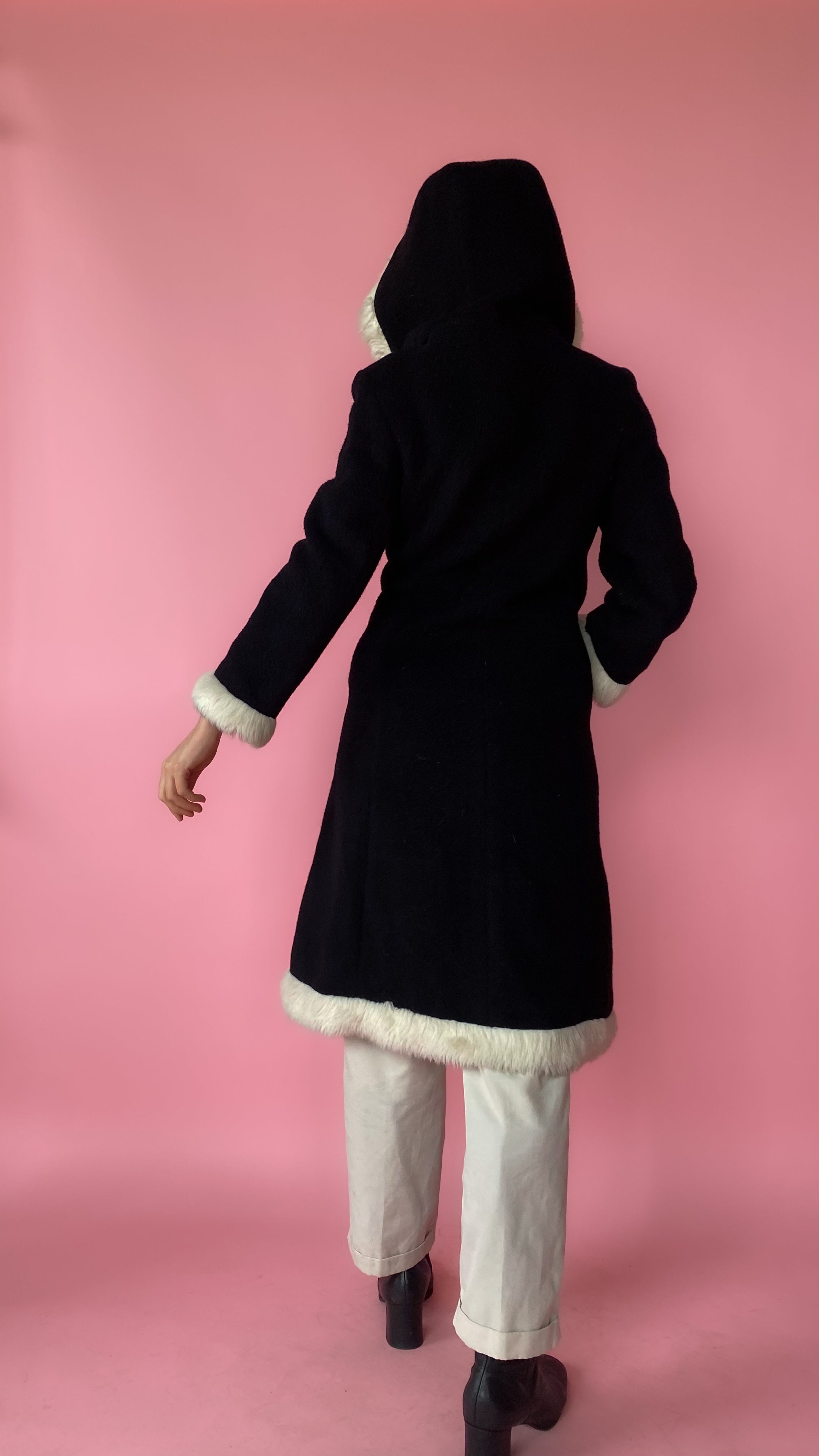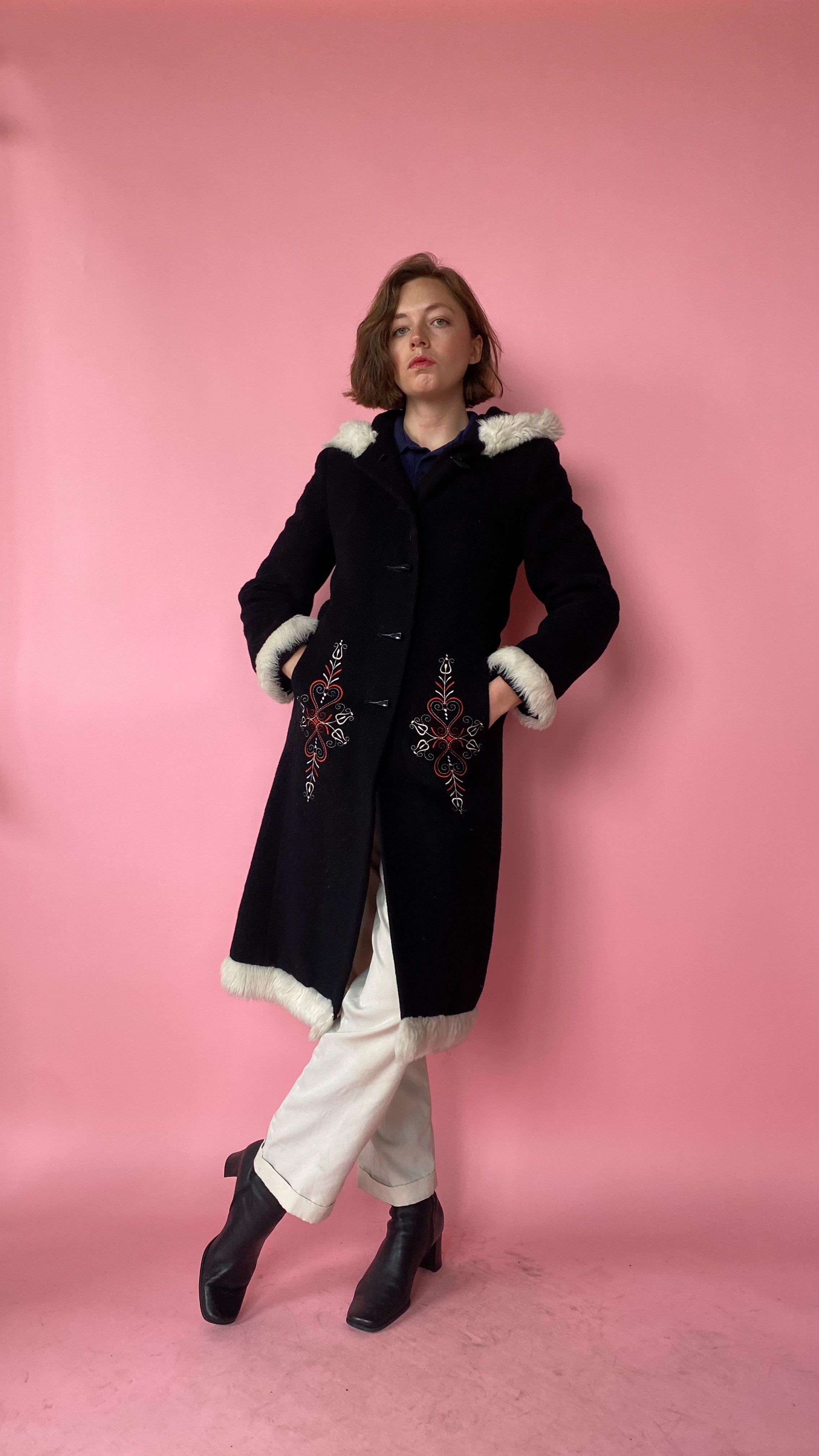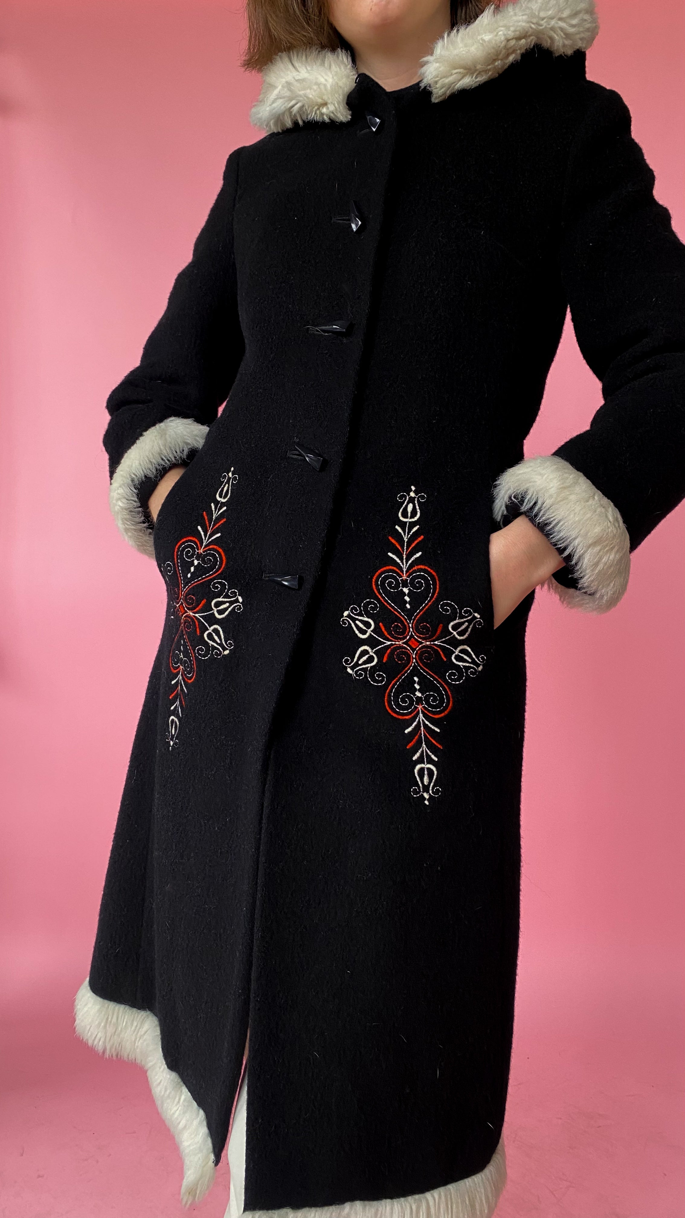 Long, black coat with faux-fur trim on the hood and cuffs. Red-orange and cream embroidery on the front. Black, triangular buttons. Lined. Pockets.