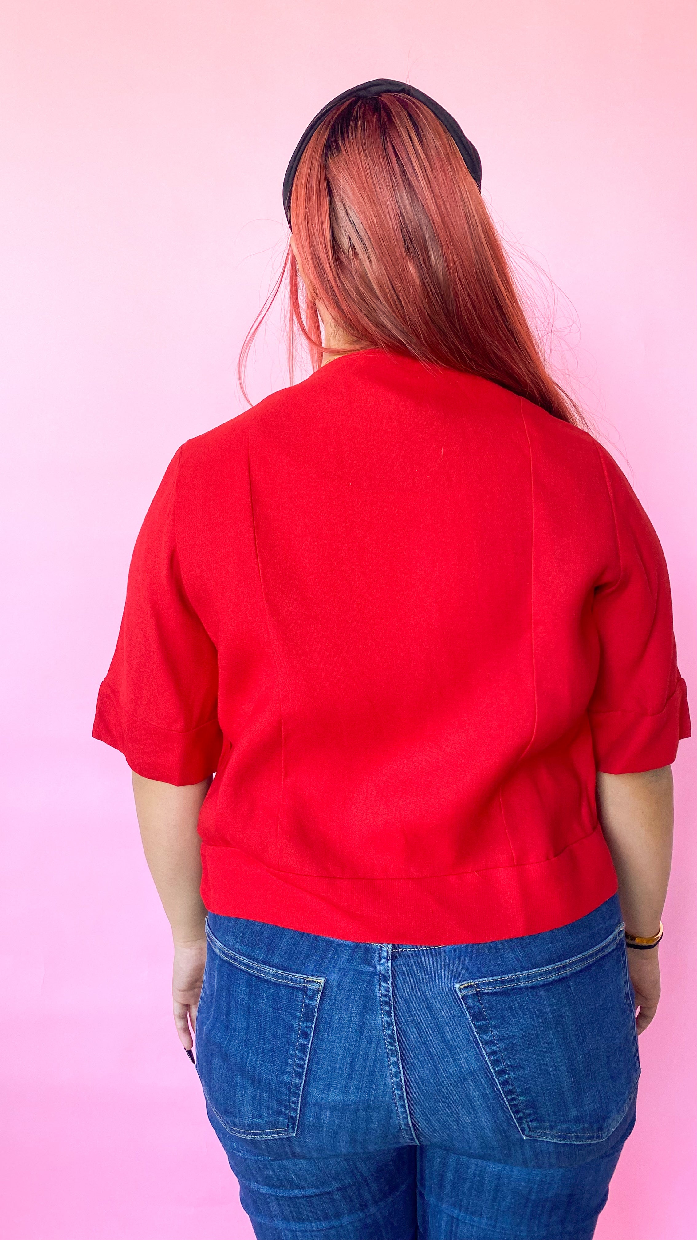Light-weight, red button up jacket. Big round buttons. Not lined.
