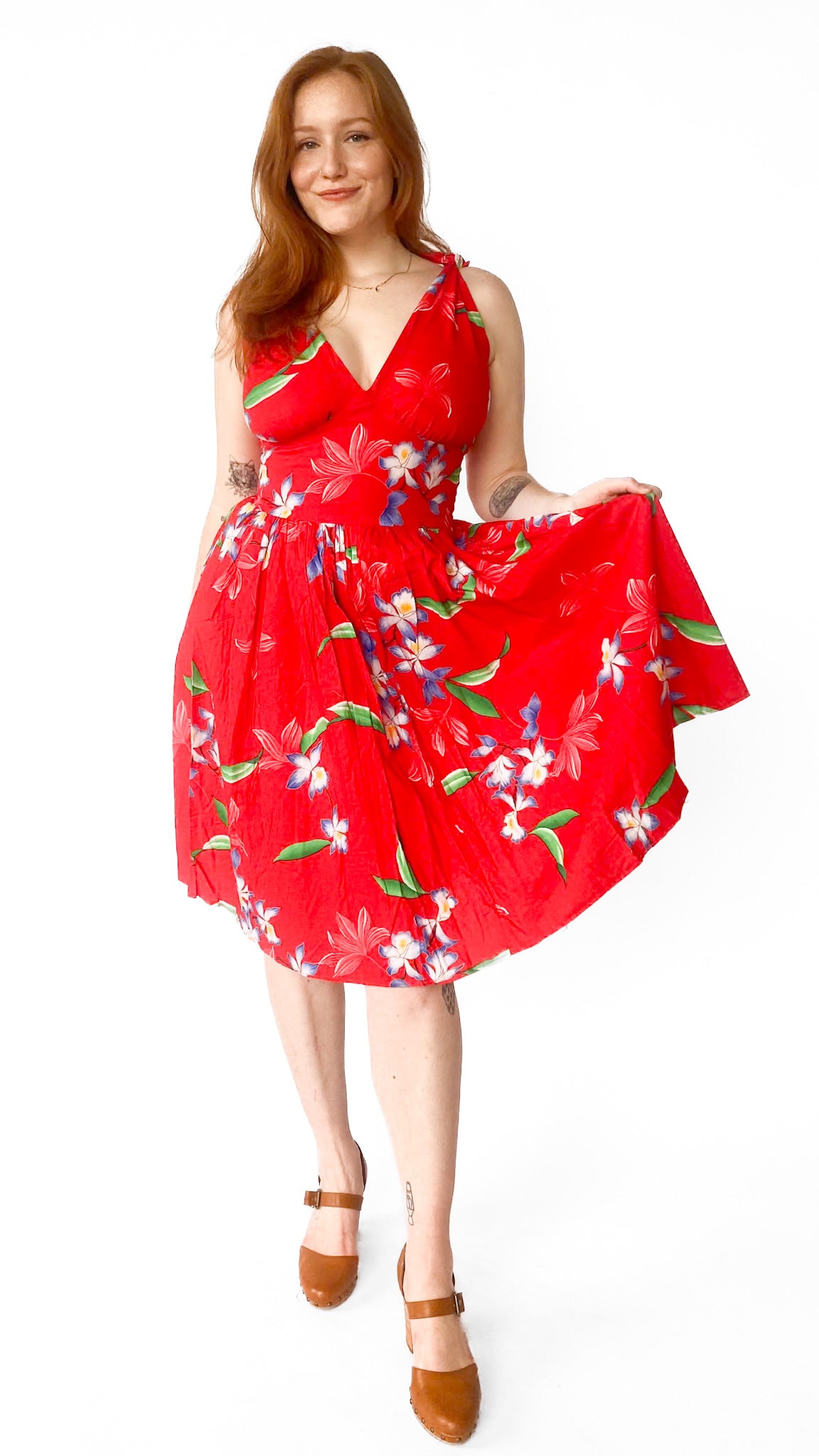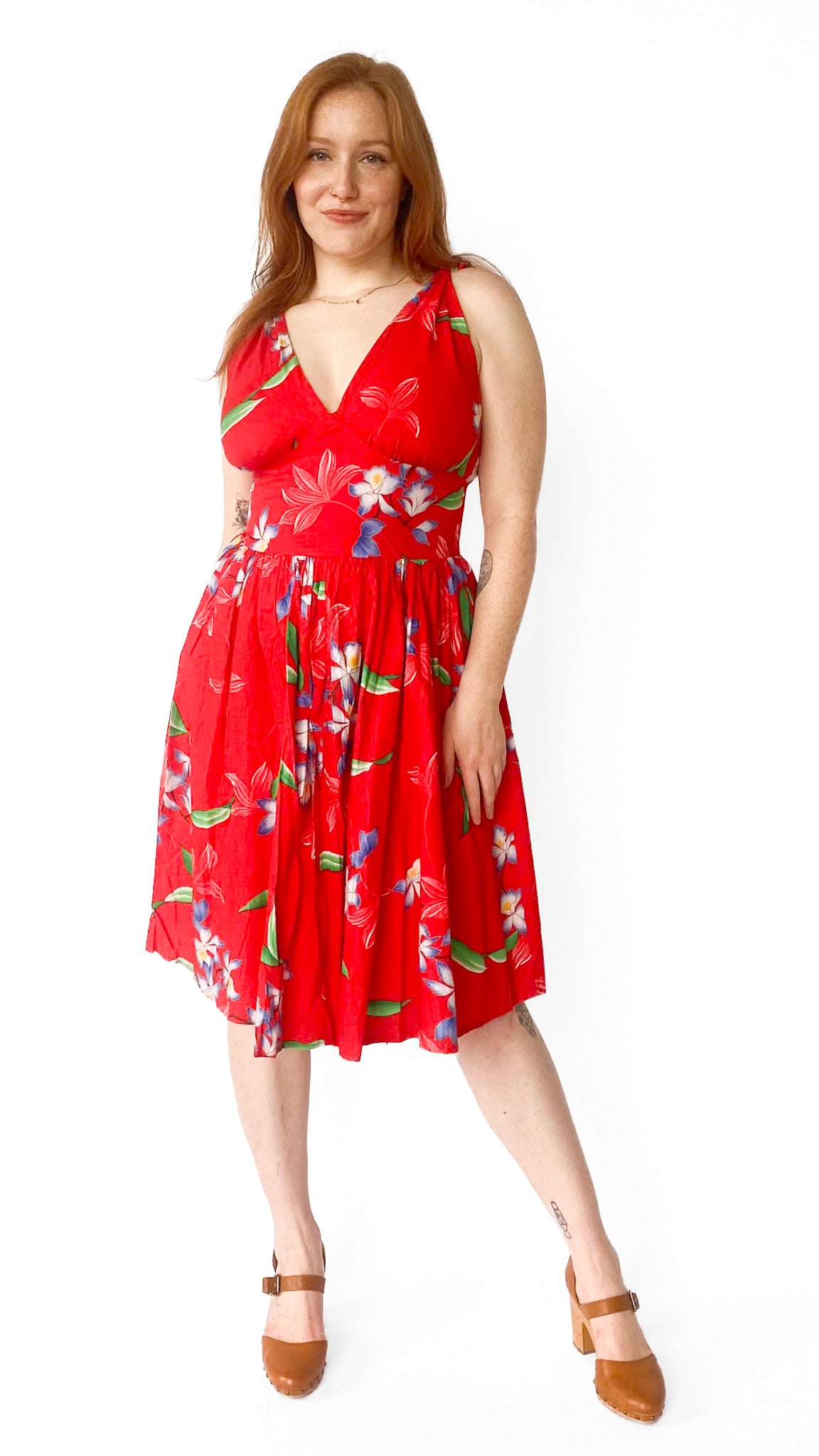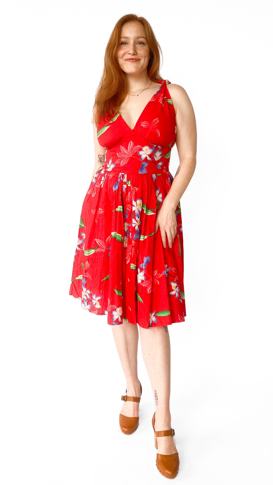 Description: Bright red V-neck dress with blue and green tropical print. The dress zippers in the back and the straps are tied, so you are able to untie them and adjust how you'd like. Dress is fitted under the bust and flares out below the waist.