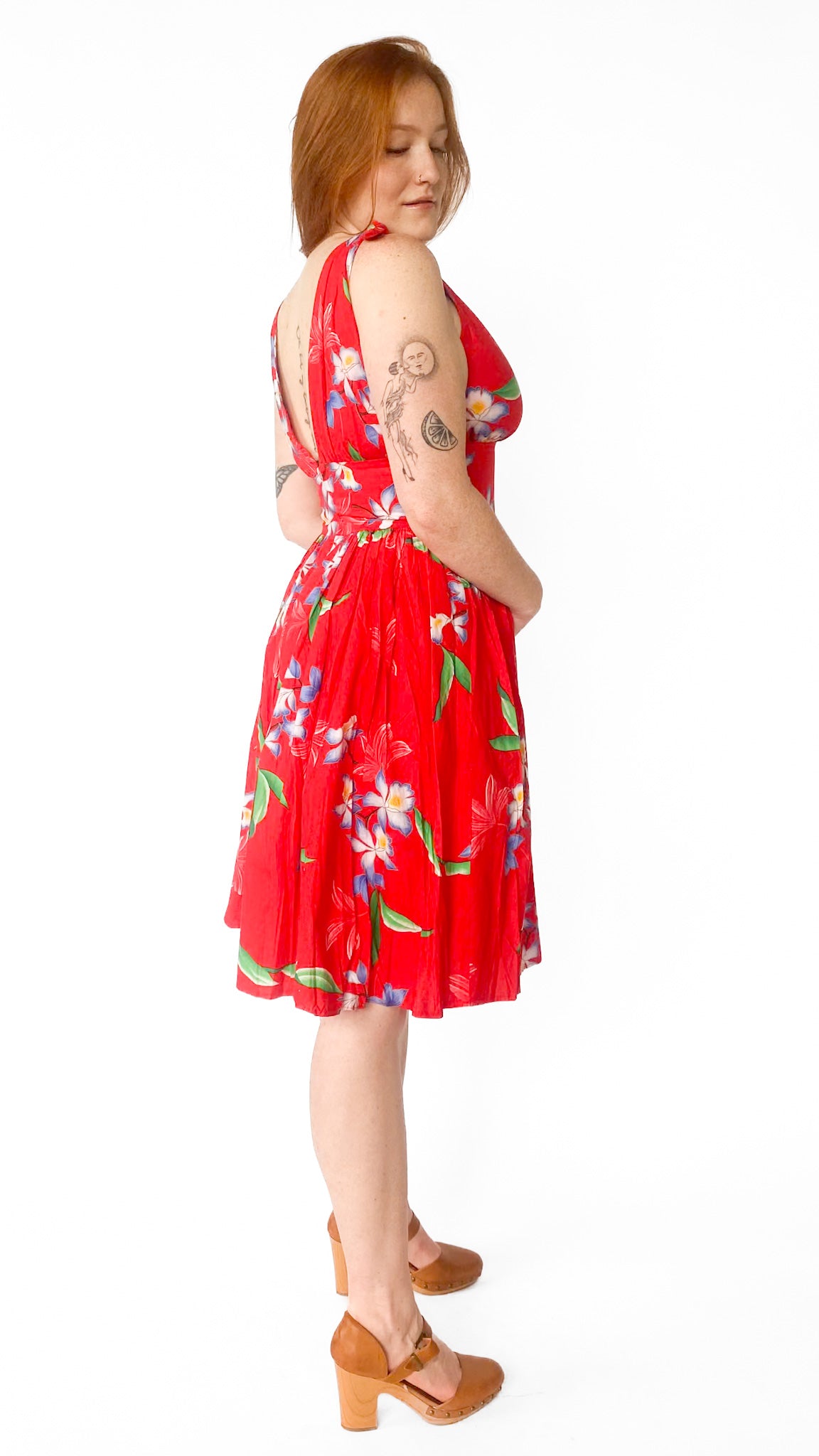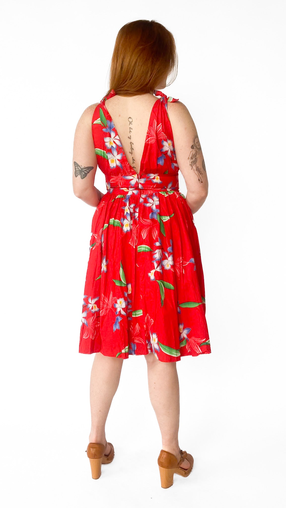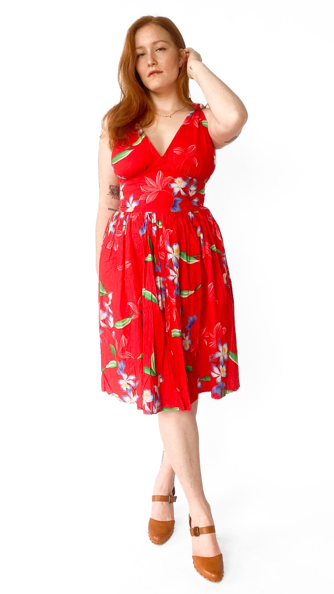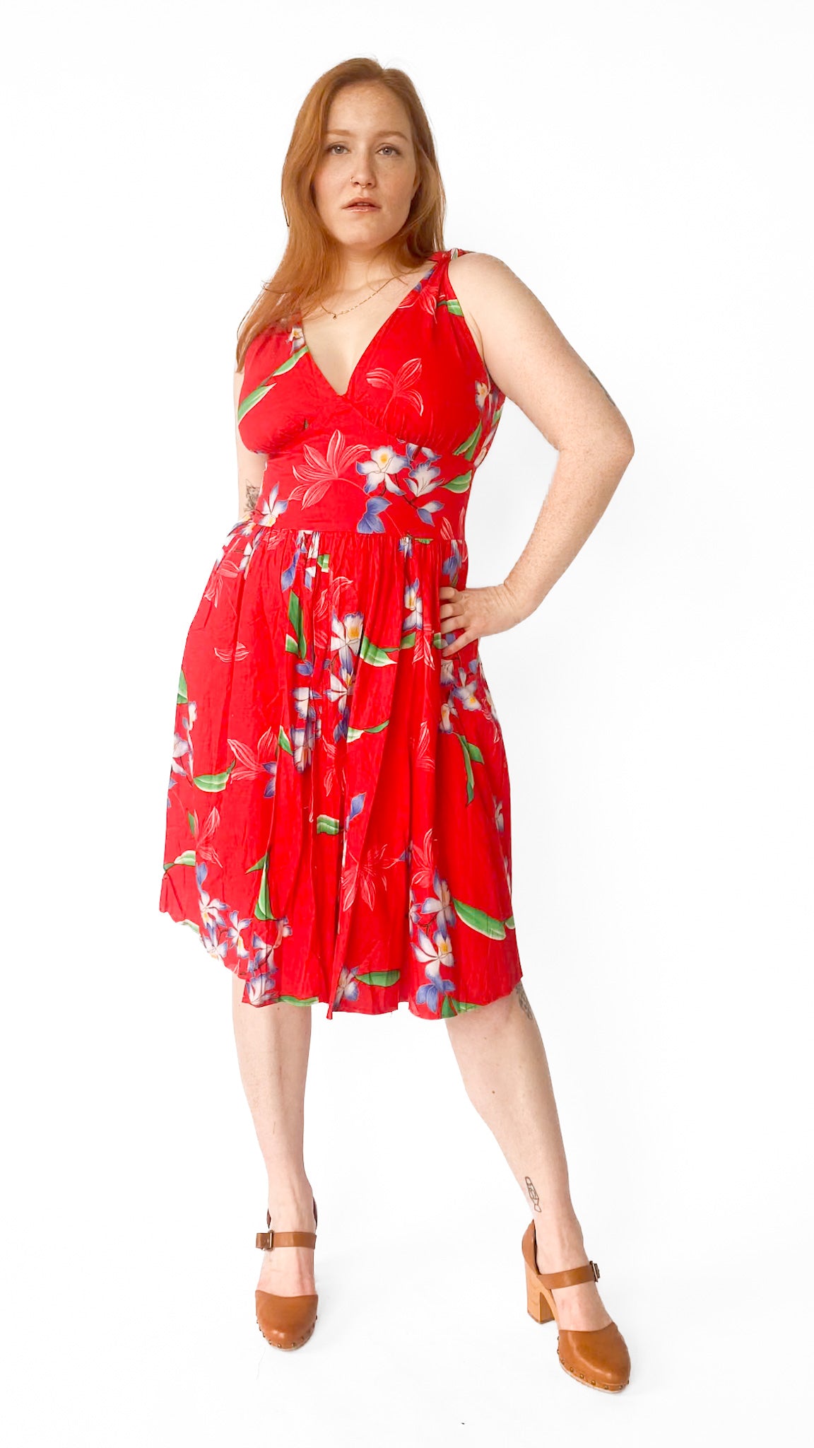 Description: Bright red V-neck dress with blue and green tropical print. The dress zippers in the back and the straps are tied, so you are able to untie them and adjust how you'd like. Dress is fitted under the bust and flares out below the waist.