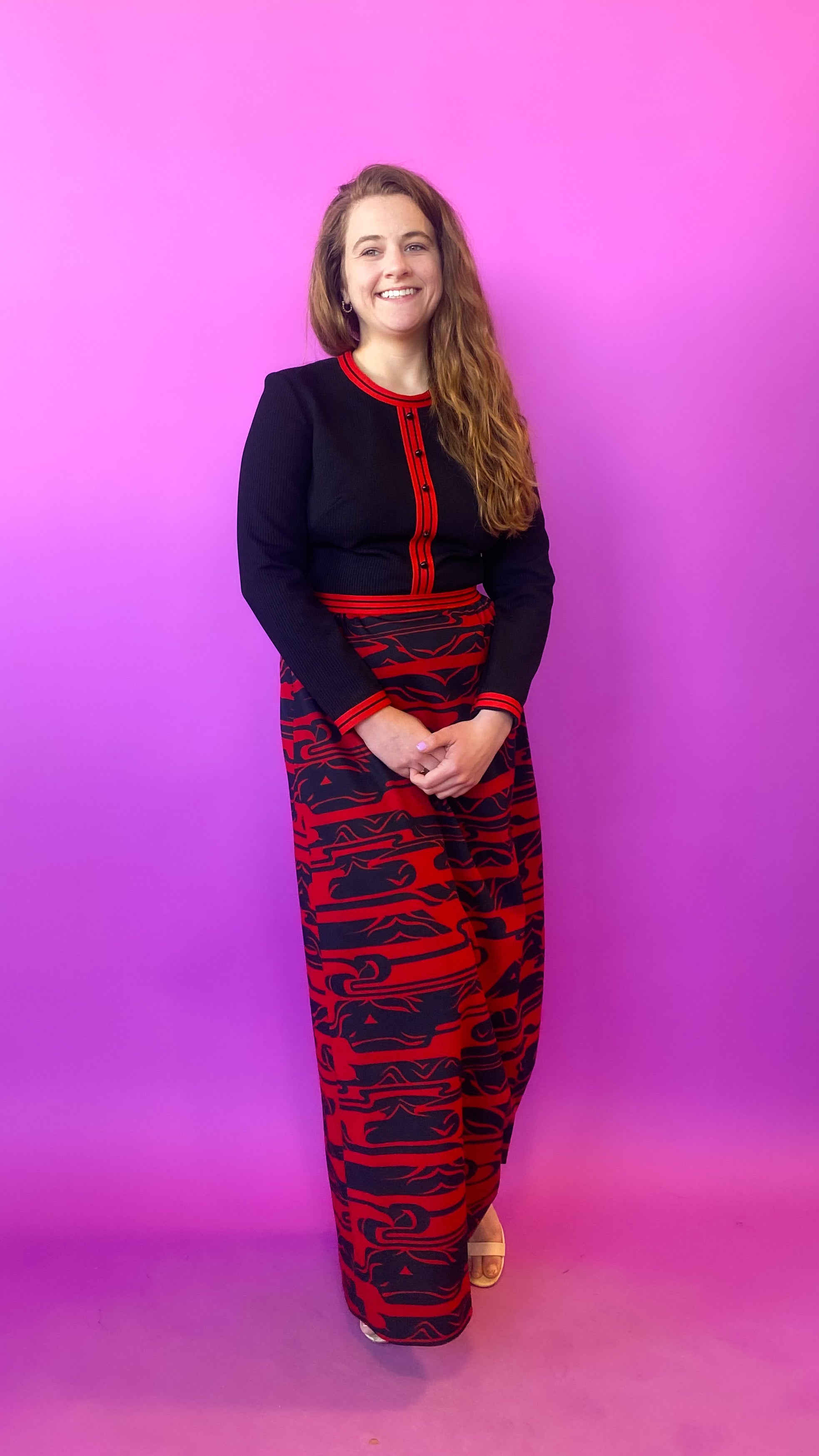 Description: Long-sleeved maxi dress with black top and red abstract print bottom. Red and black striped piping along waistline and on top with button detail. Buttons are not functional. Center back zip. Bust and hips have some stretch, but waist measurement has no give. Can fit a small or medium depending on measurements.
