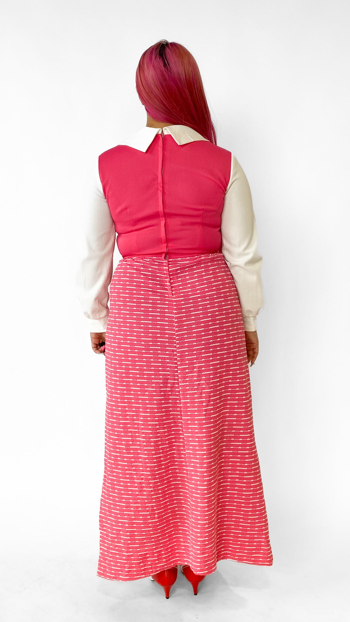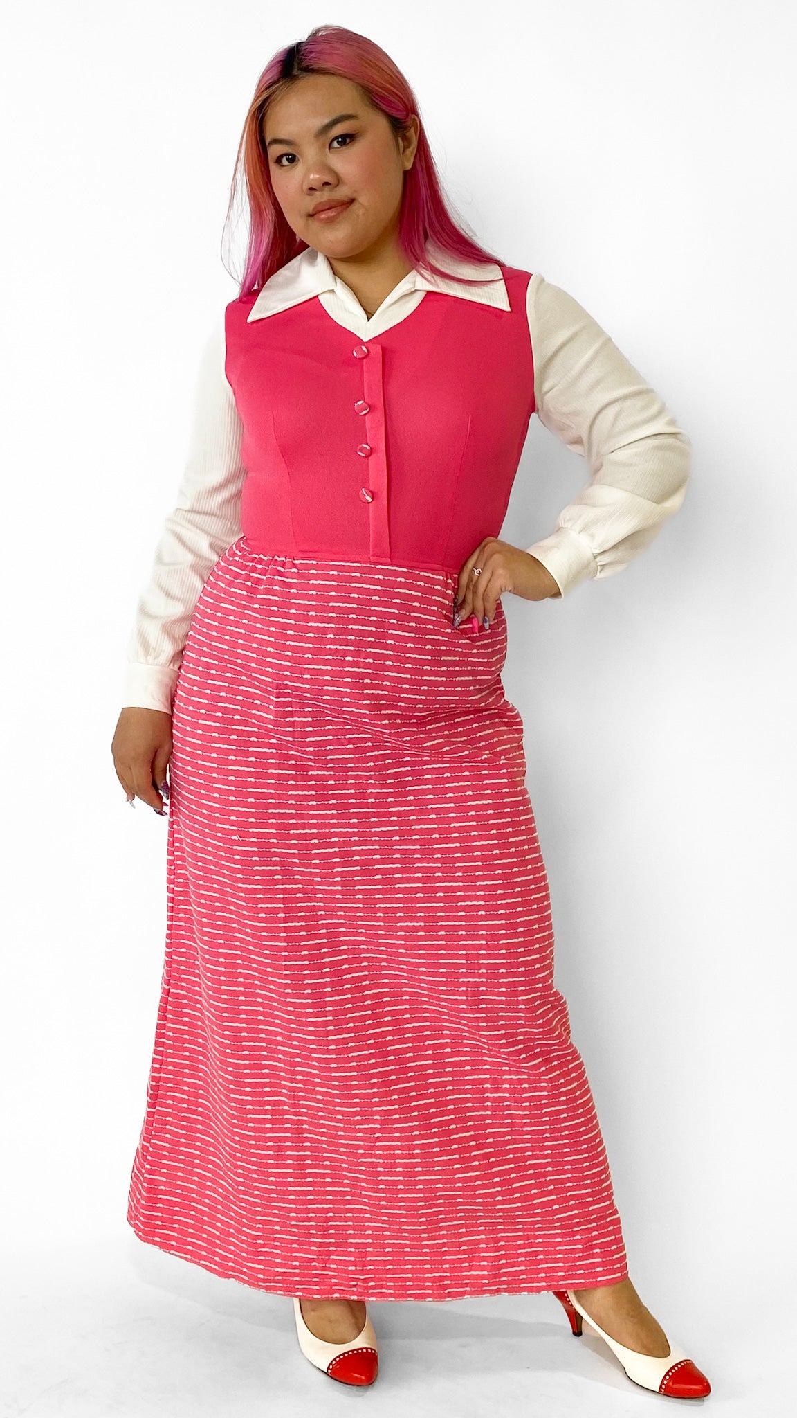 Hot pink and white maxi dress with collar & faux buttons down to waist. Skirt has white & pink striped pattern. Dress has zipper closure down center back, and is unlined.