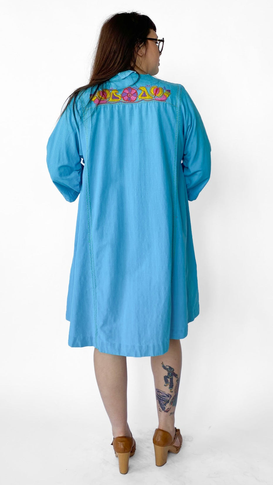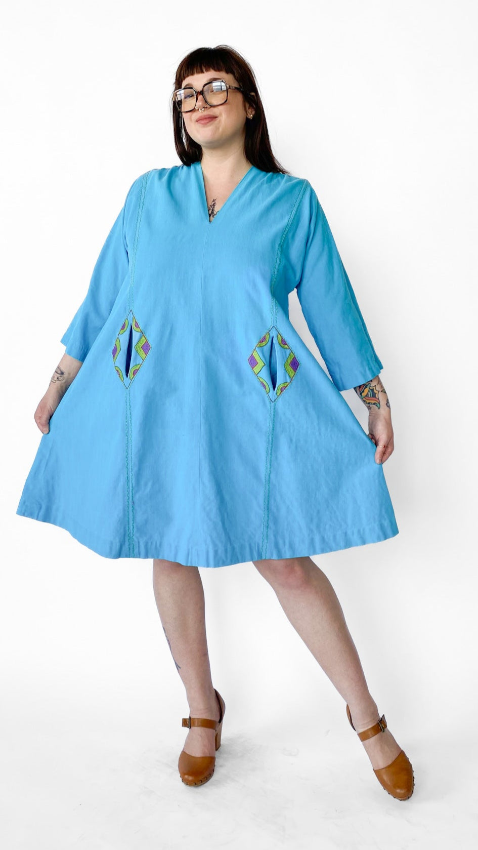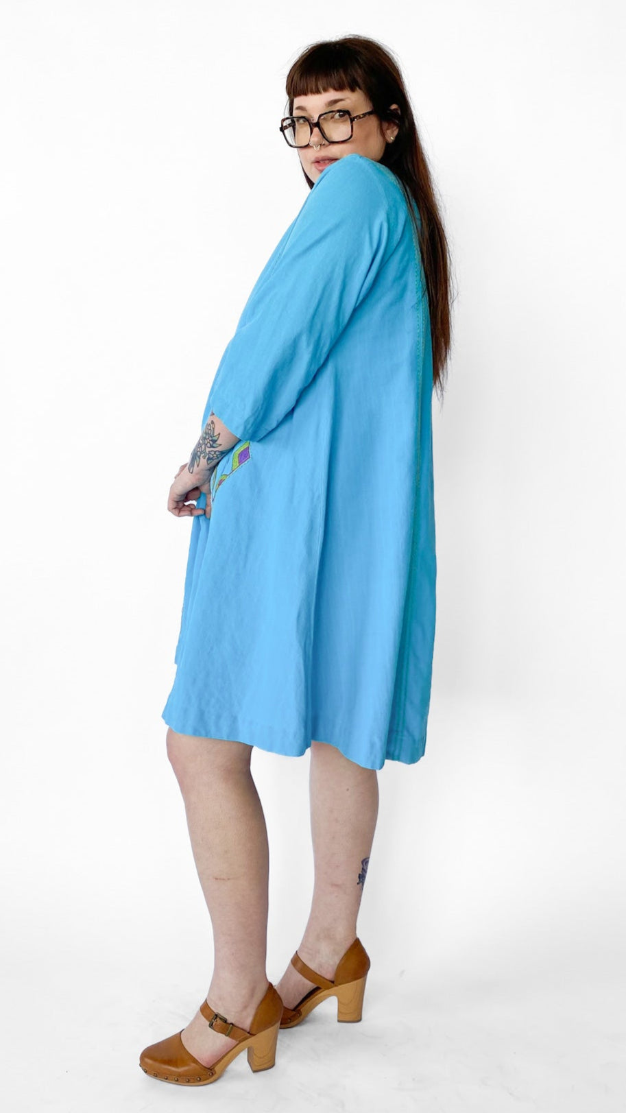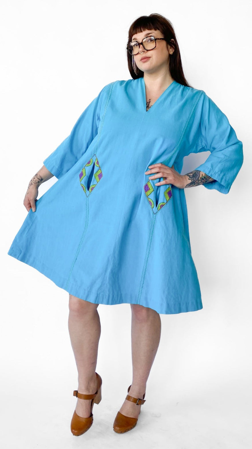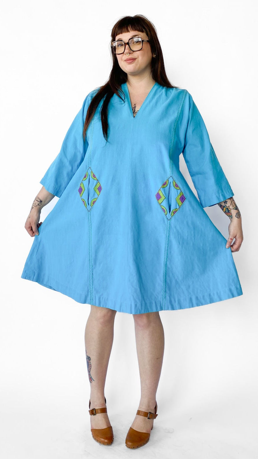 Description: Bright blue tunic style dress with 3/4 sleeves and two front side pockets. Colorful geometric and floral hand embroidery on dress. No closures. Comes with matching belt.