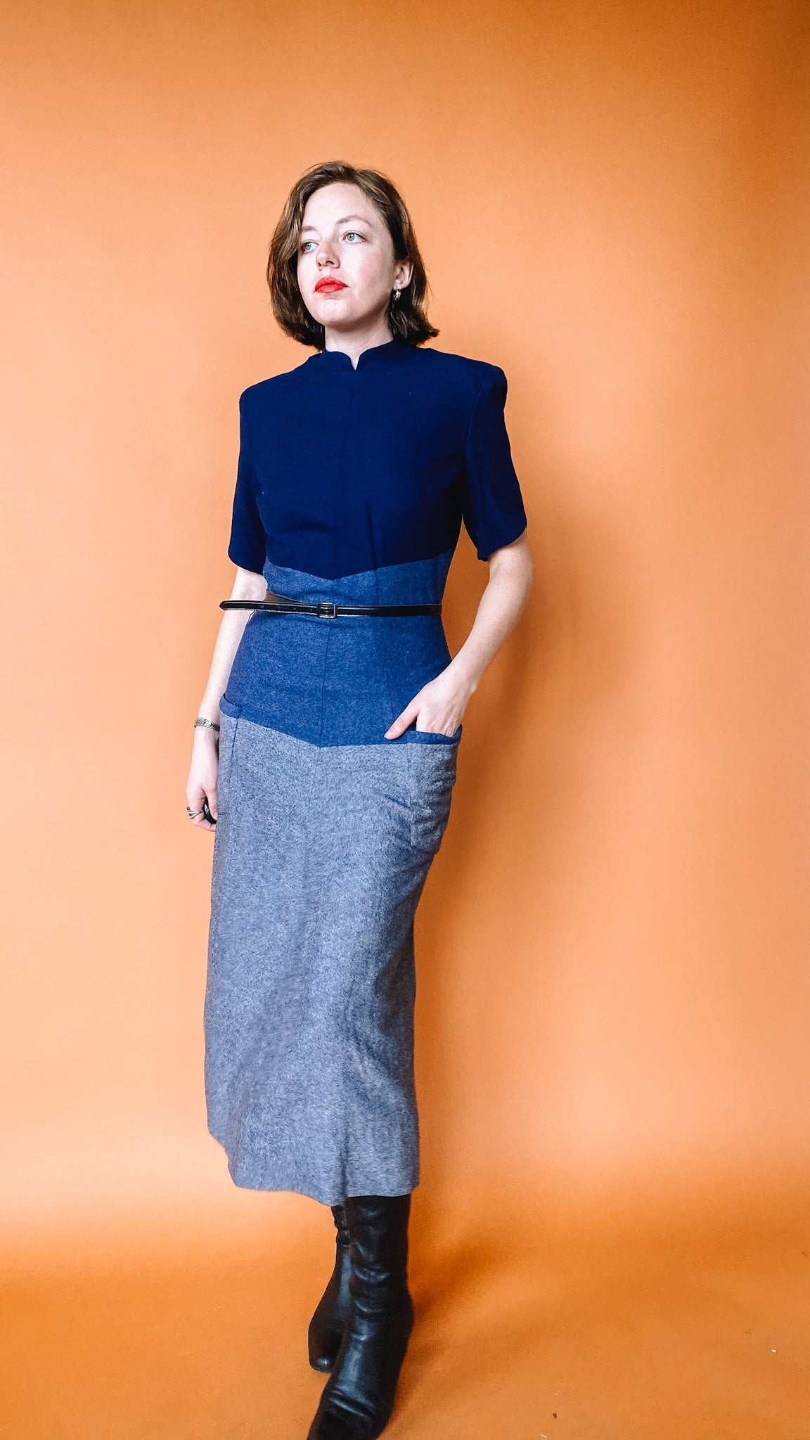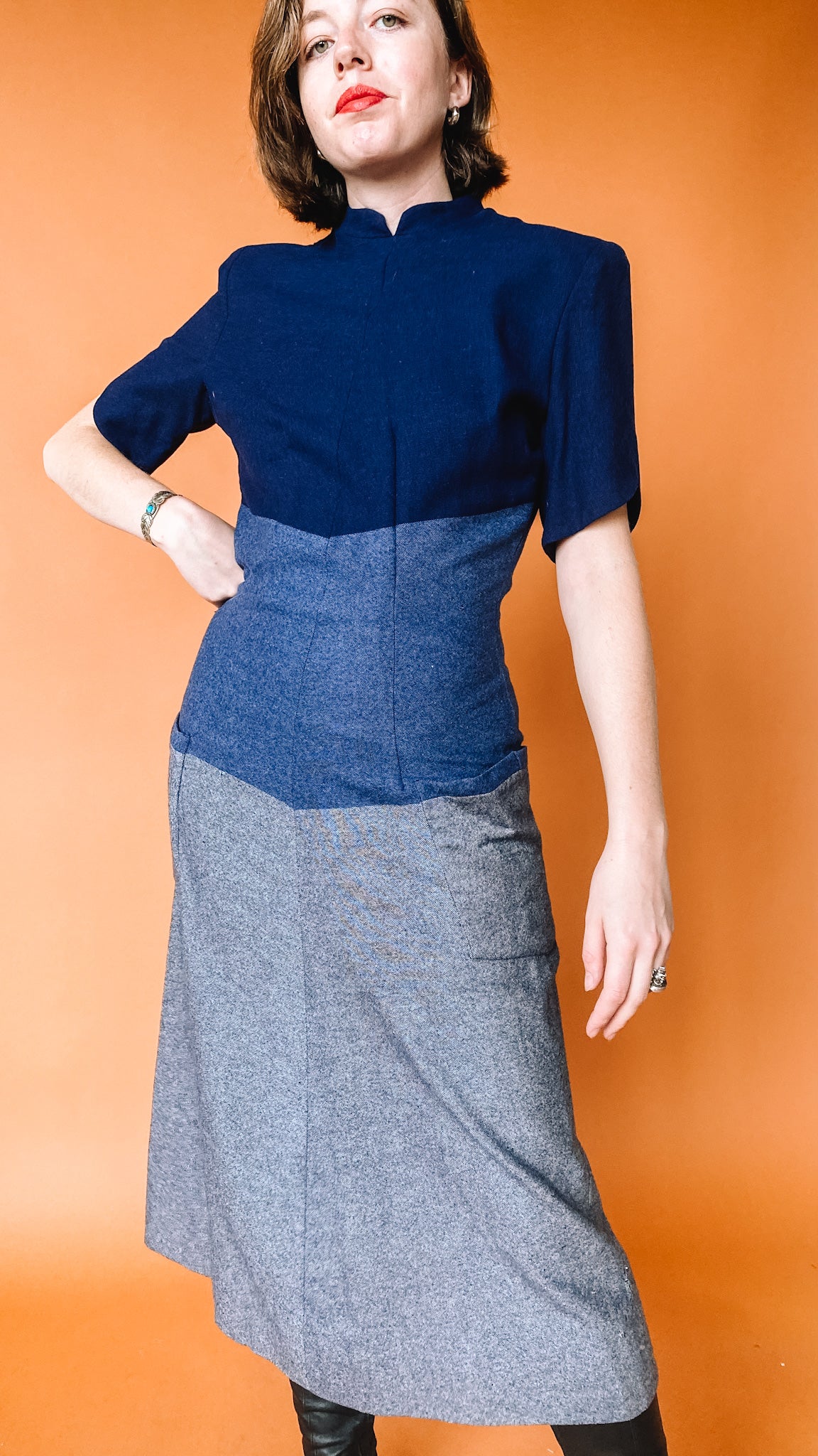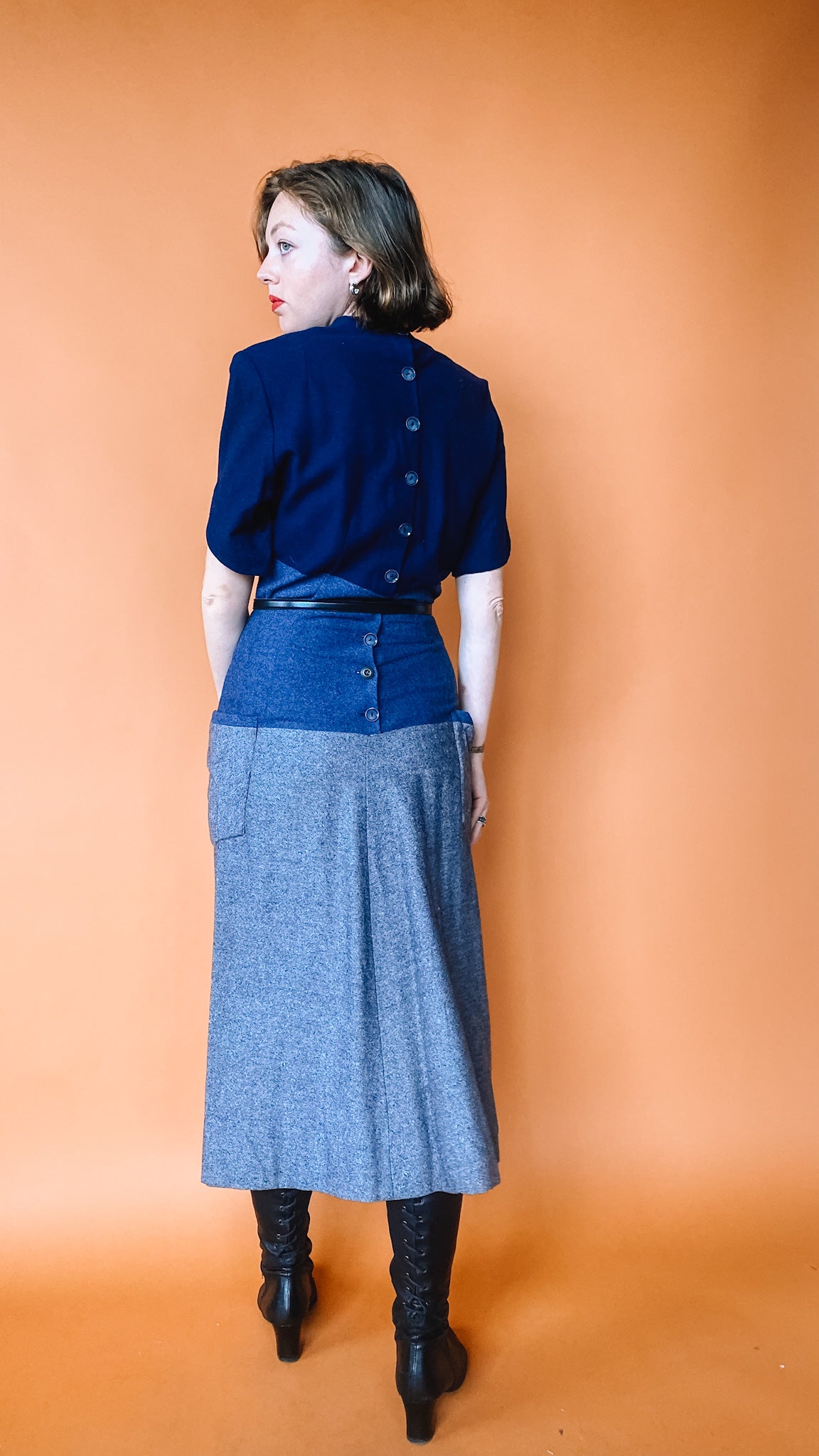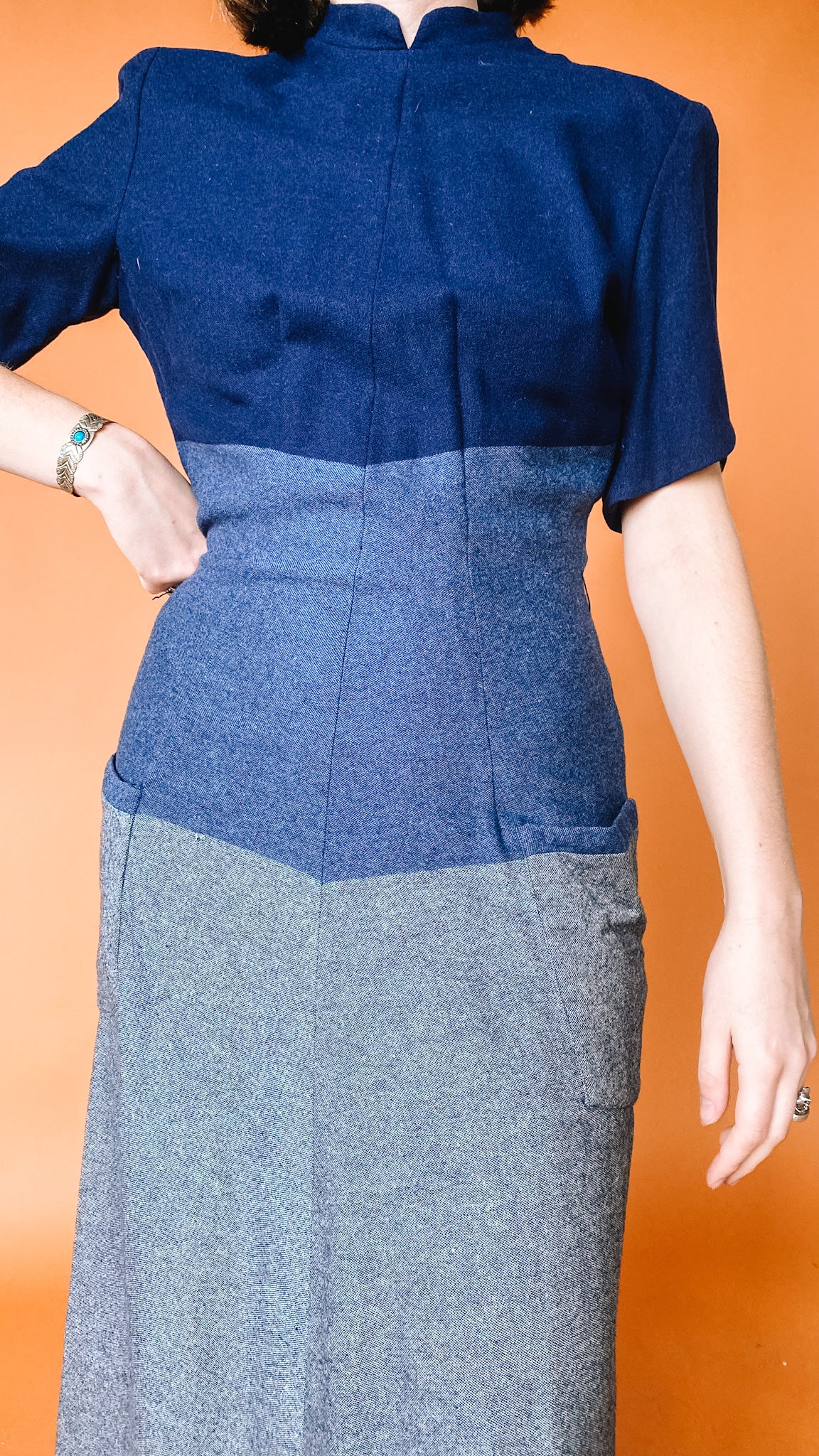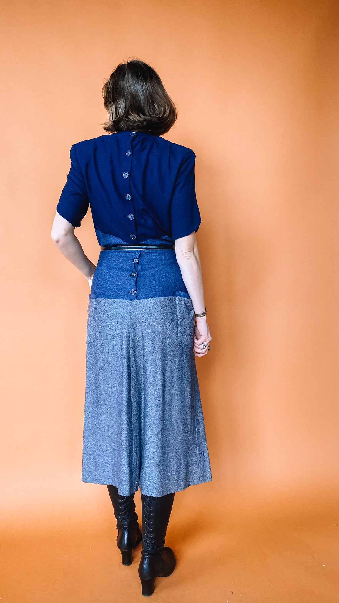 Heavy-material dress in blue and grey. Pockets on the front of the skirt. Buttons up the back. Shoulder pads.
