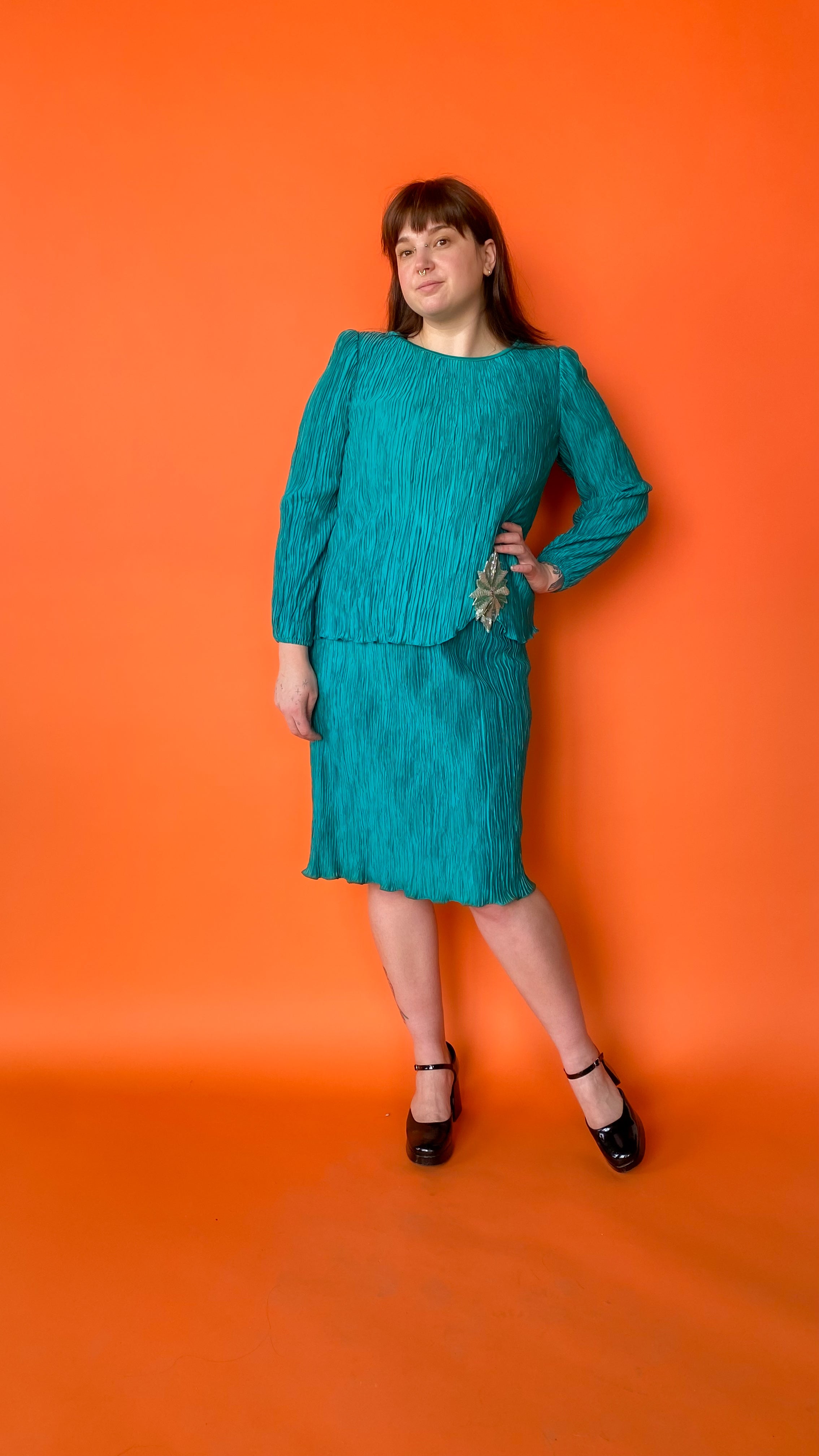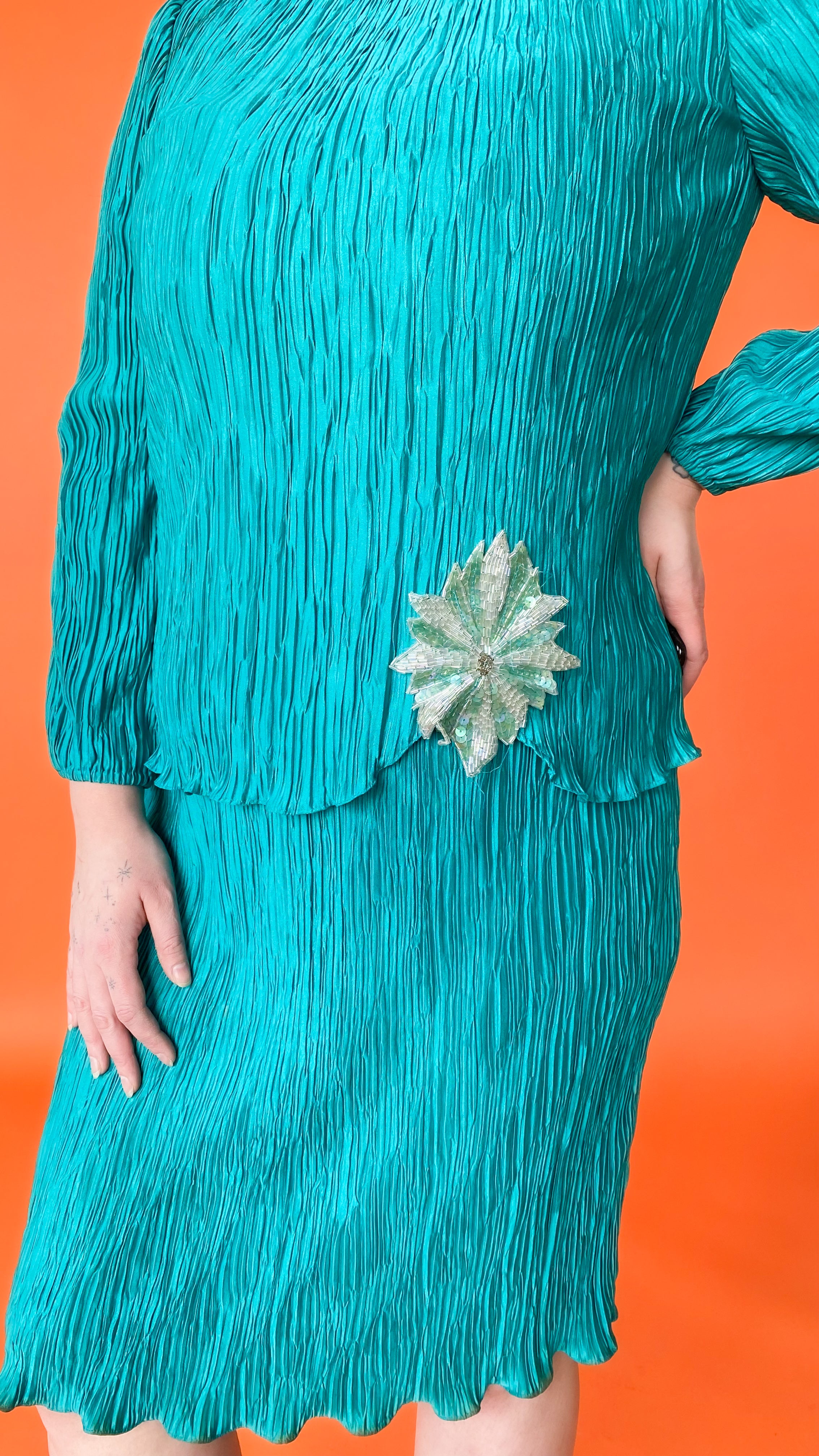 Description: Turquoise, plissé pleated, long sleeve, drop waist, mid-length dress with a beaded flower appliqué on front. Lettuce hem. Shoulder pads.