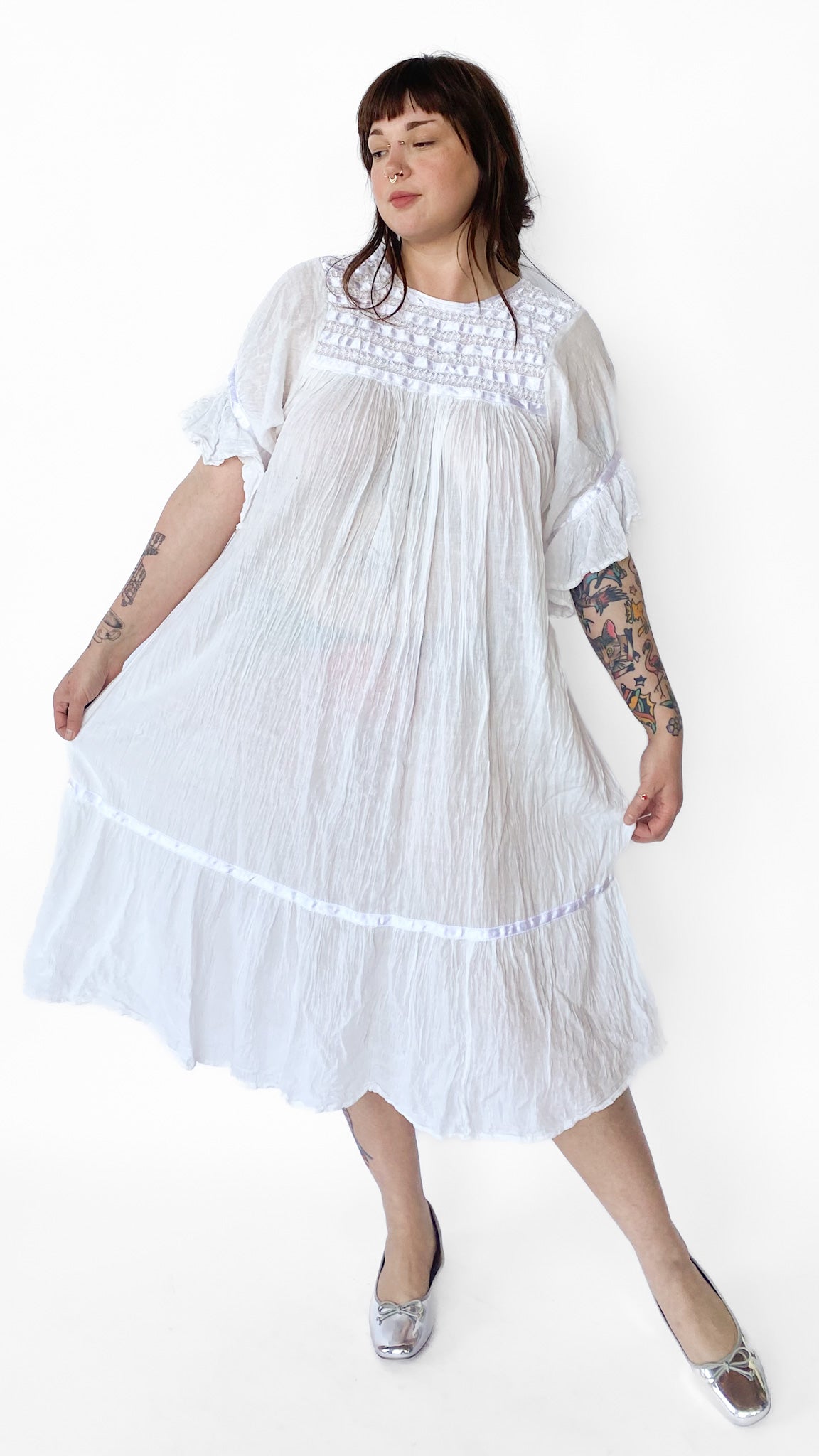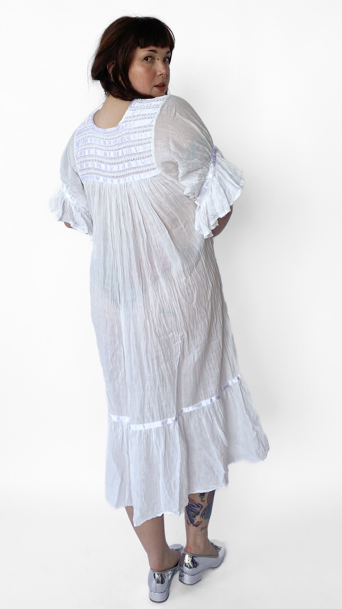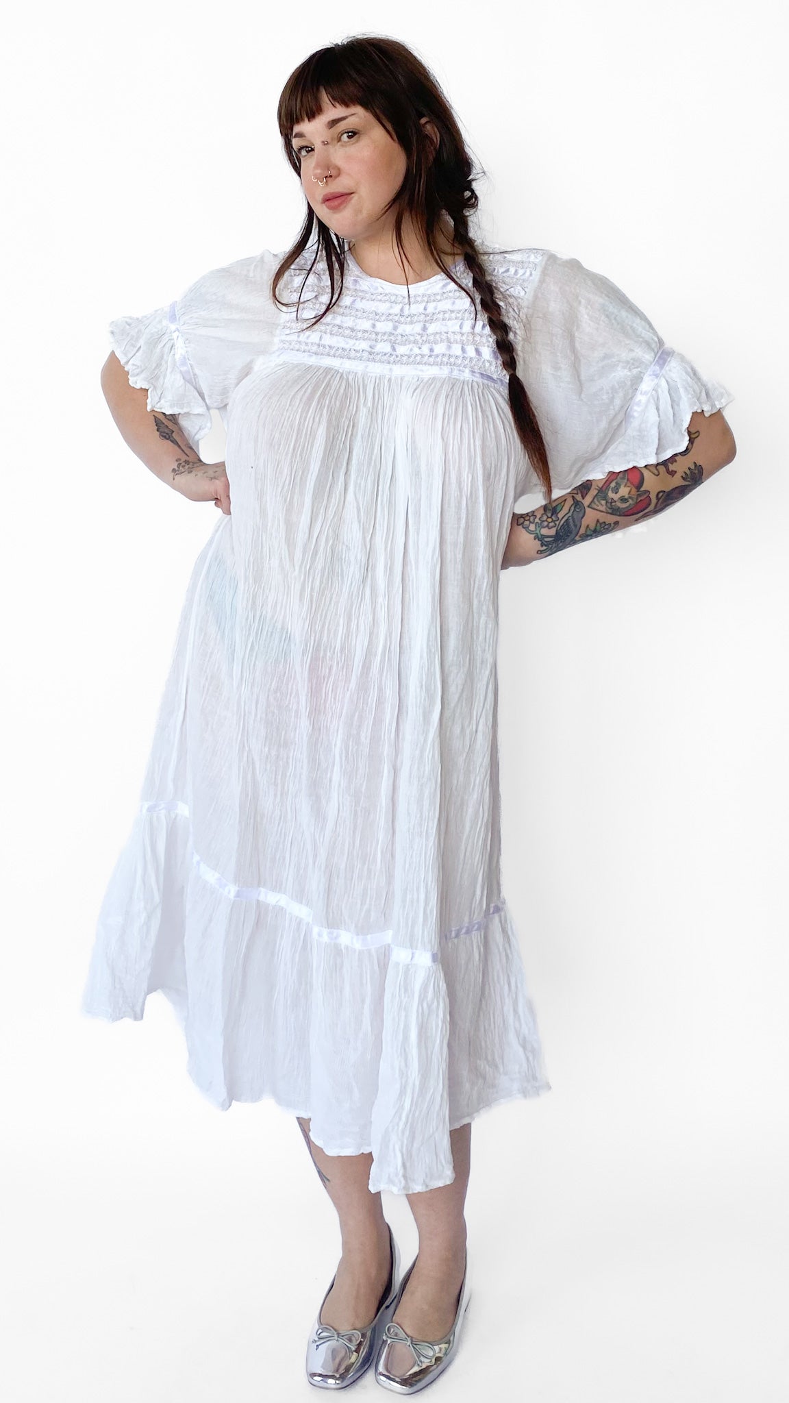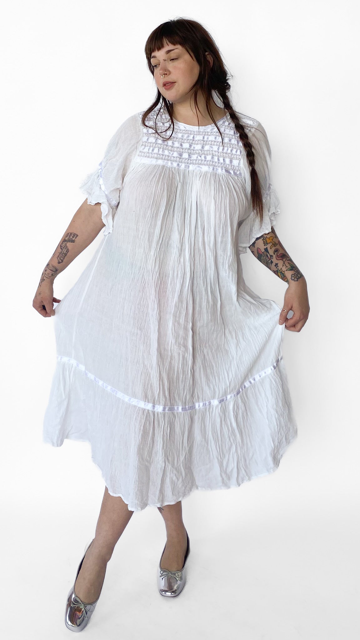 Description: White babydoll style maxi dress with white ribbon details. The flouncy sleeves have ribbon detail near cuff. Bottom of dress near hem also has ribbon detail. Front chest and back of dress has rows of ribbon and twisted cord design. Dress does not have zipper, buttons or elastic.