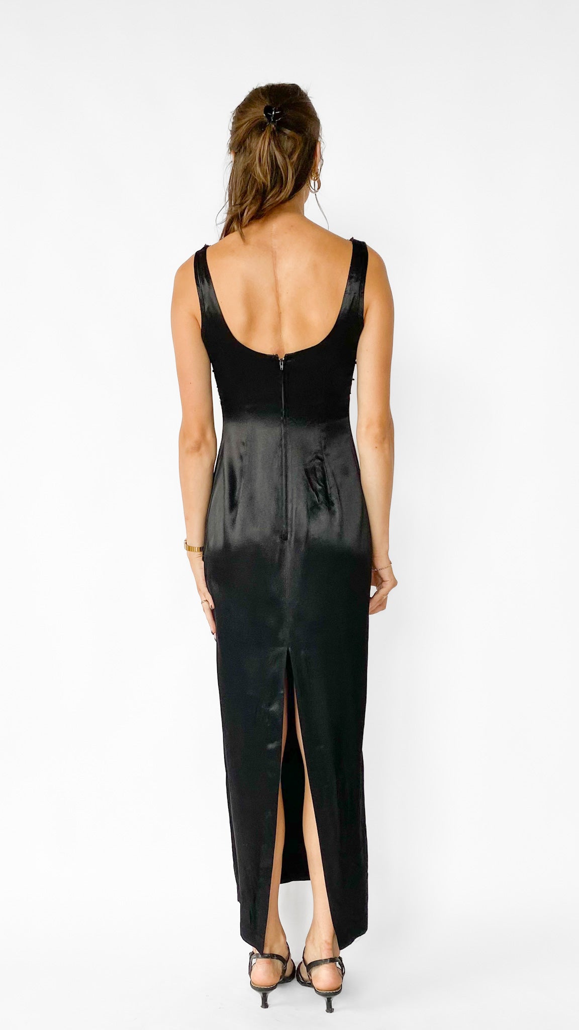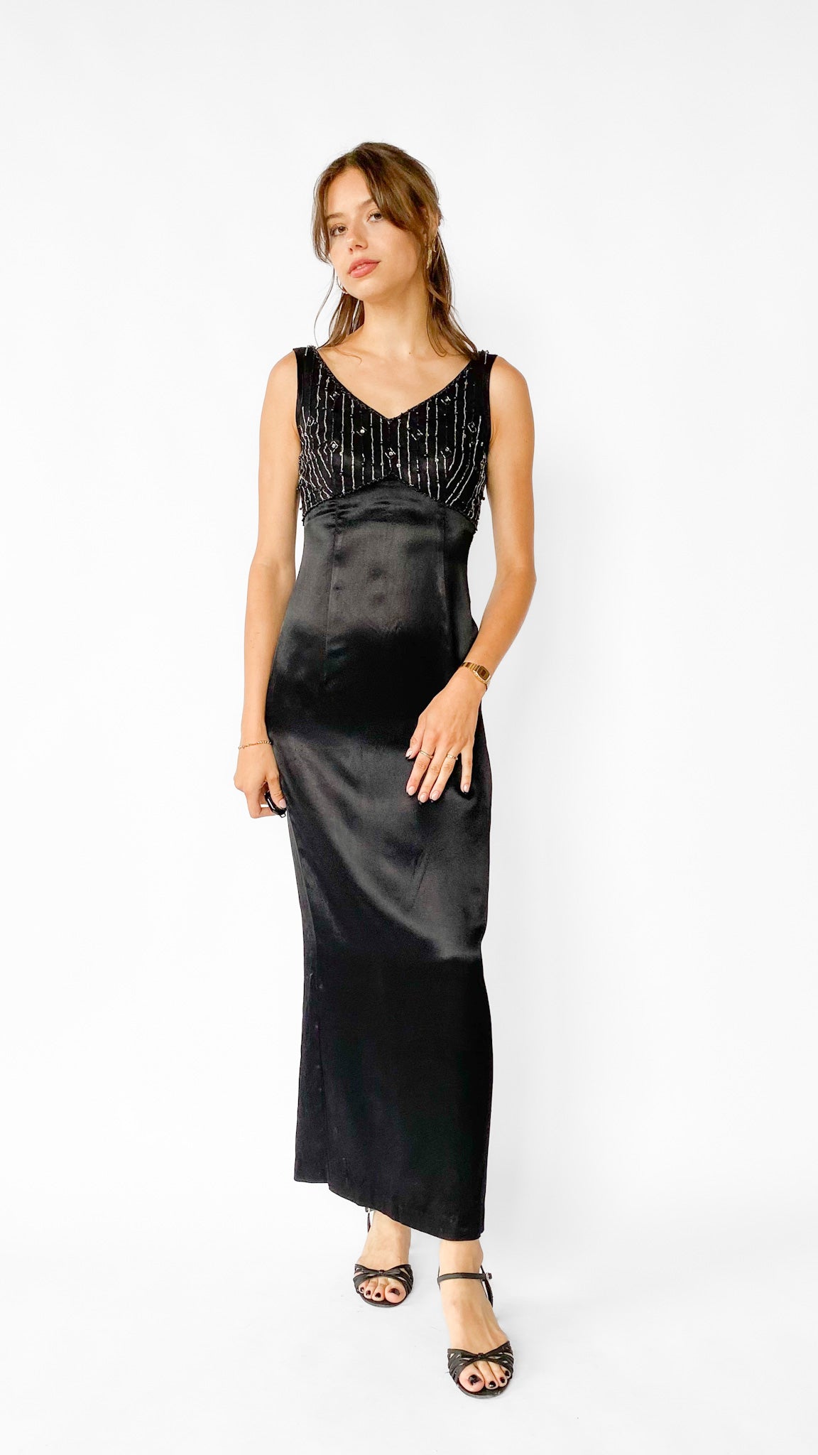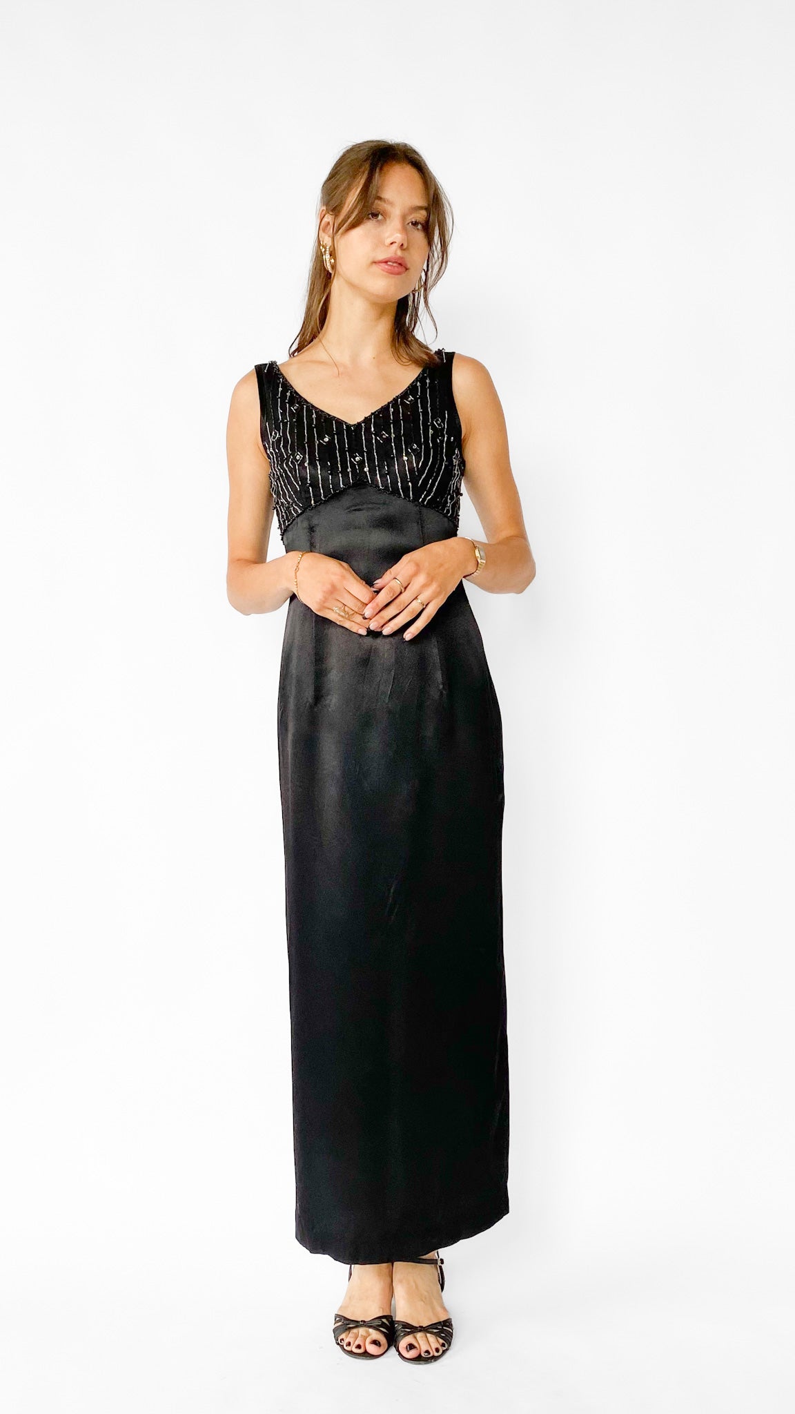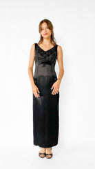 Sleeveless black full length shift dress with mesh and beaded empire bodice with 24" slit in the center back seam.