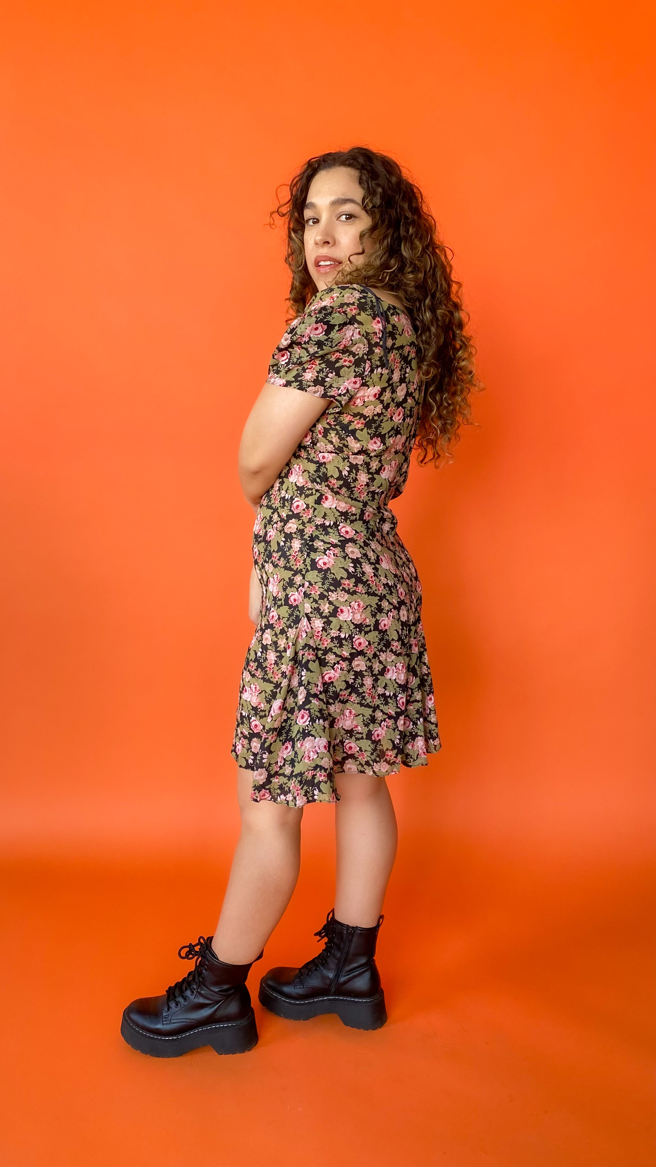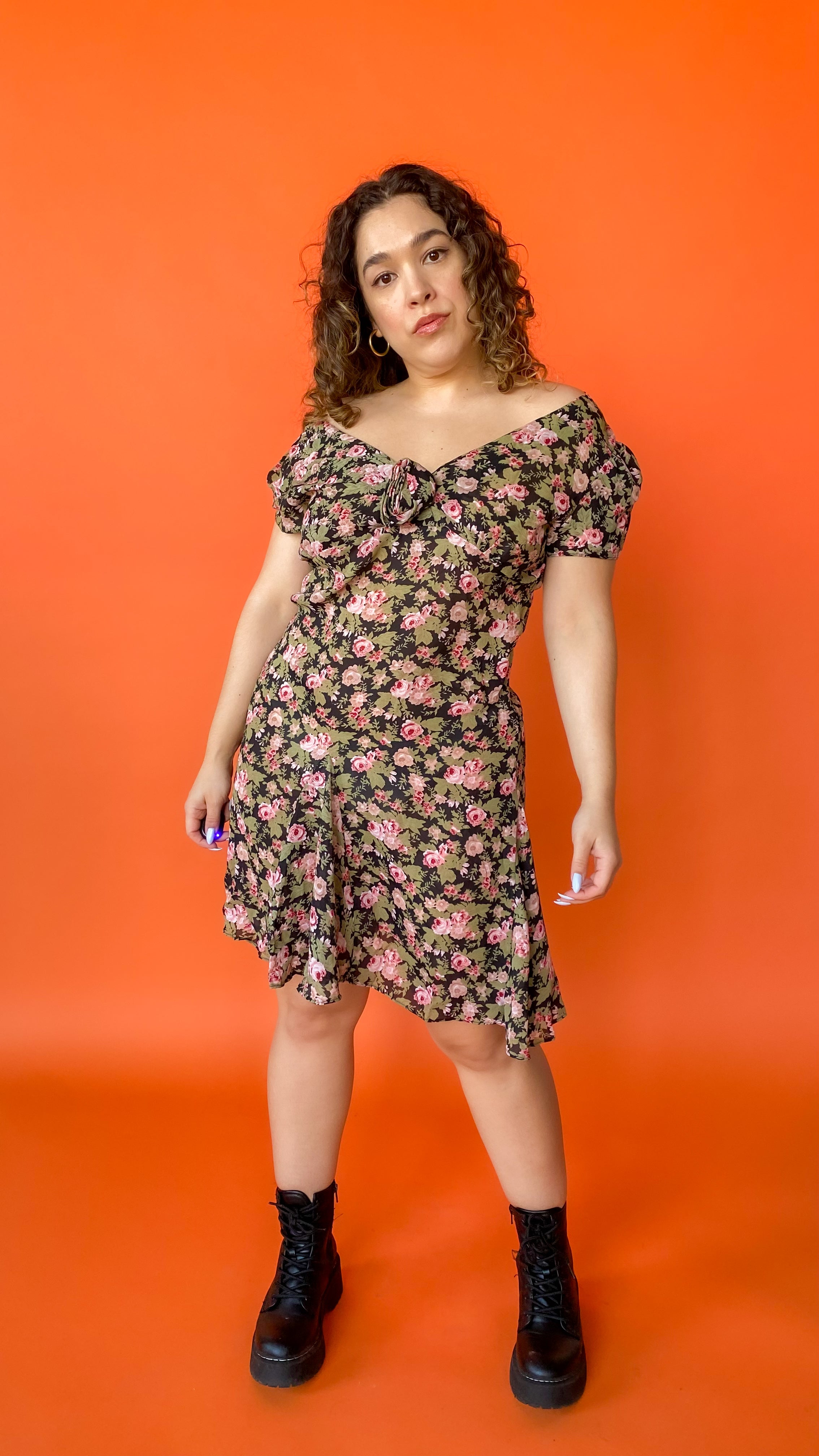 Description: 90s semi-sheer knee length dress that is covered in a rose print. There is a rosette appliqué attached to the front bust. There is a zipper closure up the back. This is a short sleeved piece with more of a ruffled cap sleeve.