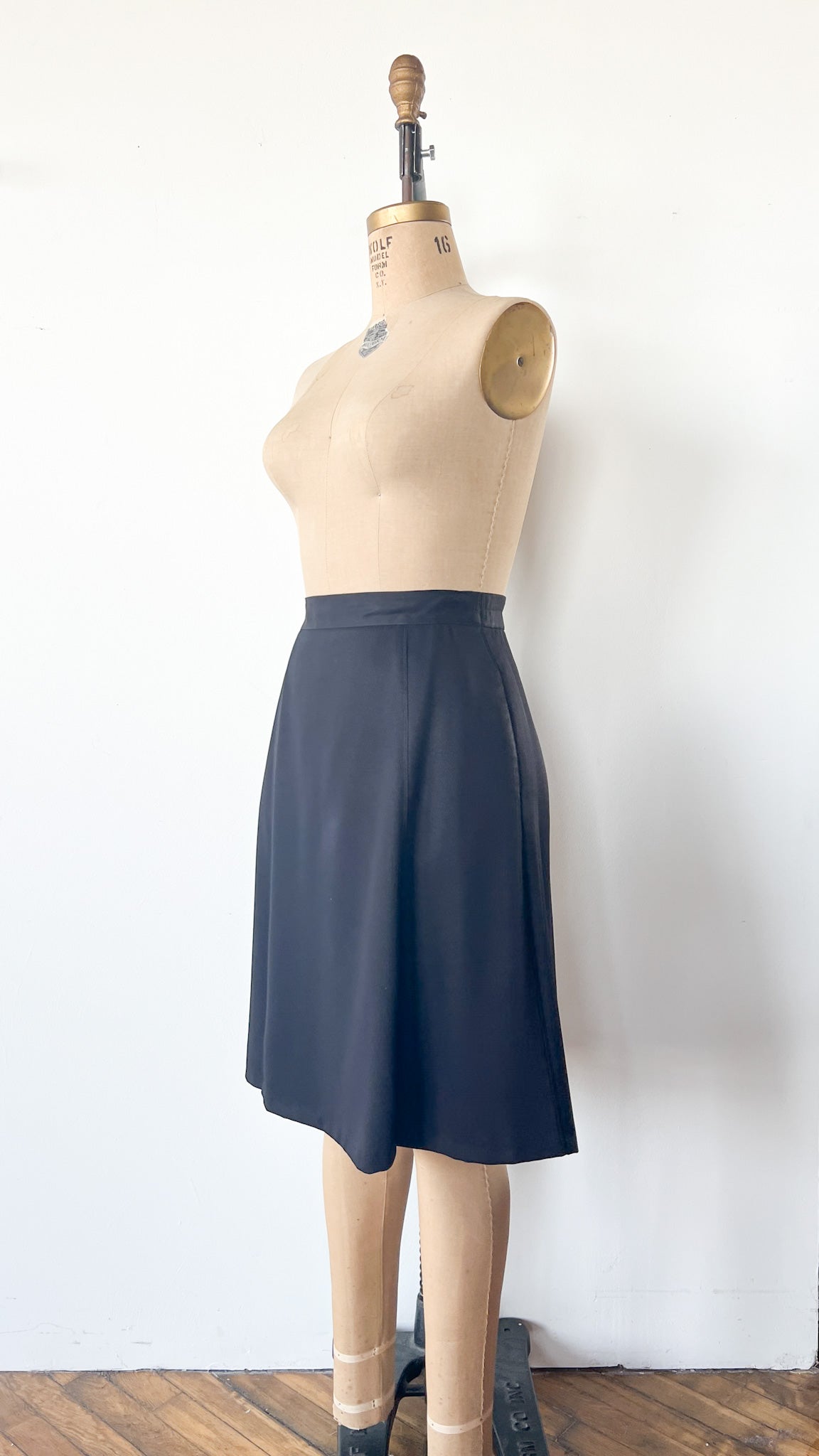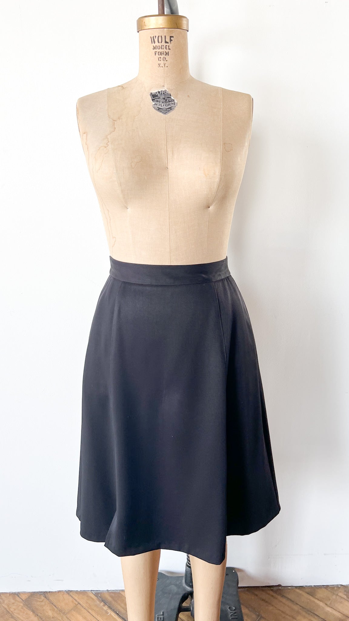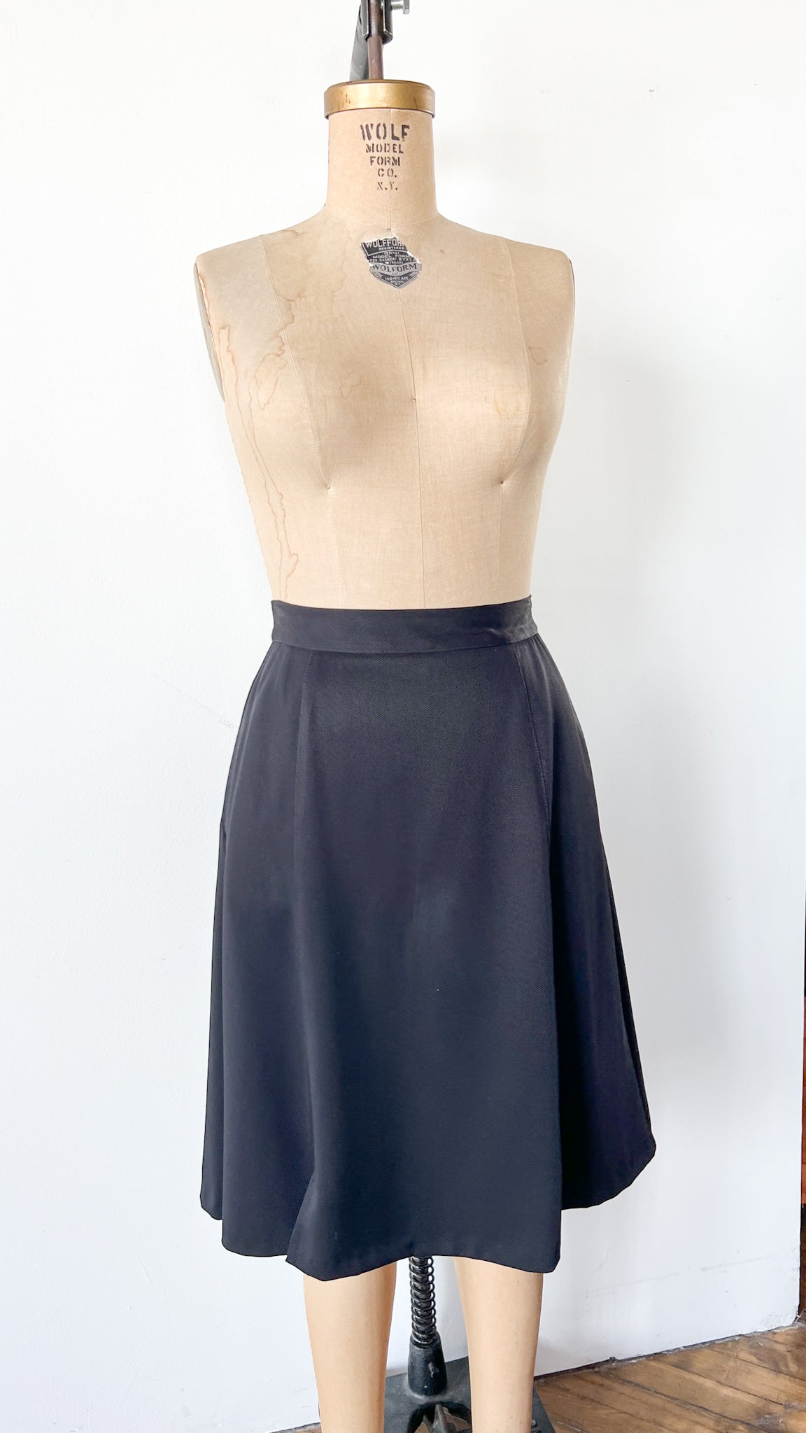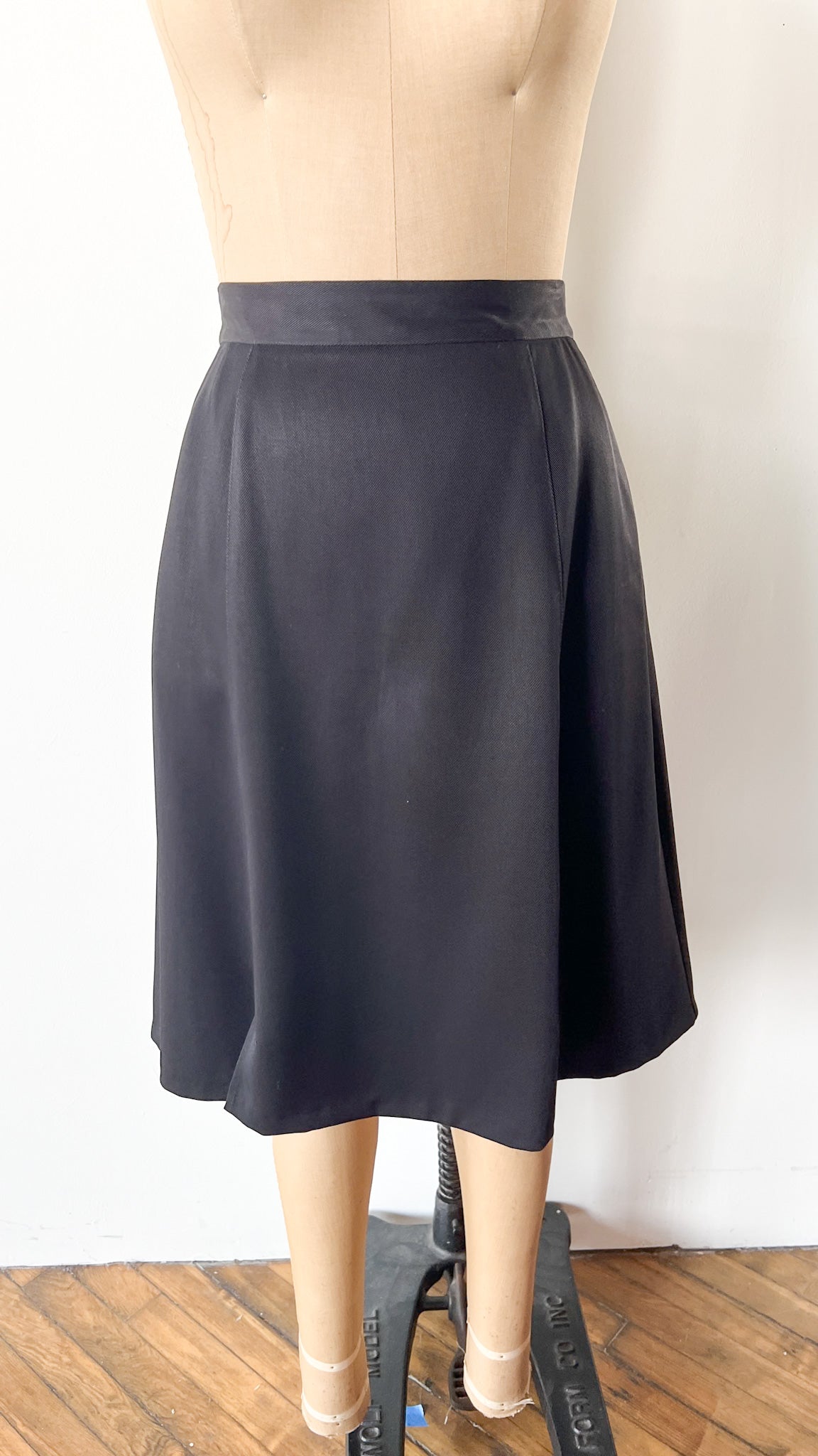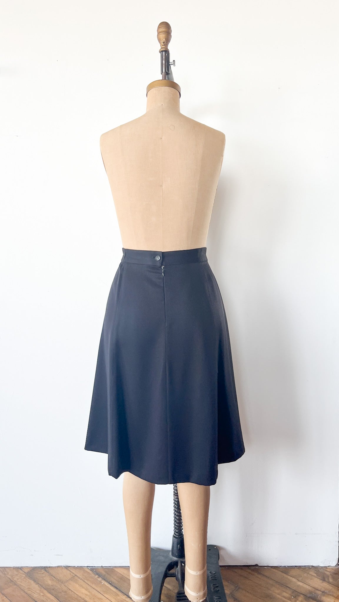 Description: Black A-line skirt with hidden side pockets. Invisible zipper and button closure in the back.