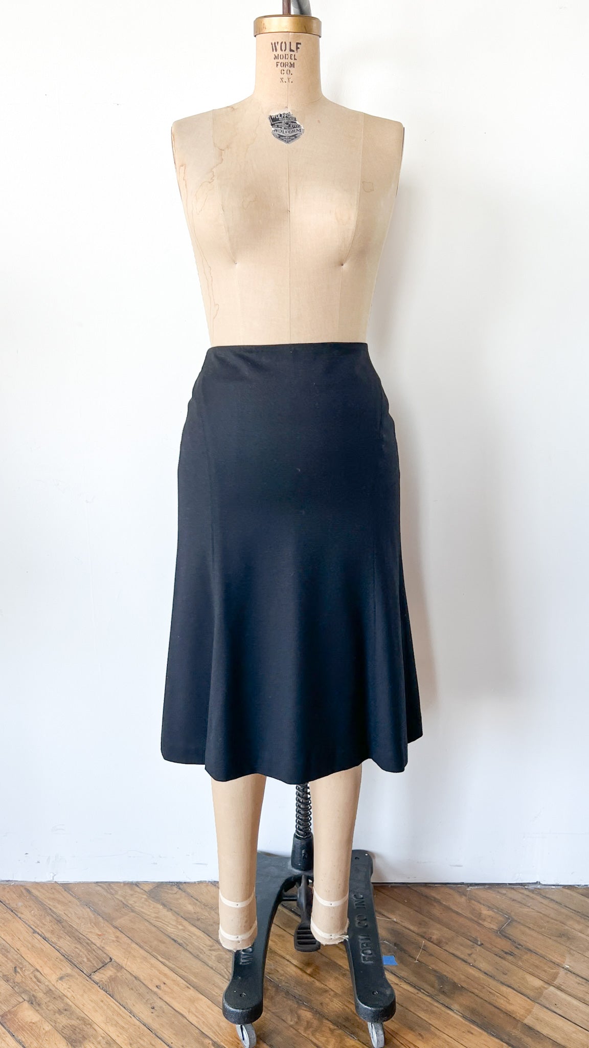 Description: Black fit and flair pencil skirt with princess seams. Invisible zipper in the center back.