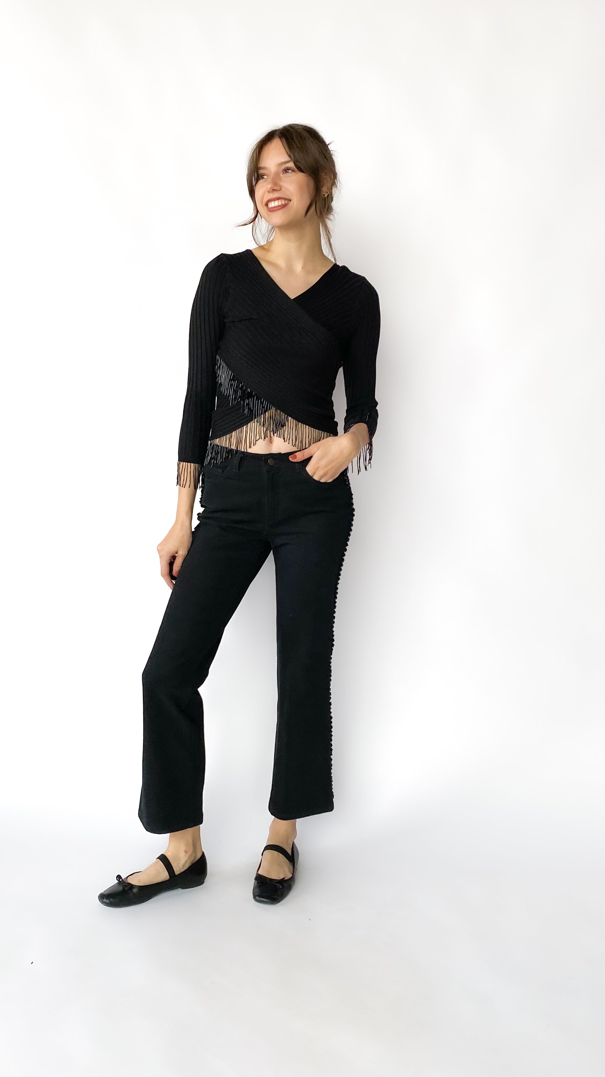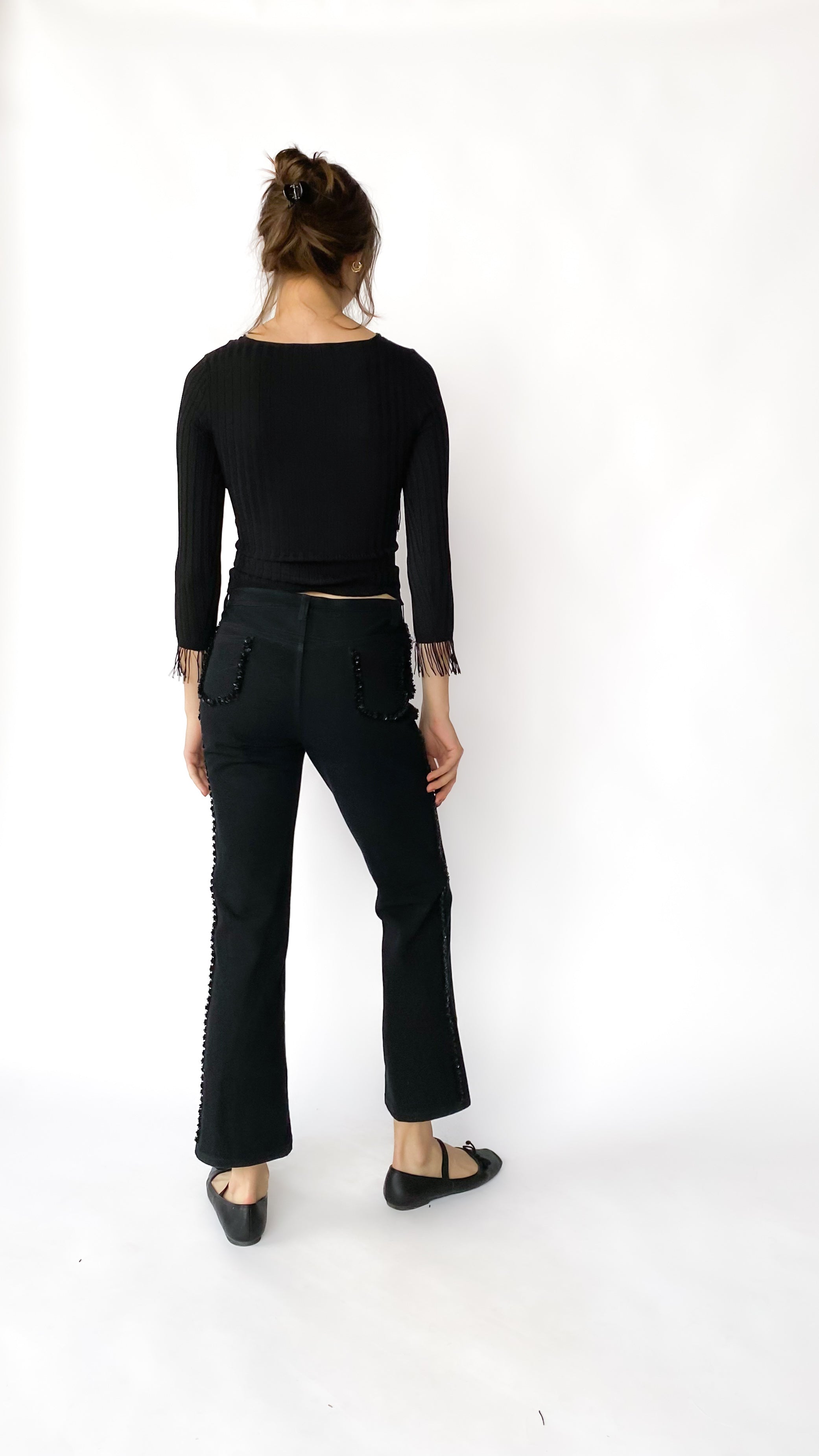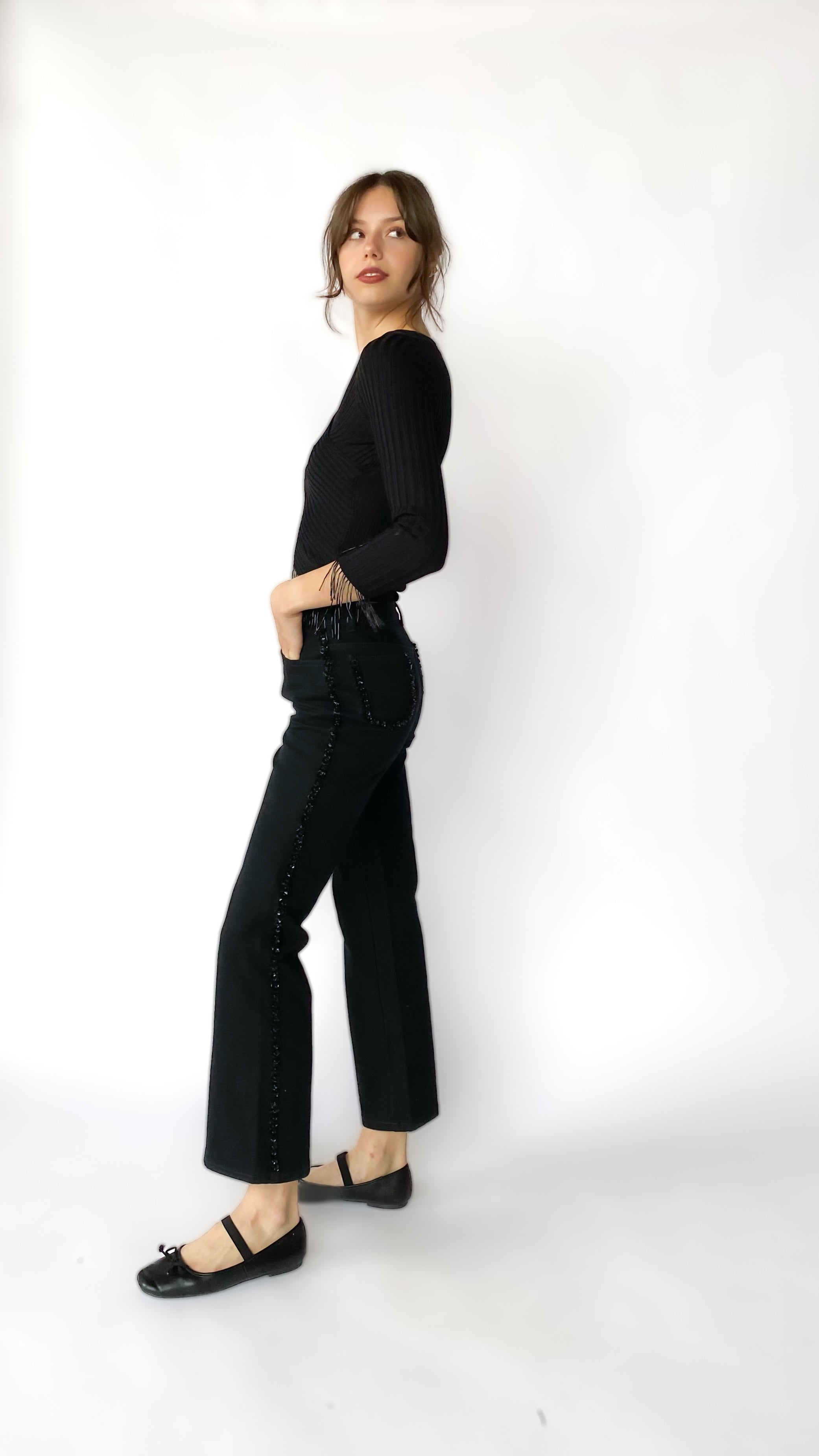Black high waisted bootcut jeans with sequin flower tuxedo stripe. Sequin flower trim around back pockets as well.