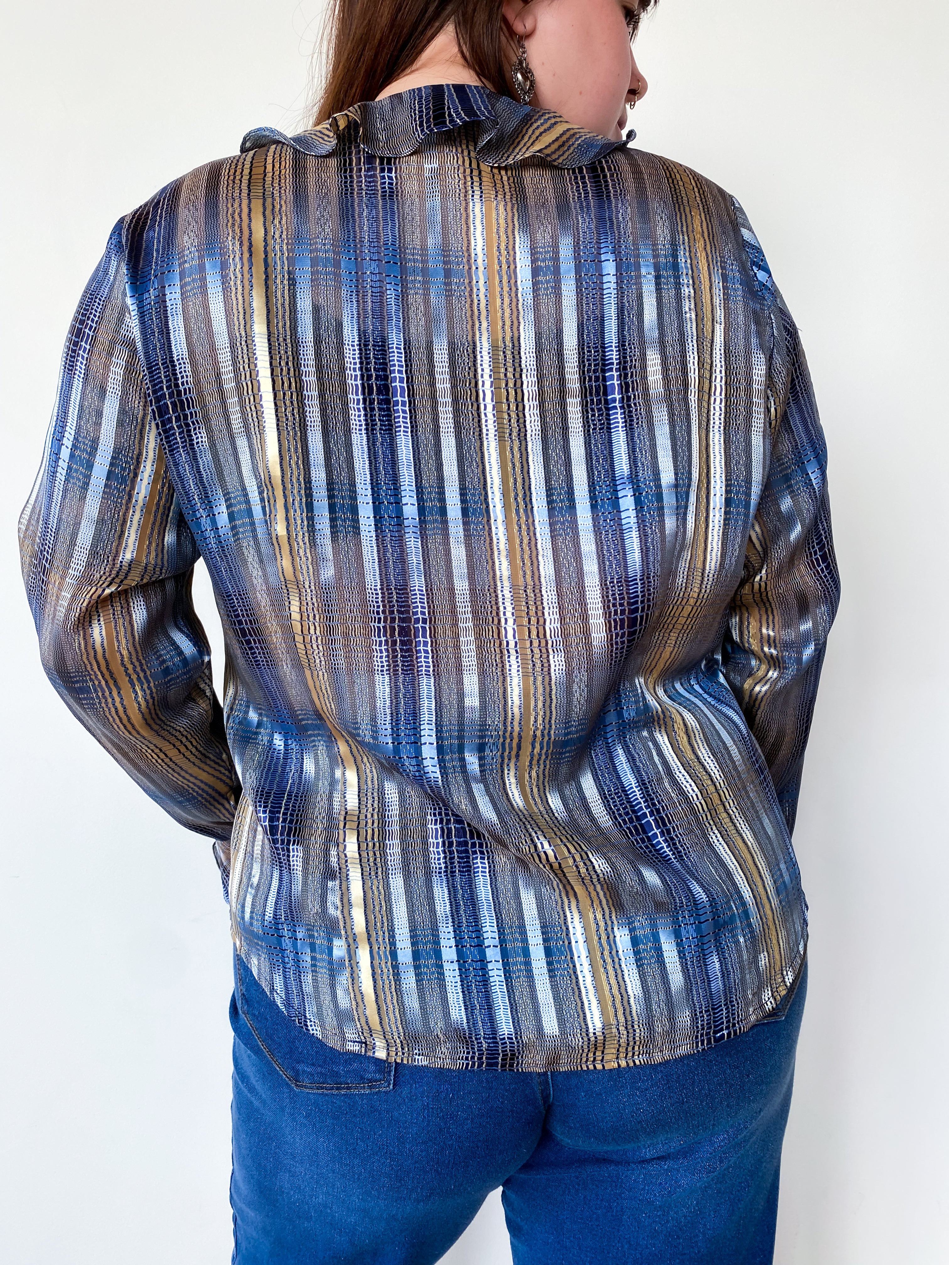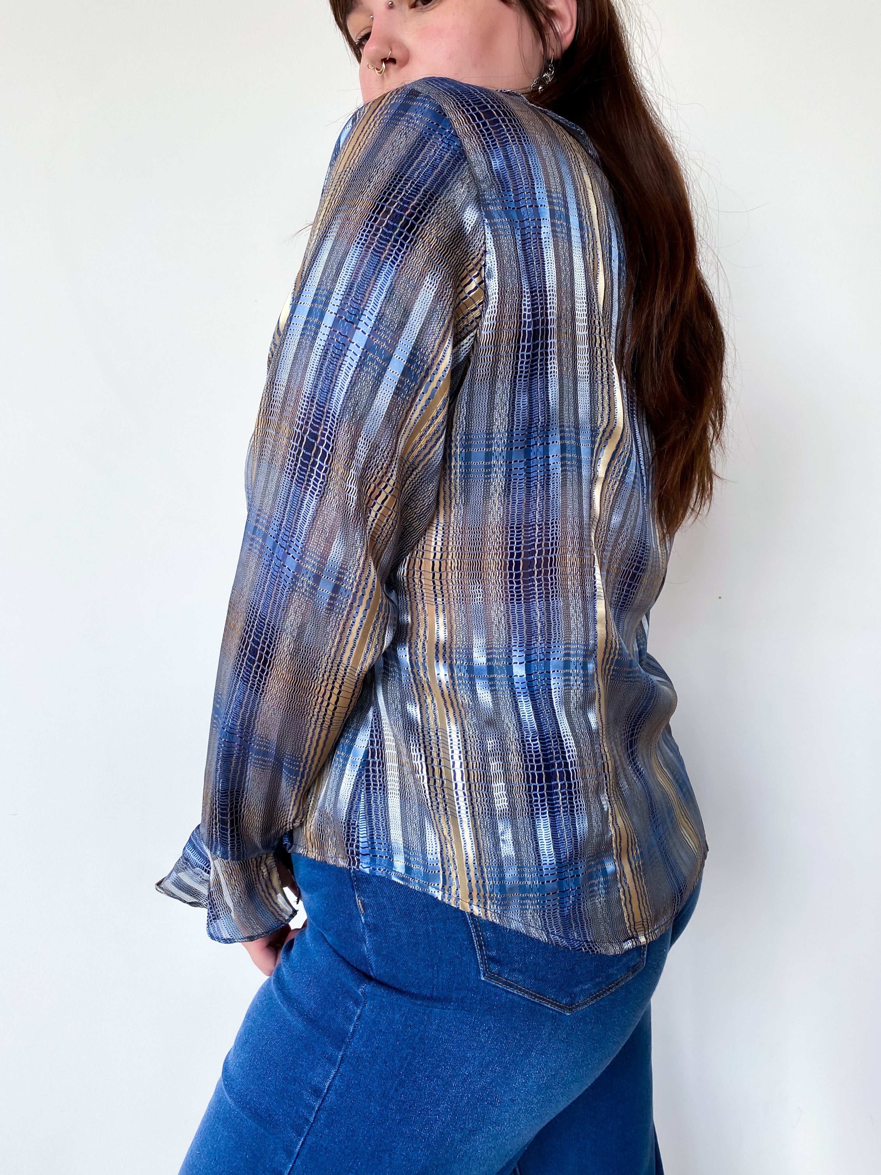 Sheer blue and gold plaid button down top with flouncy collar and cuffs. Button closure down the front.