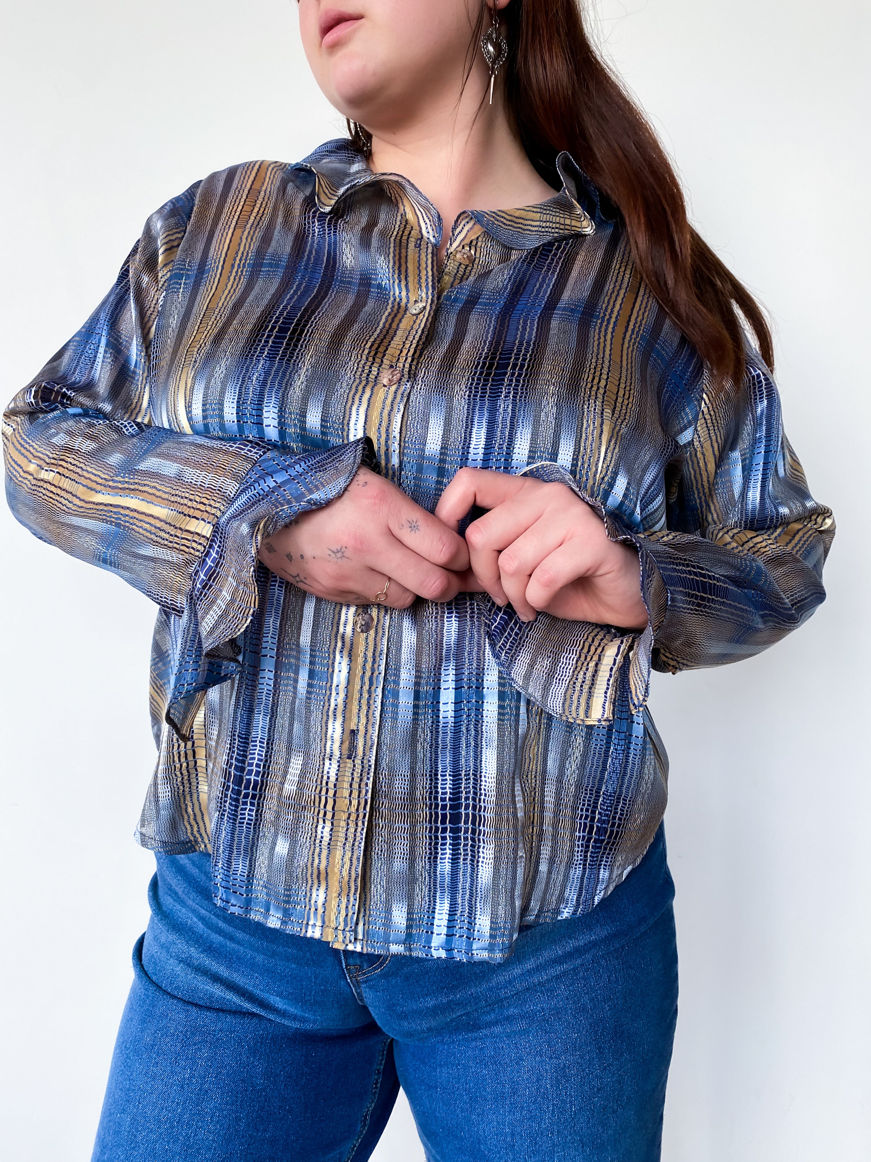 Y2K Blue and Gold Plaid Button Down, sz. 2XL