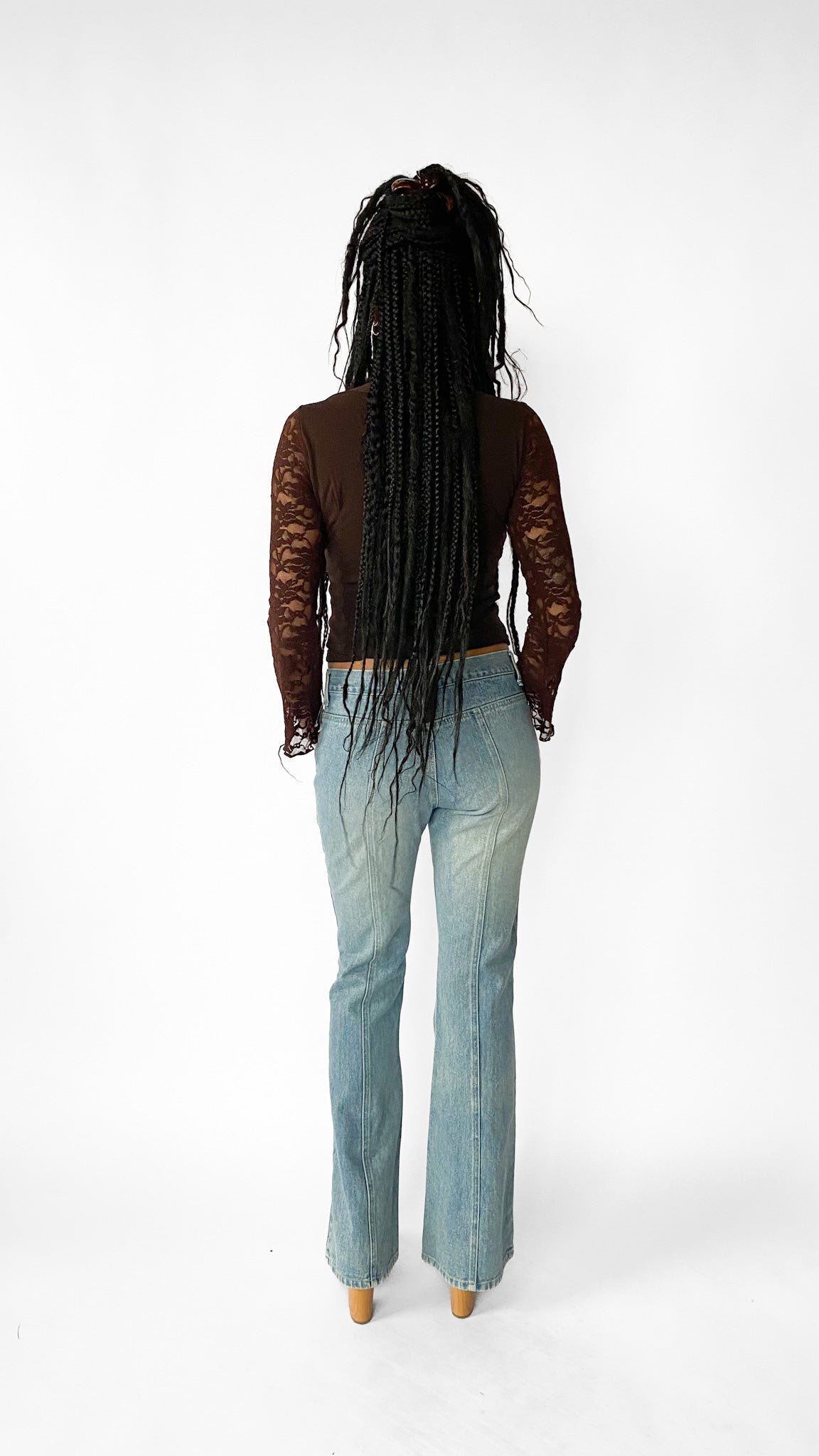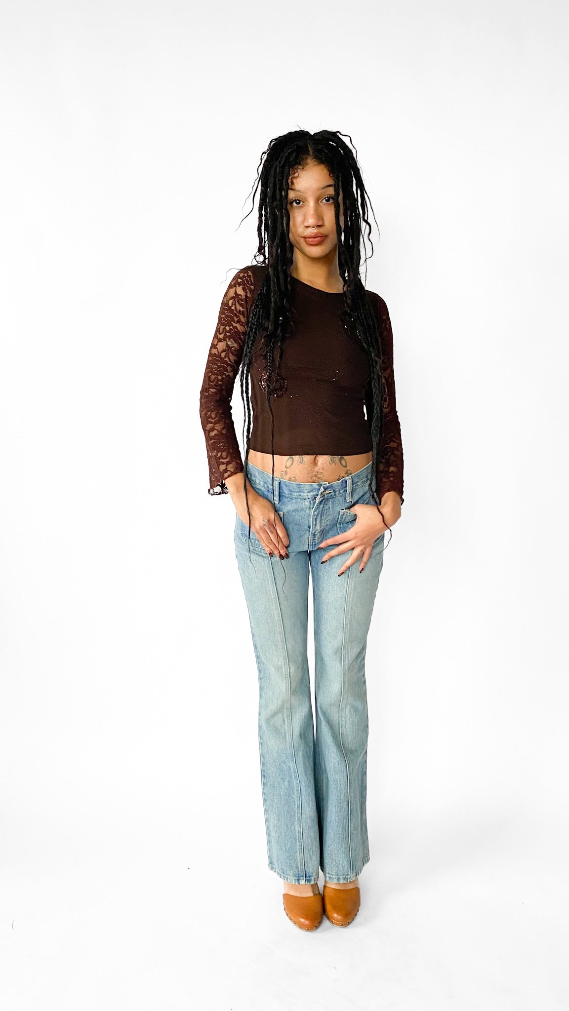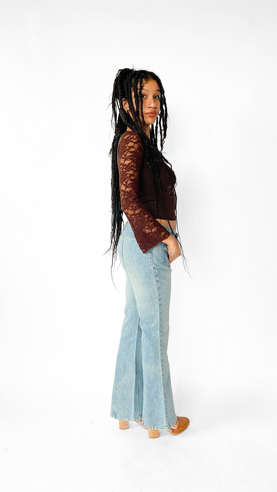 Description: Light wash low rise flare bottom denim jeans with front pockets.