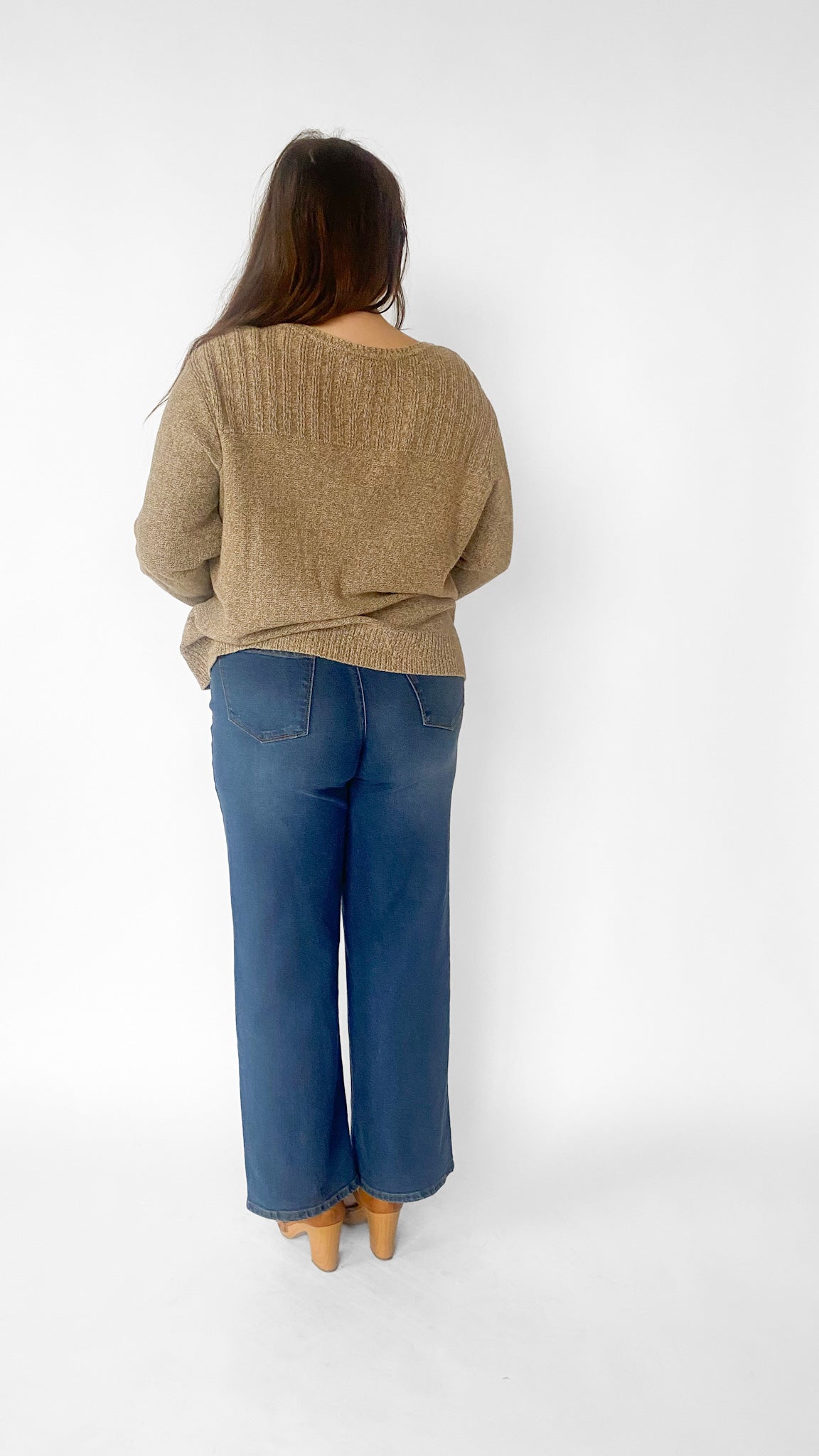 Long sleeve dark tan and beige knit sweater with 3/4 button up v-neck. Ribbed hemline and wrists.