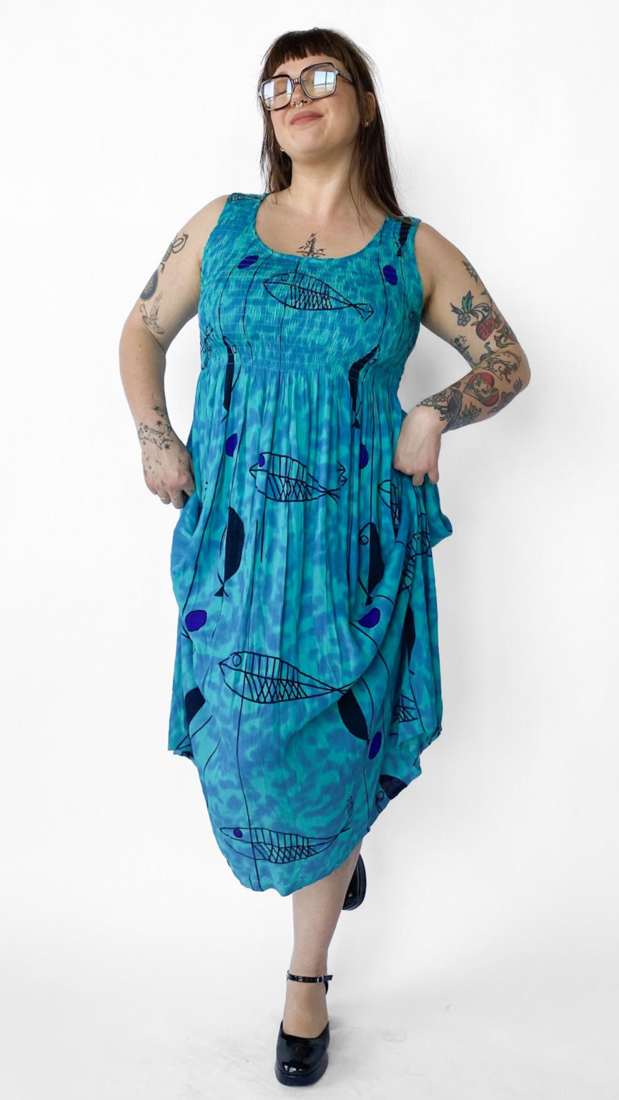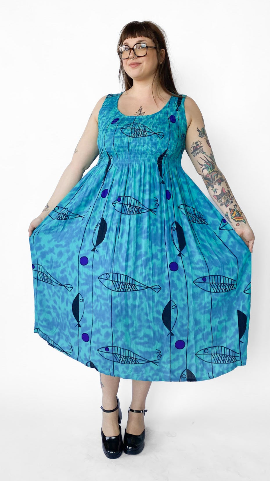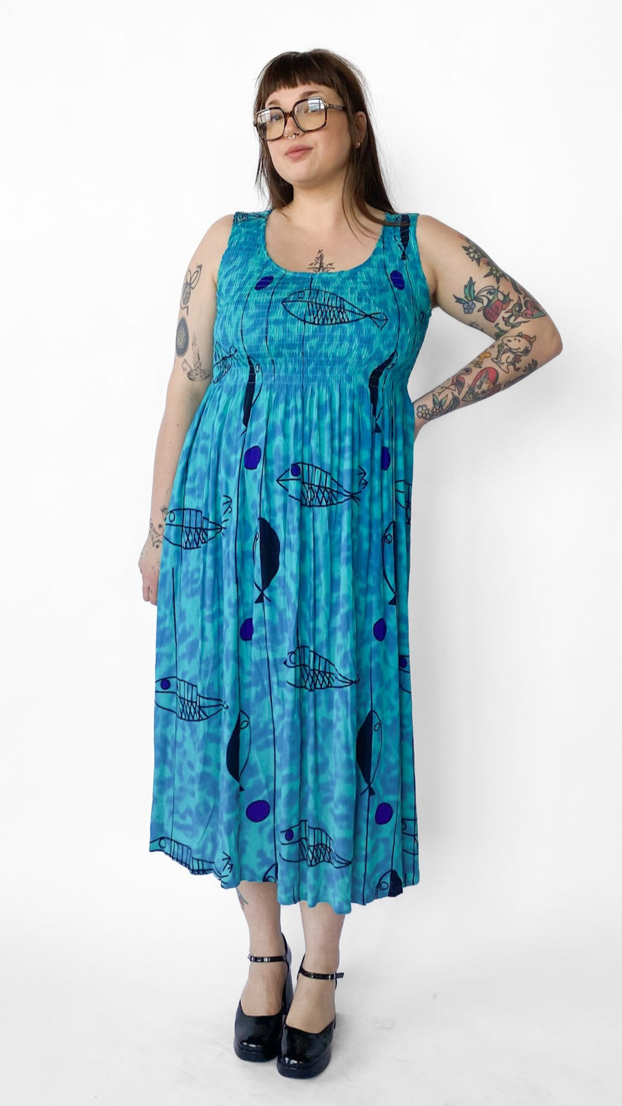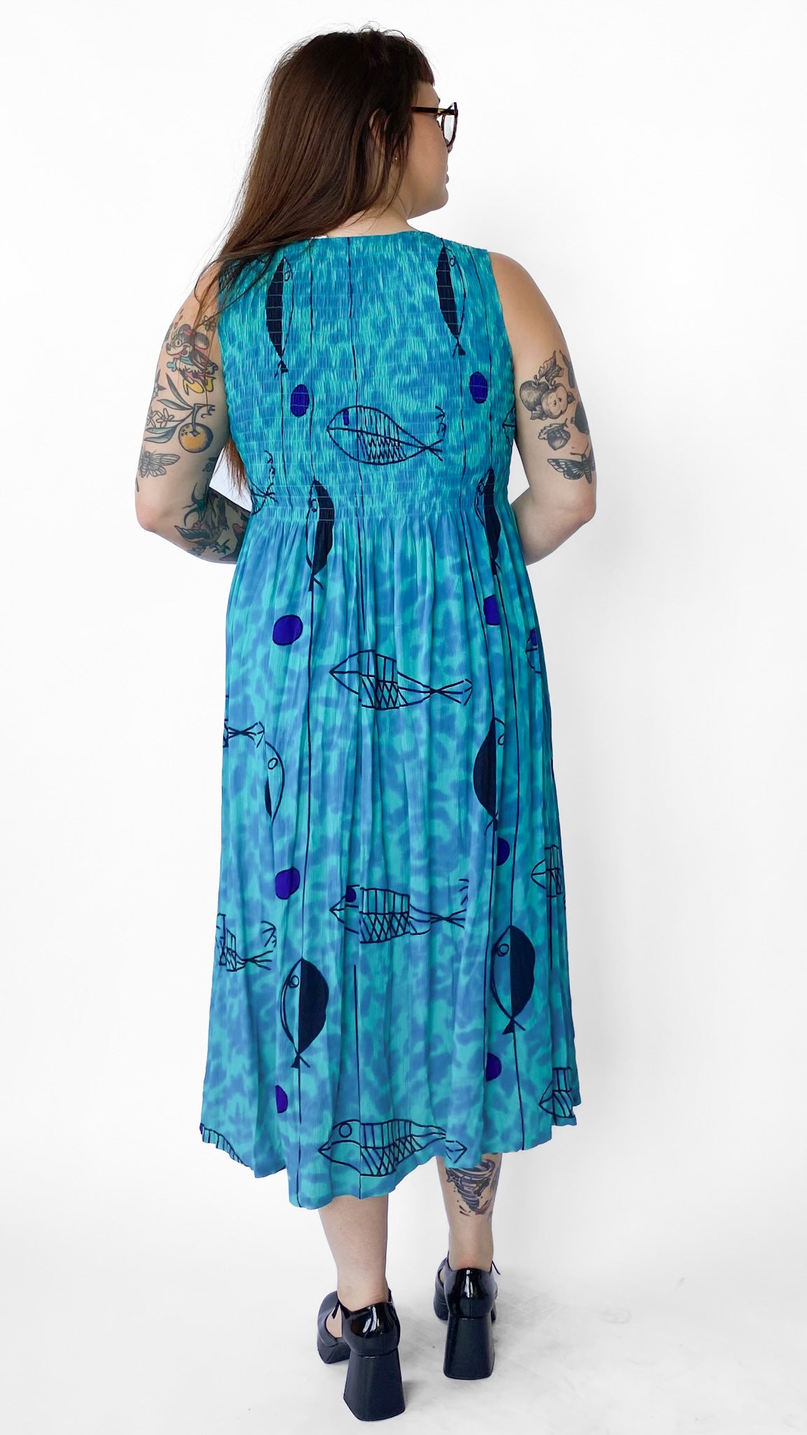 Sleeveless teal/green tie-dye patterned dress with abstract line fish designs. Top of dress is stretchy.