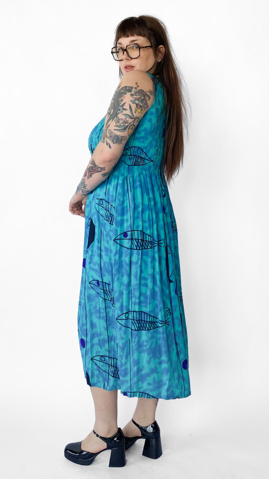 Y2K Teal Fish Print Maxi Dress, sz. 2XL