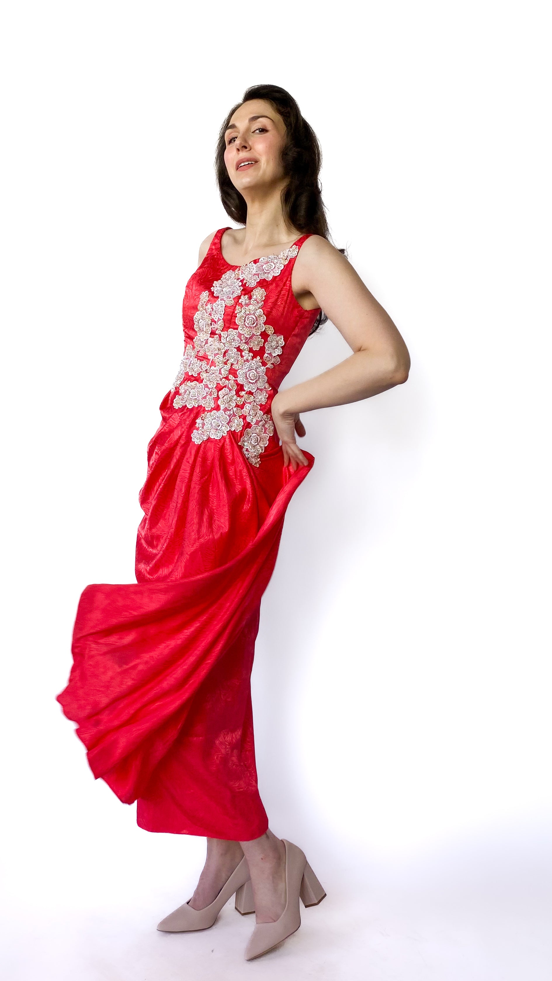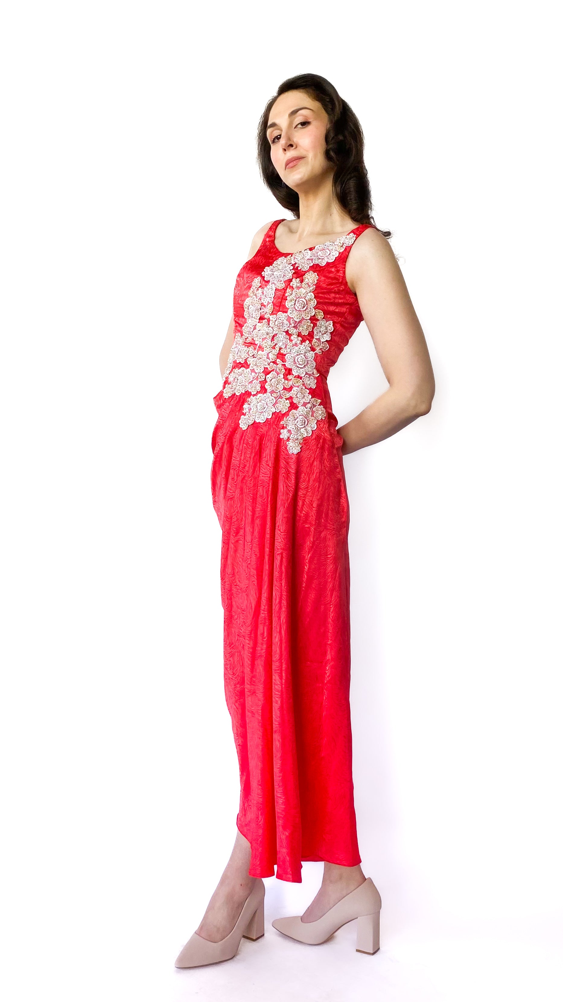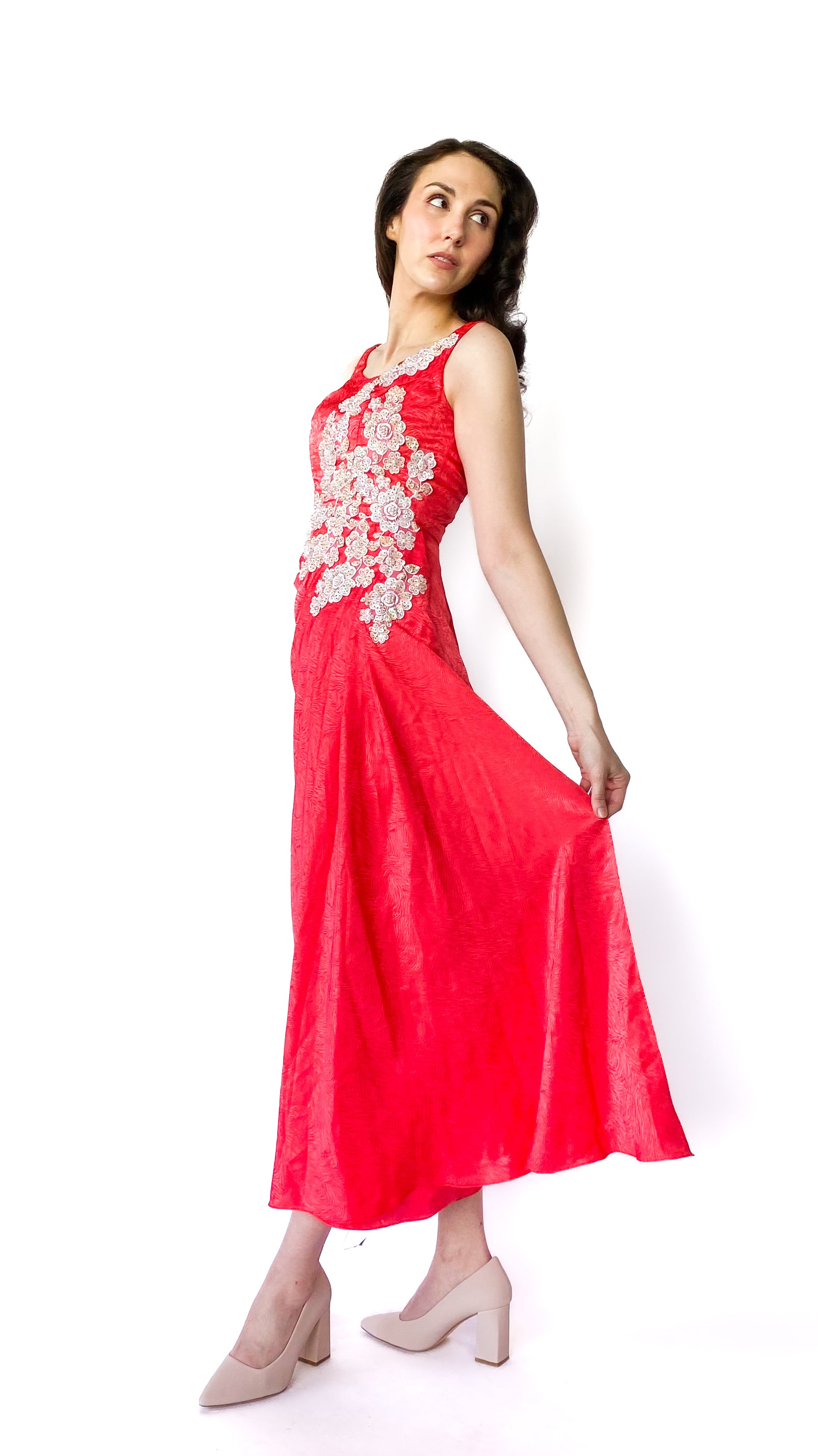 1950s Red Orange Ruffle Lace Party Dress, sz. S